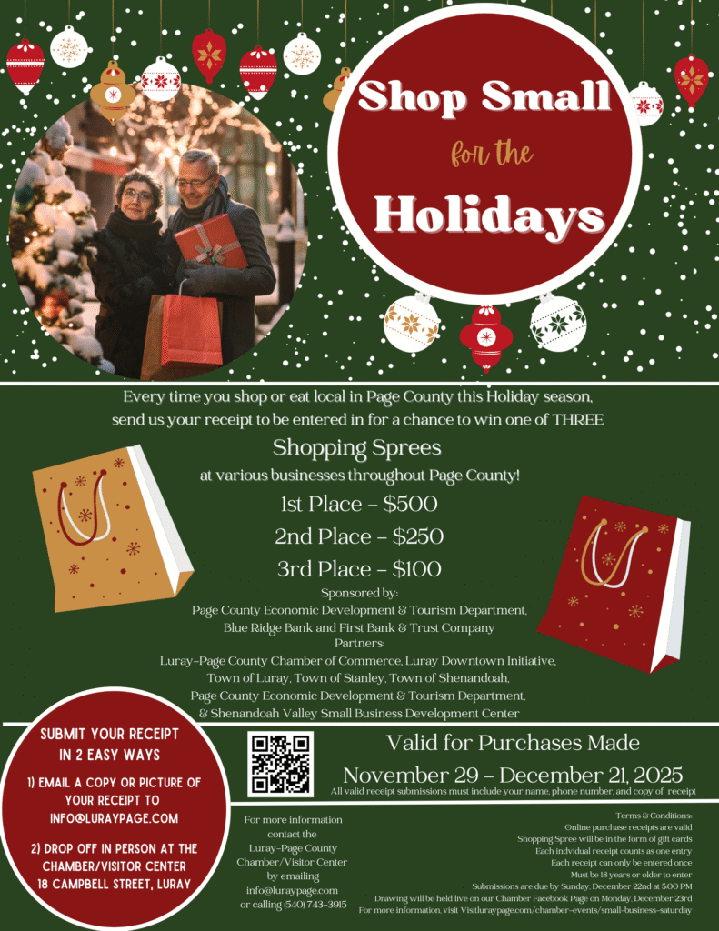 The excitement continues throughout Page County with the Shop Small for the Holidays campaign, running November 29 through December 21. Shoppers are encouraged to visit local boutiques, restaurants, and specialty shops to discover thoughtful gifts while supporting the community. Even better—every purchase counts as an entry to win a holiday shopping spree.