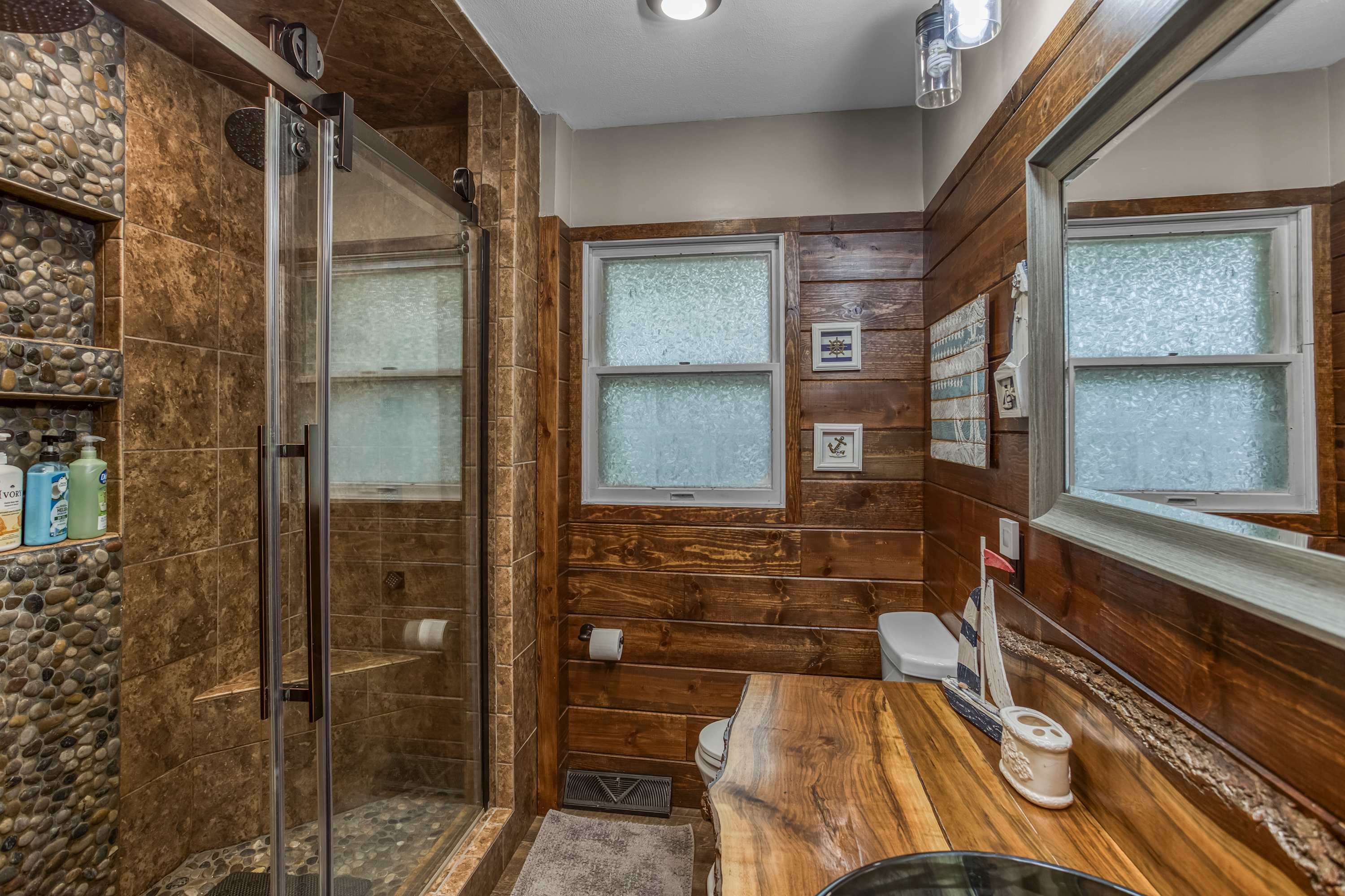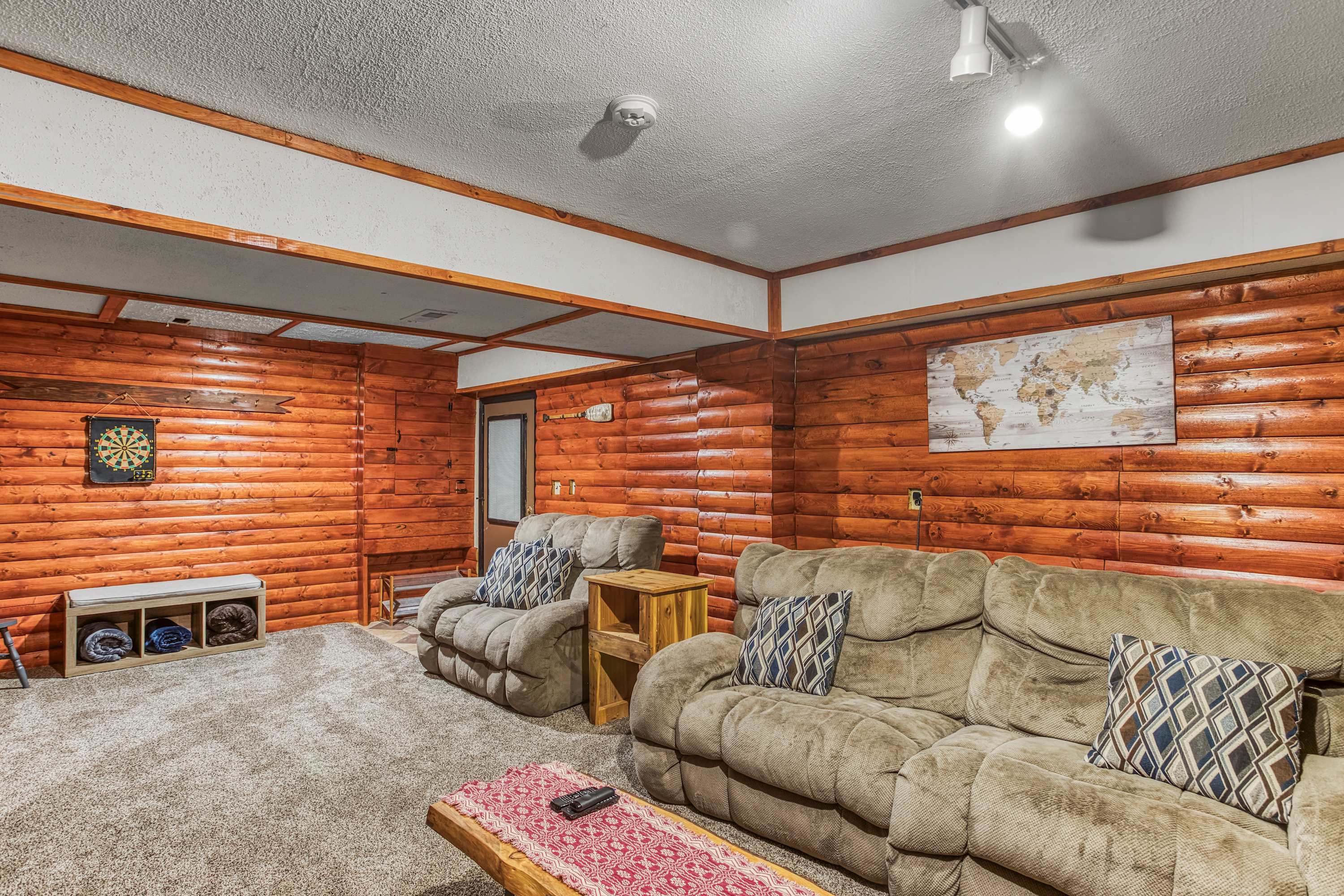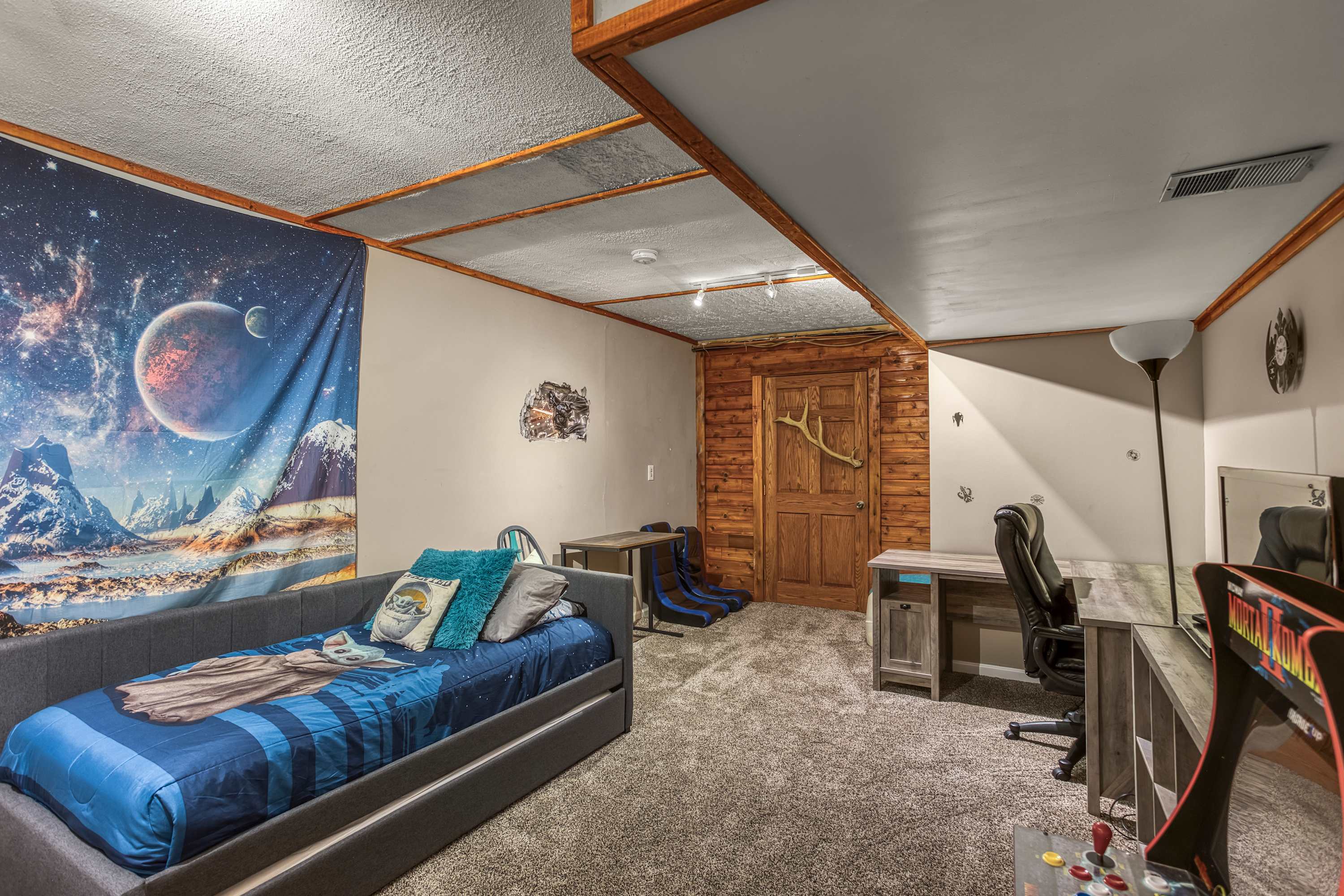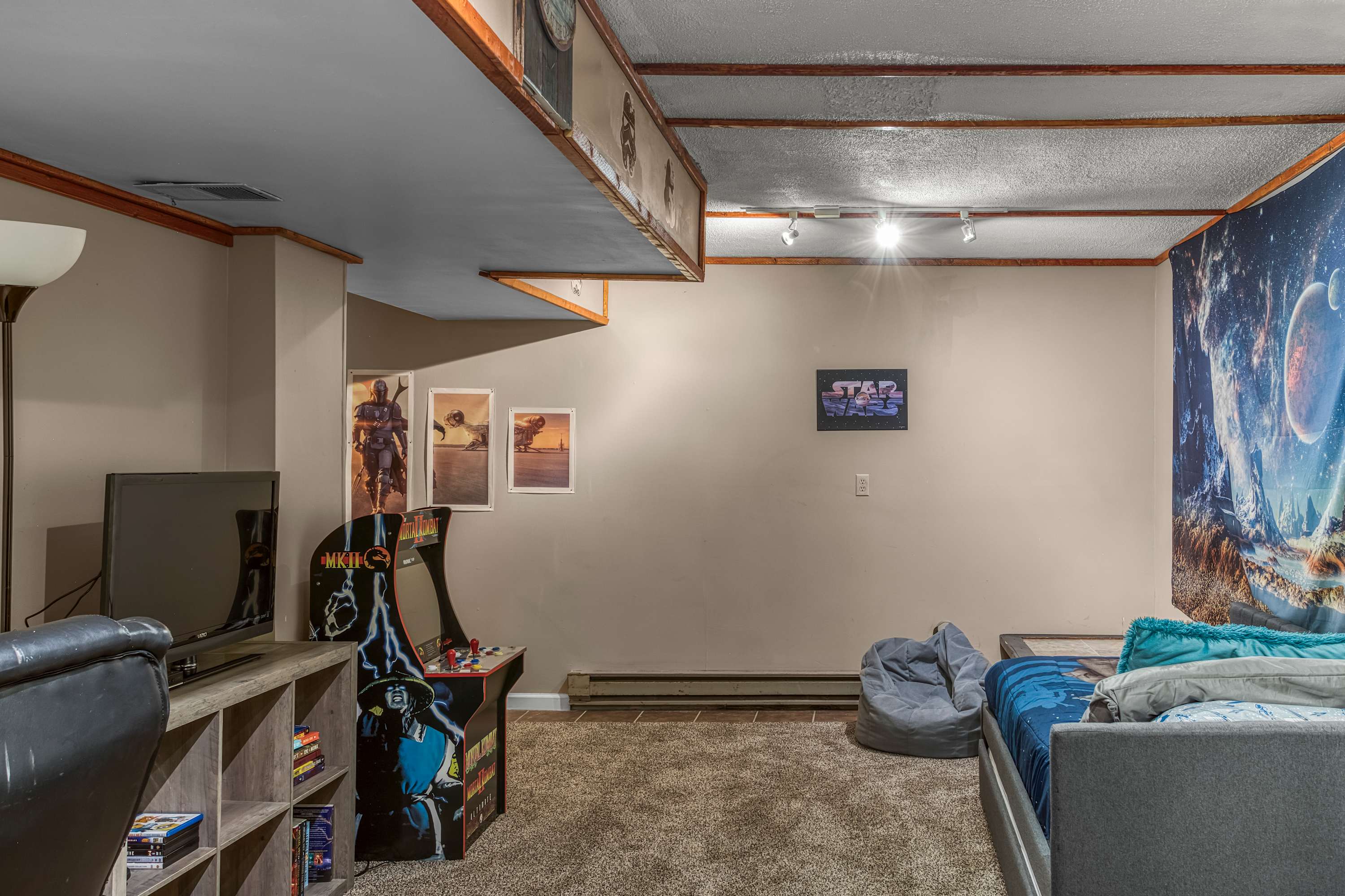 Inside, you’ll find an open layout with tall ceilings, a fully equipped kitchen with a large island that makes cooking and gathering a breeze, and a cozy living area with Roku TV for streaming your favorites. Multiple hangout spaces throughout the home include a lower-level living room, an arcade and game room for endless entertainment, and a Bluetooth jukebox on the main floor. A dedicated desk downstairs makes it easy to blend work and play, and the home is stocked with board games for everyone to enjoy.