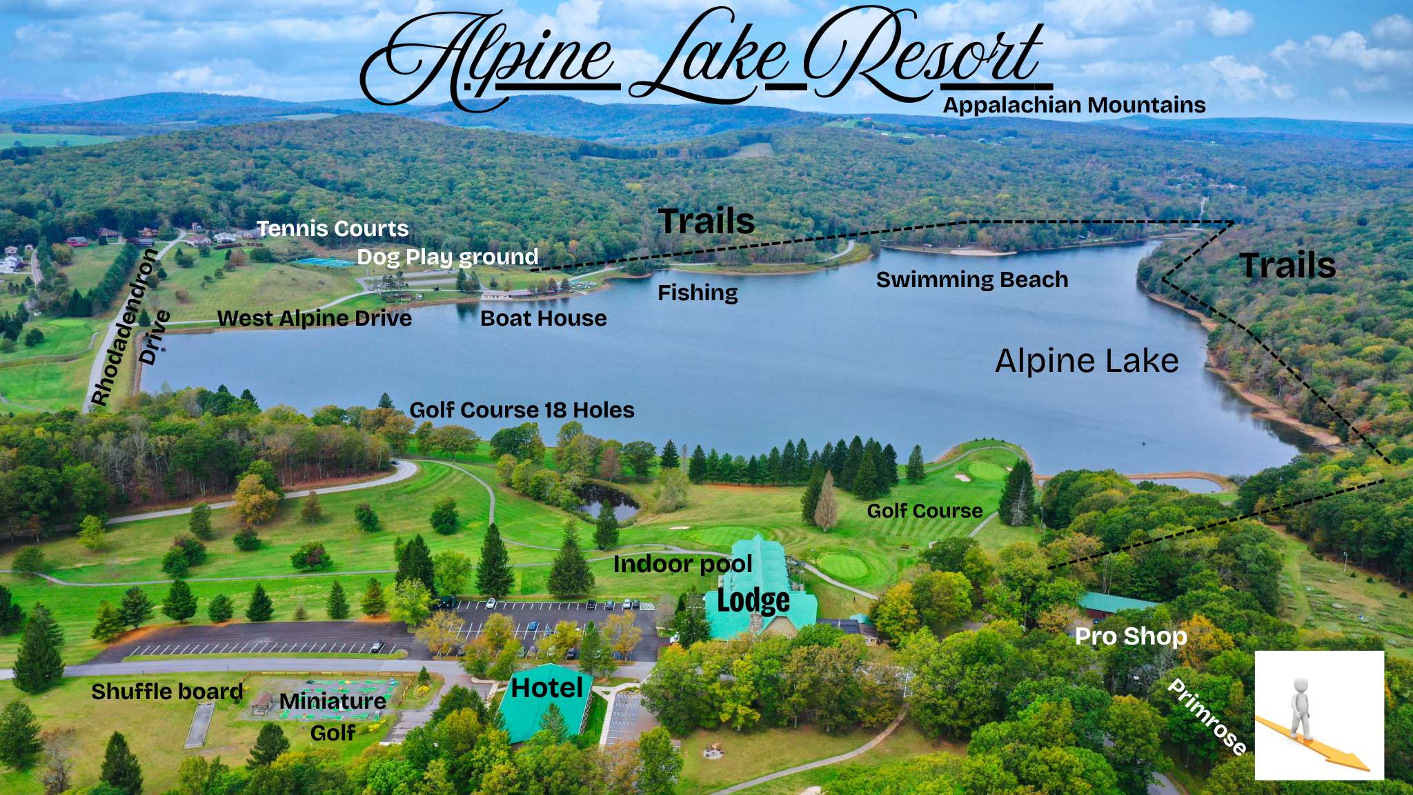 - Alpine Lake Resort, you’ll have access to a wide range of amenities including an 18-hole golf course and driving range, a 150-acre lake with beach and fishing, an indoor pool, hiking and biking trails, cross-country skiing, minigolf at the lodge (for a fee), and brand-new tennis and pickleball courts—all making it a true four-season destination.