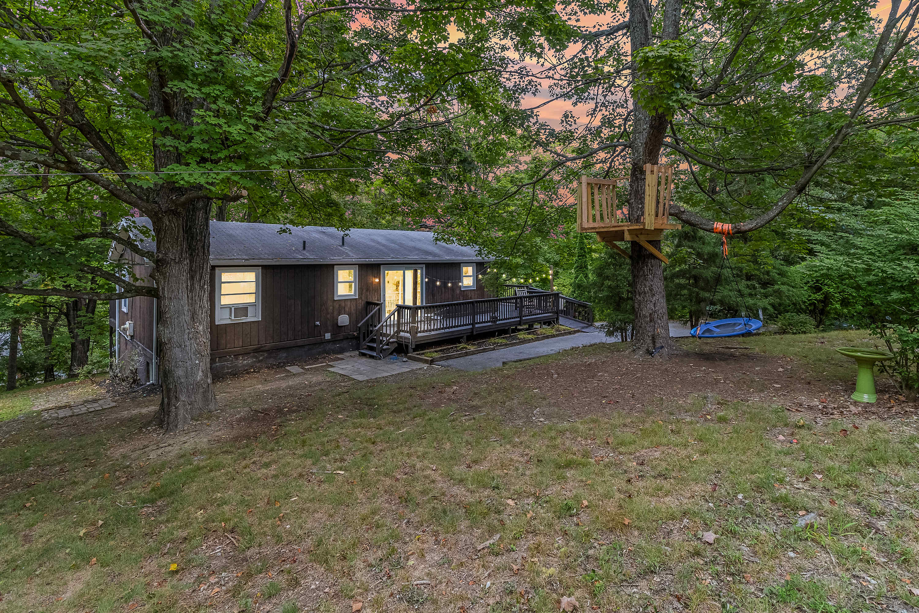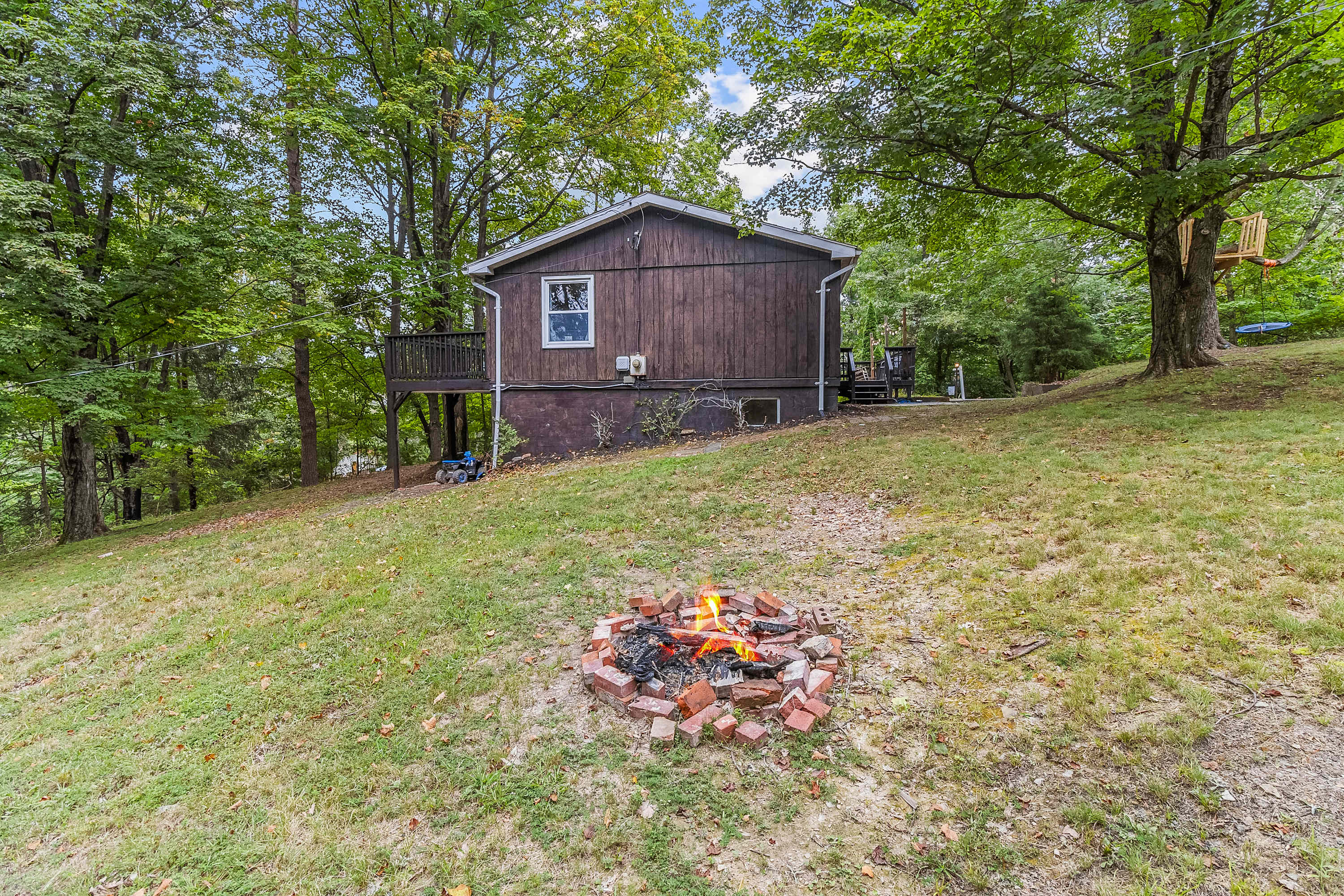 Outdoors, relax on the wraparound deck, gather around the fire pit, or grill on the charcoal barbecue. A covered patio and large yard offer plenty of space to unwind and play.