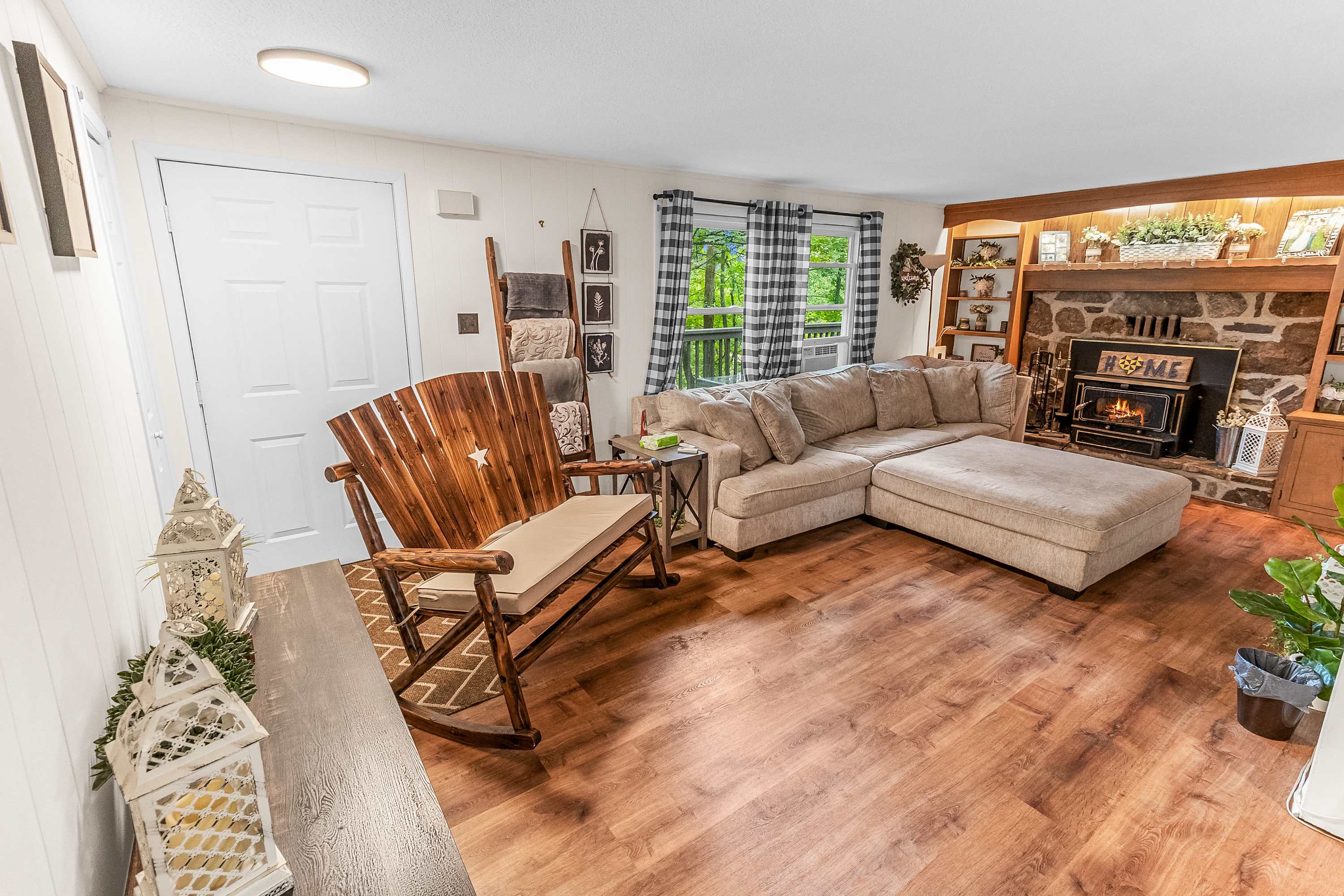 Cozy living area with woodstove and sectional seating