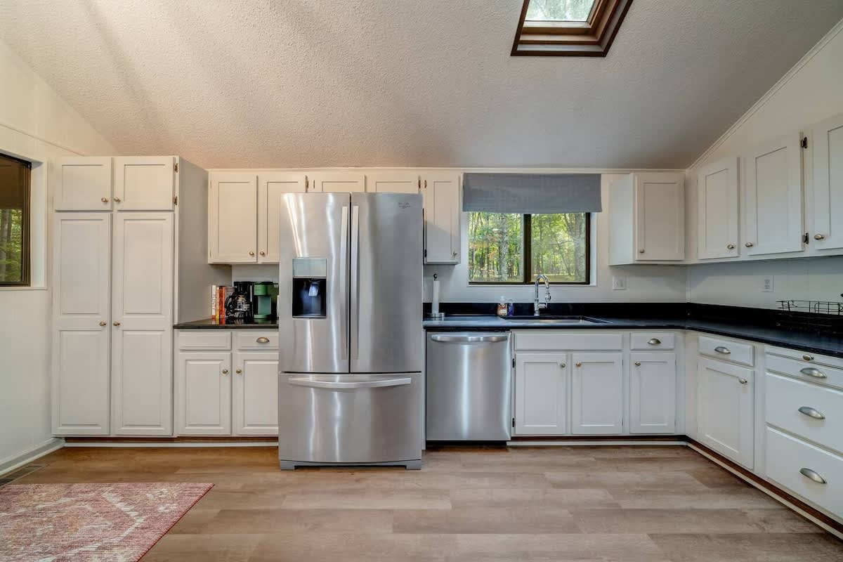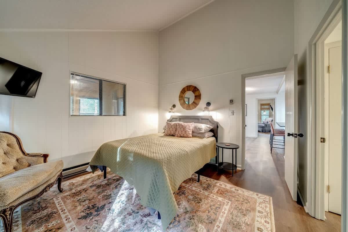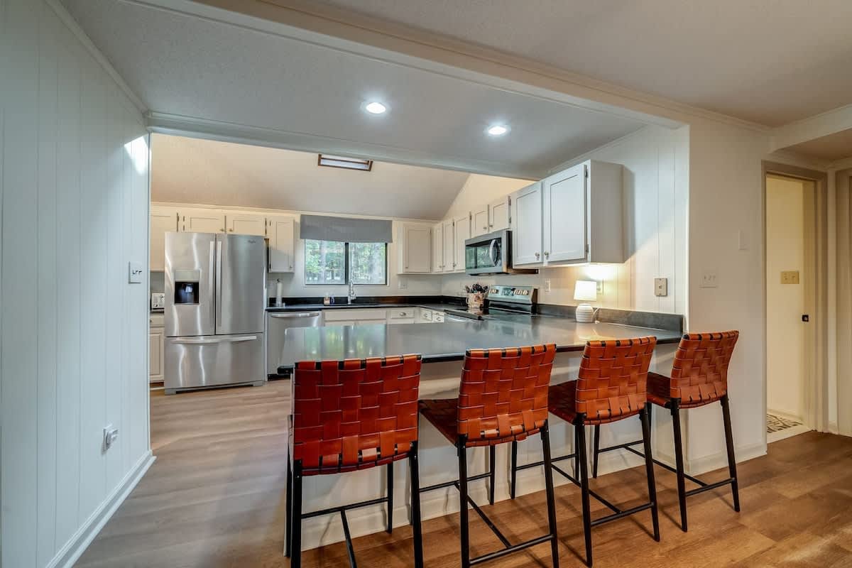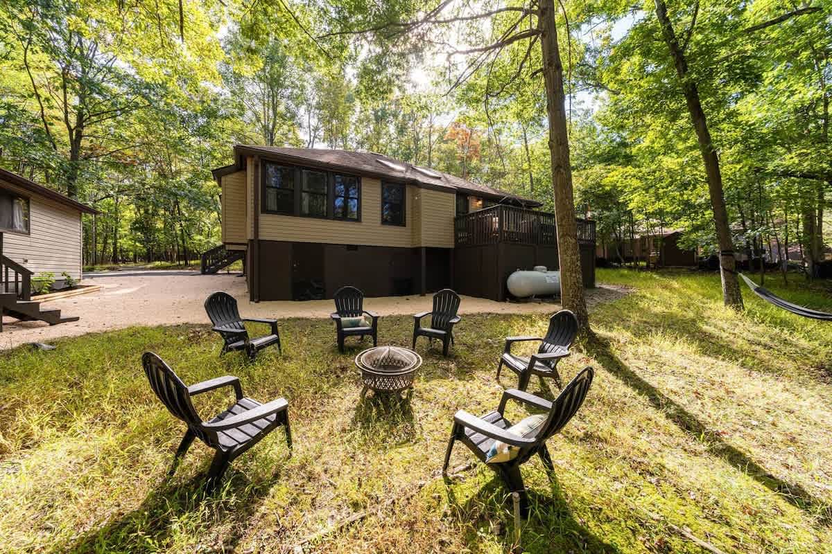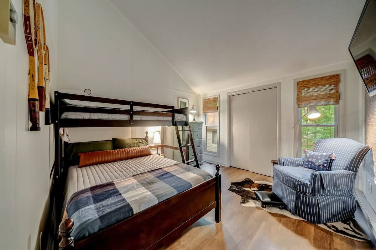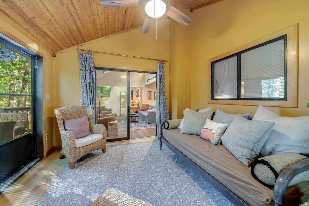 This family friendly cabin in The Woods brings a chic take on mountain cabins. Spend time outdoors relaxing in the hot tub enjoying nature or cozy up around the fire pit. This spacious retreat includes a fully stocked kitchen, sunroom, loft and play area, deck and grill. Public river access and tons of hiking is nearby! Perfect for family, friends or small groups!