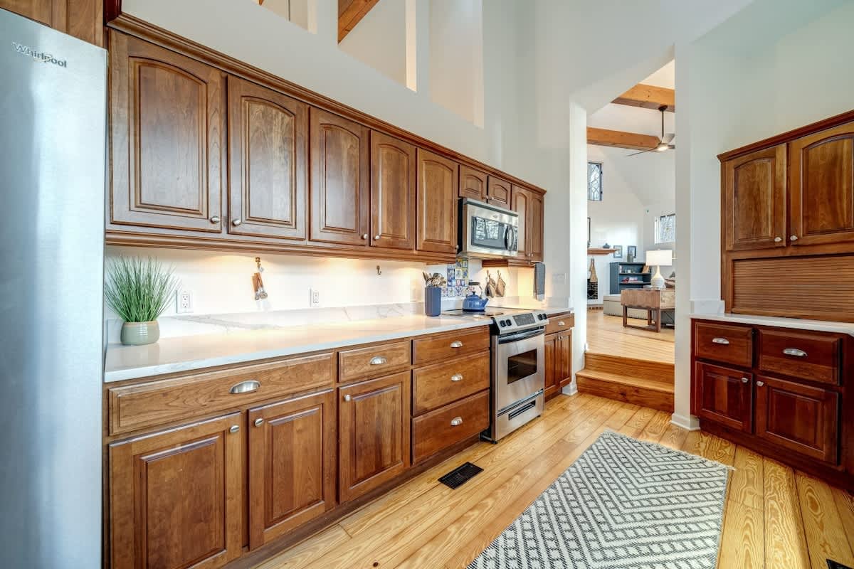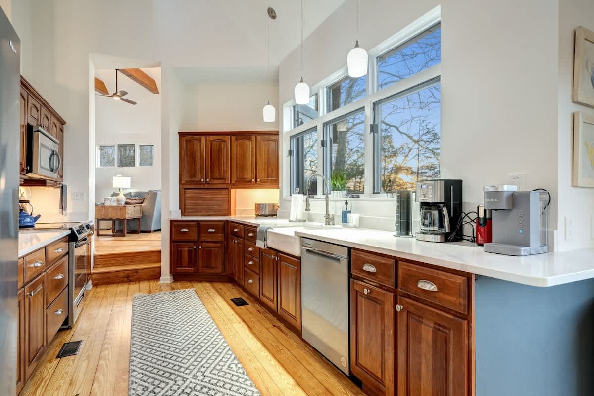 -Fully stocked kitchen with stove/oven, microwave, refrigerator, dishwasher and coffee maker