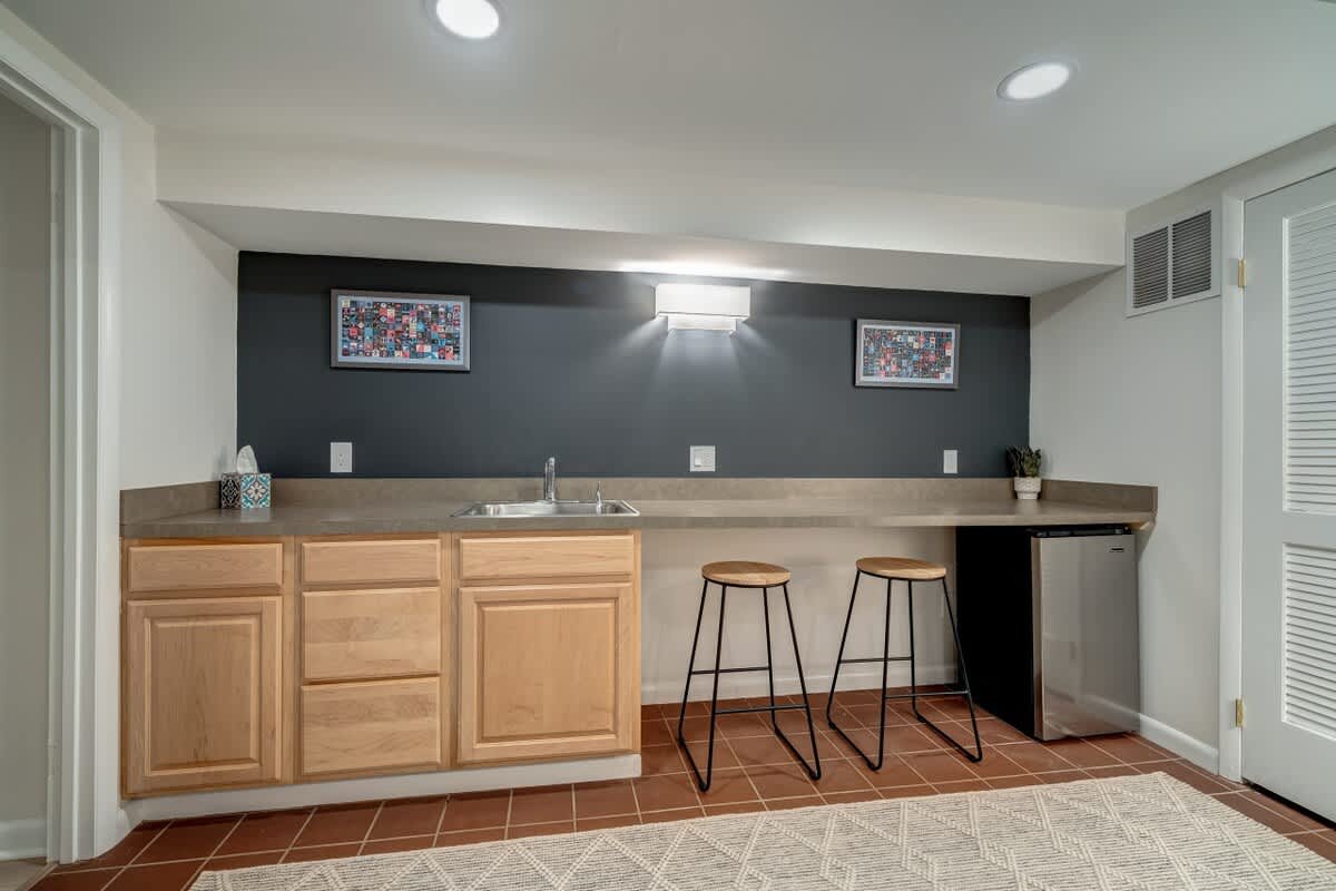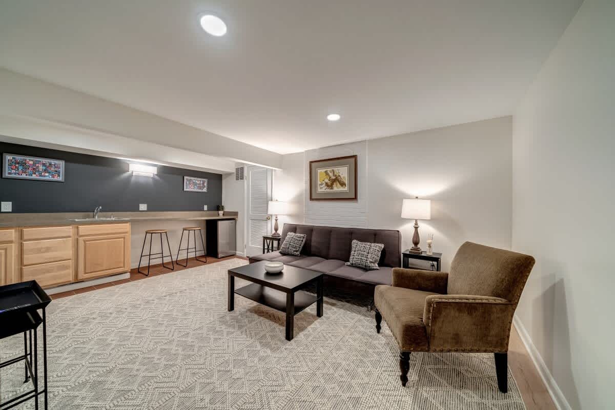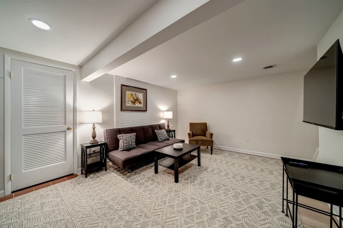 Descending to the lower level, discover a cozy sitting area with a smart TV, ideal for your streaming needs, along with another king suite featuring an attached private bathroom. A separate private entrance enhances convenience.