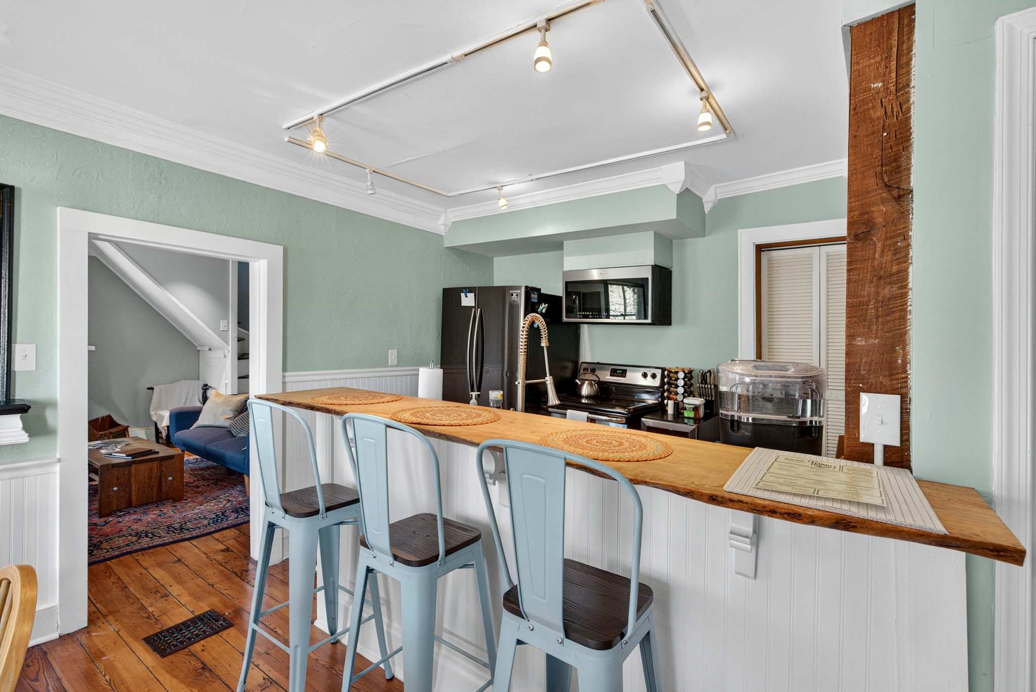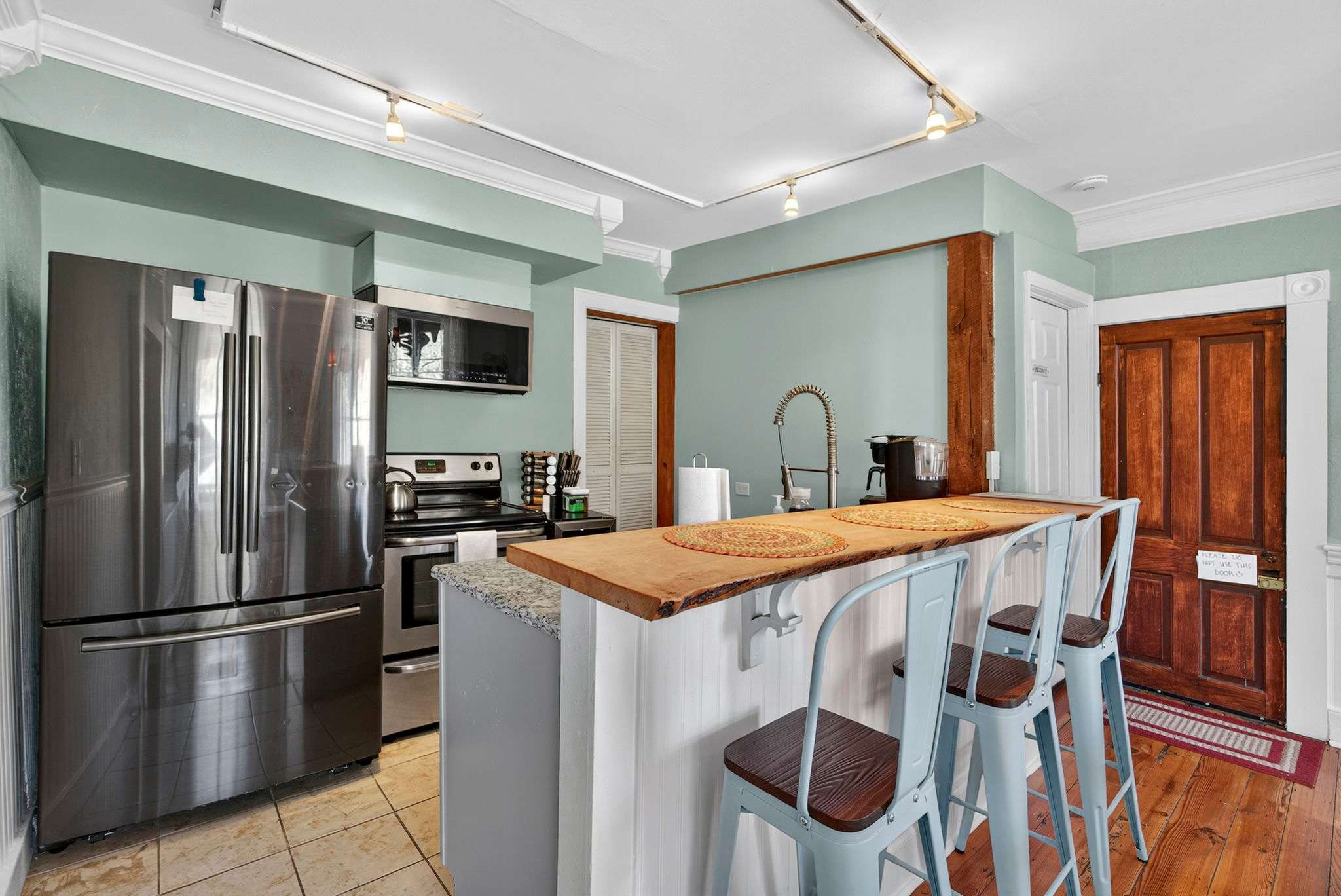 -Step in from the charming front porch and into a cozy, sun-filled living room, where a gas fireplace awaits to warm your evenings. The fully equipped eat-in kitchen is perfect for gathering. Offering dining space for 6 at the main table and 3 at the counter—ideal for a family breakfast or a lively dinner party. A convenient half bath completes the main floor.
