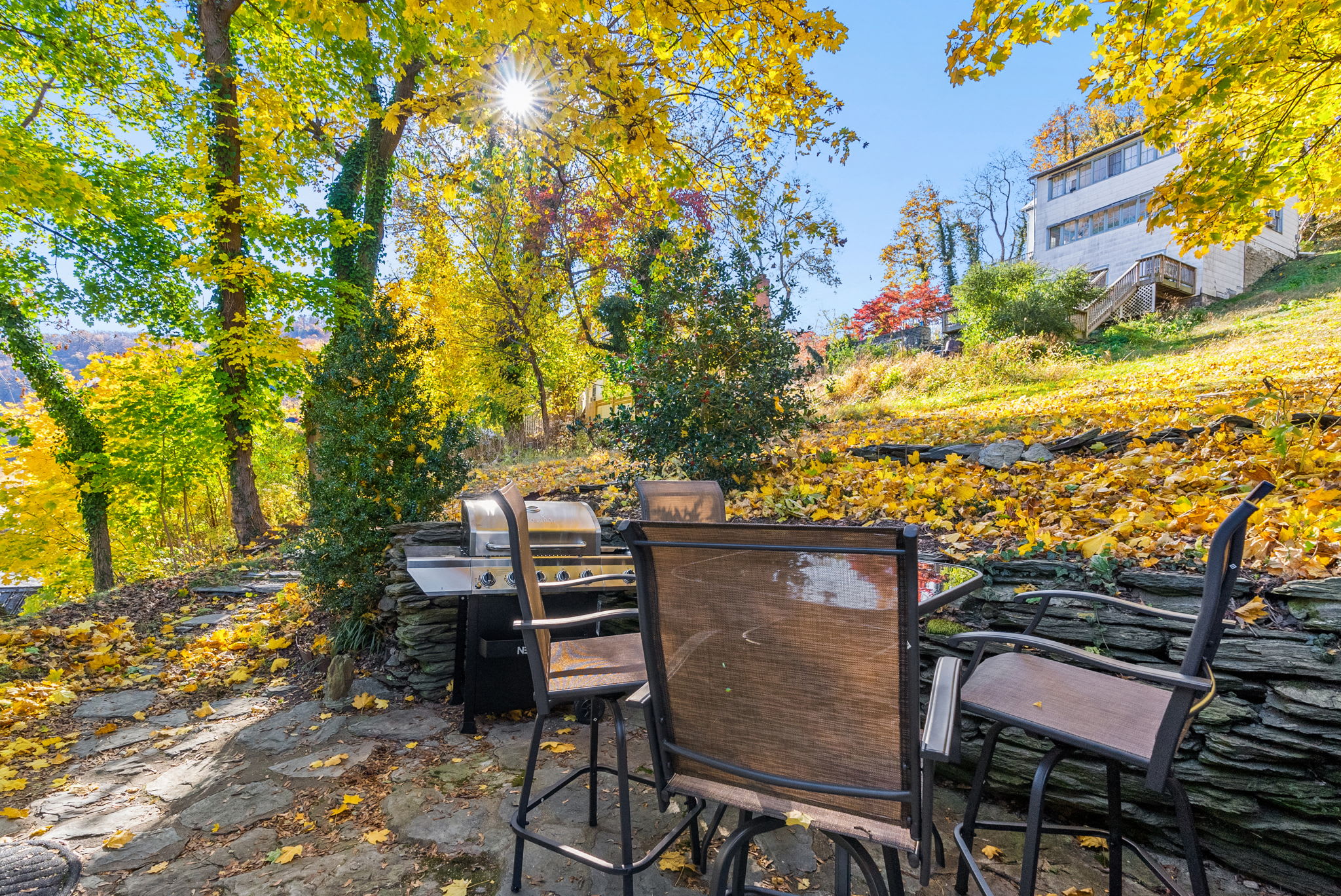 -Two inviting bedrooms await upstairs. Both offer stunning views to wake up to. A full bathroom serves both bedrooms, and just steps away is the super-cozy TV room. The perfect escape for movie nights. Just off of the TV room is a private back patio offering a quiet place to unwind. Enjoy the view of the river from the fire pit with comfortable Adirondack chairs ready for lounging