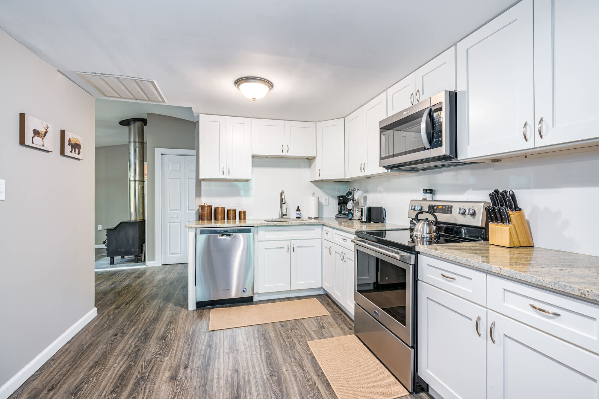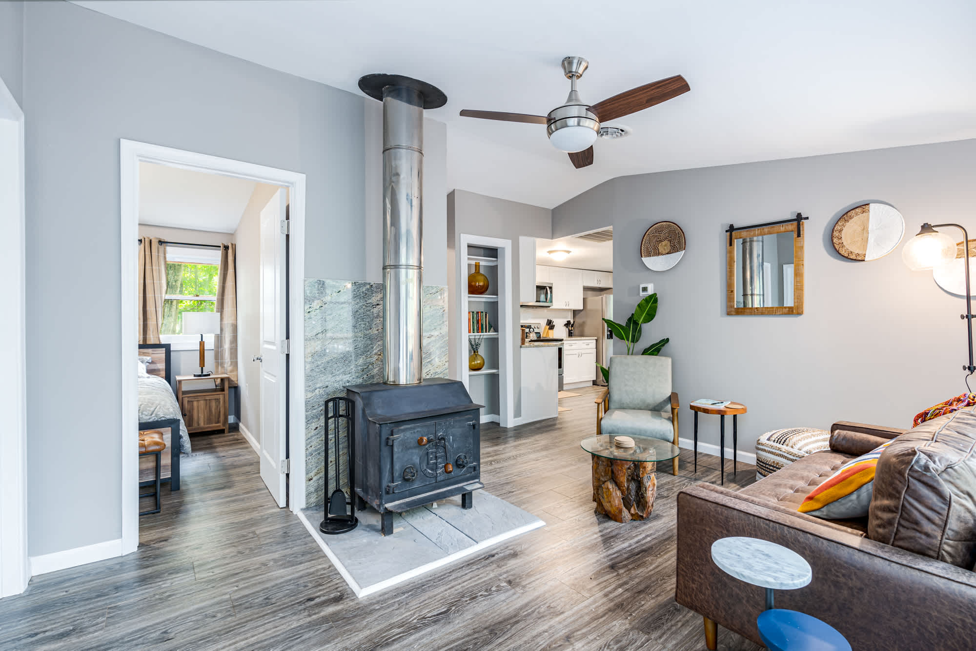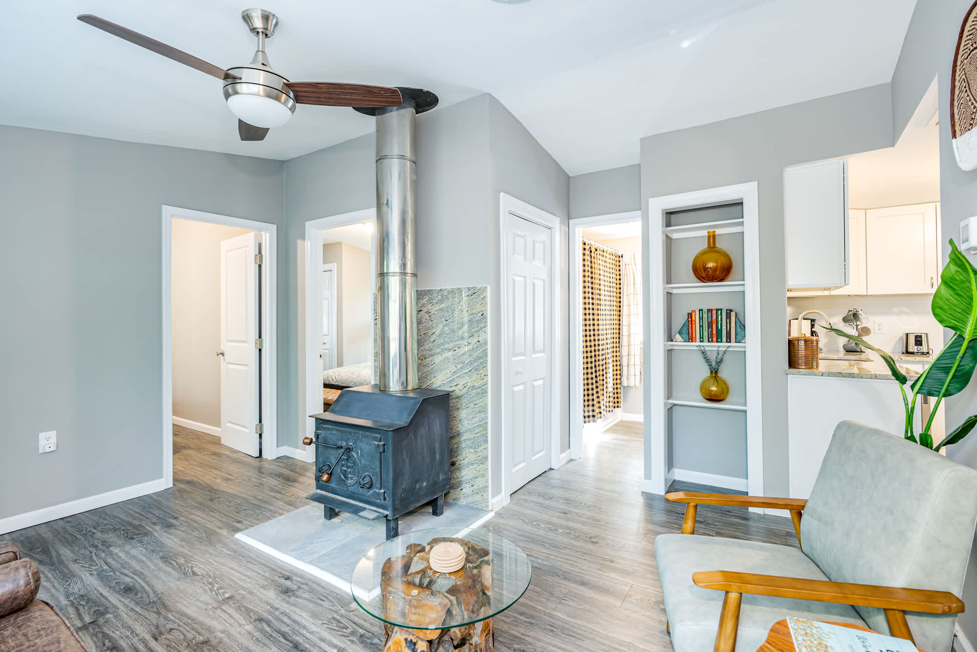 - Wood stove to keep you cozy at night (plus baseboard heaters if you want to keep things easy)