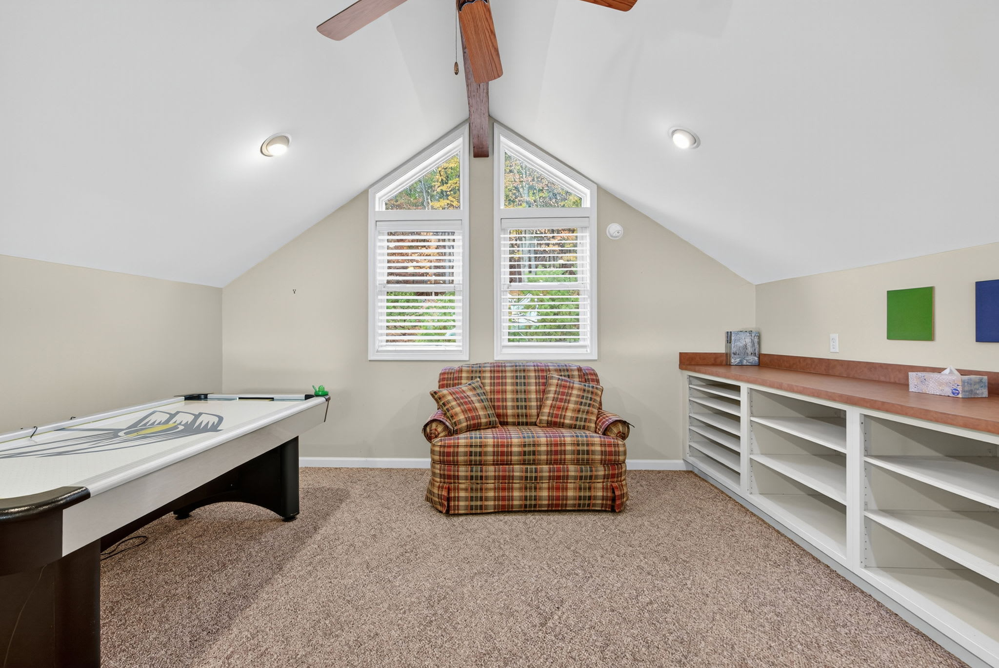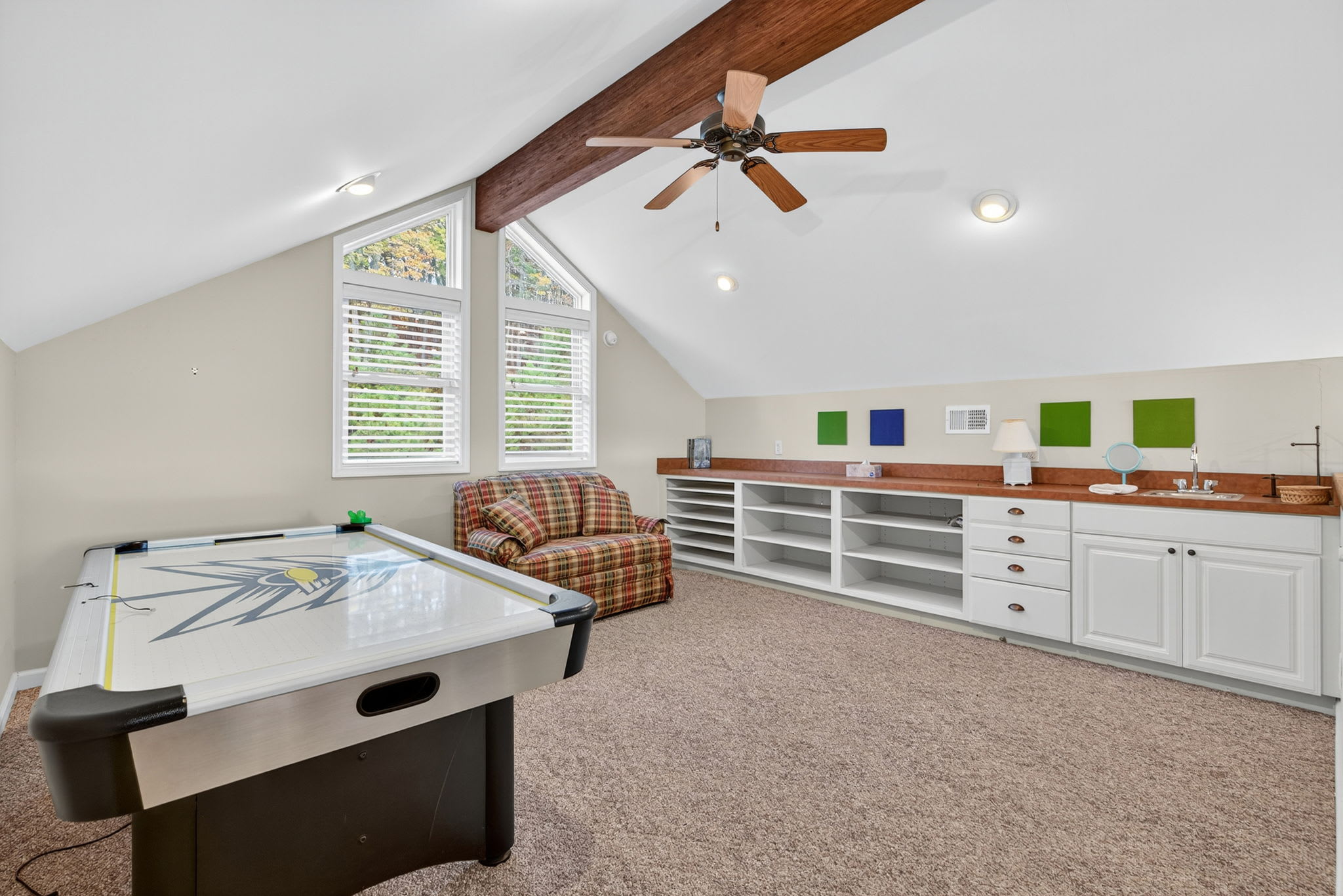 Loft hangout space with game/poker table, air hockey table, exercise bike and books