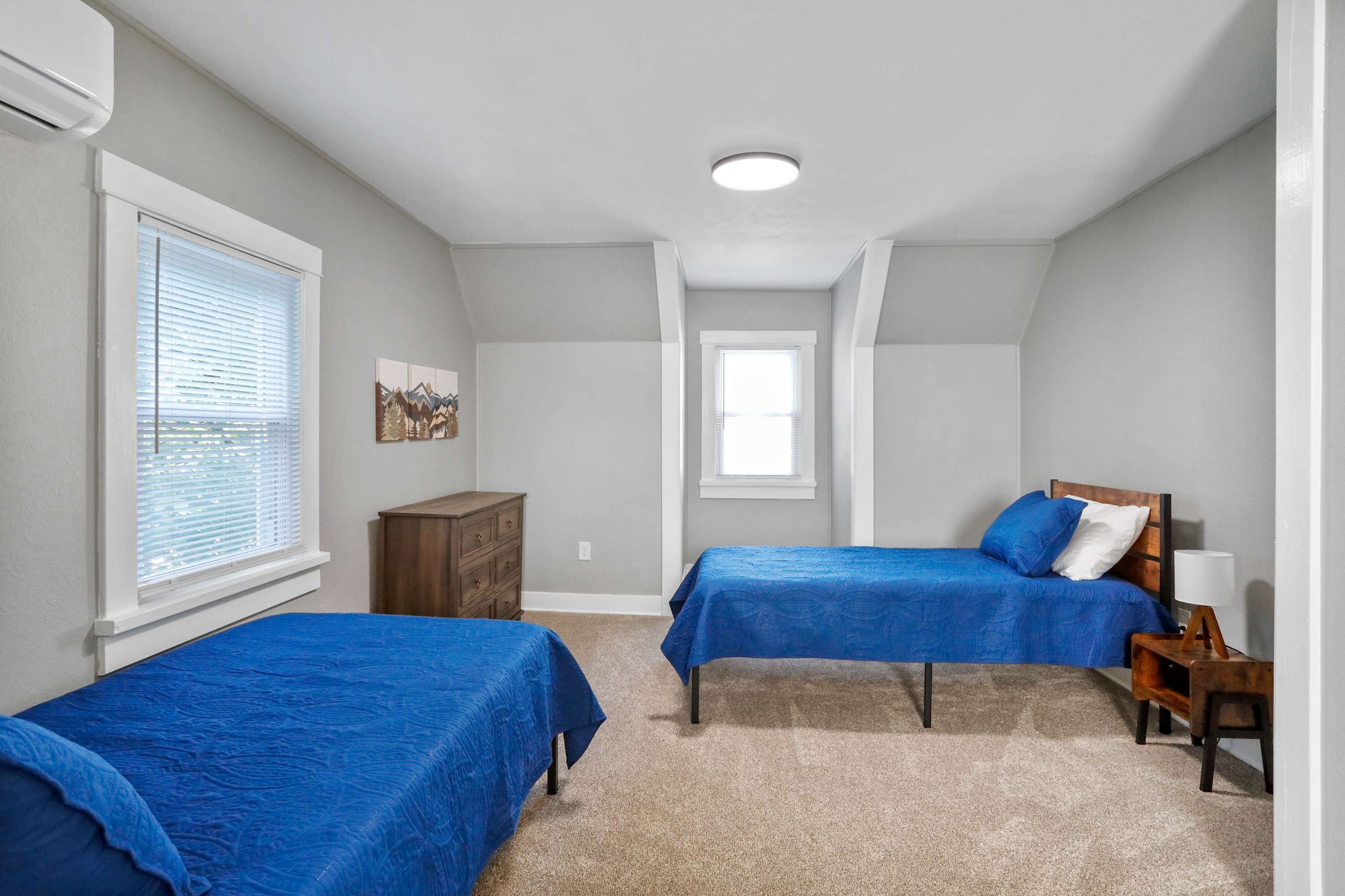 -Bedroom 2 (upper level) Two Twin Beds, Smart TV and shared access to full bath (shower/tub combo)