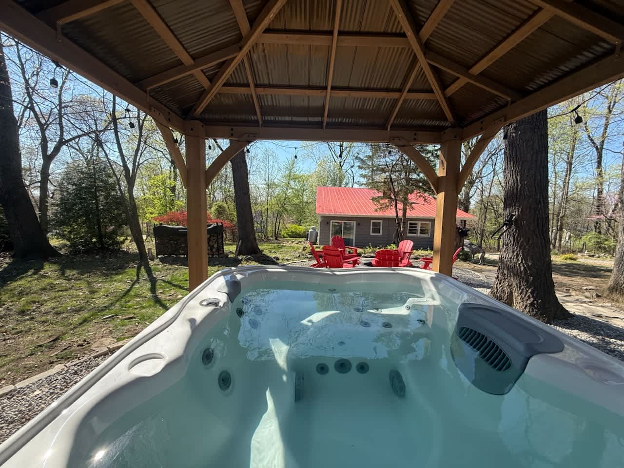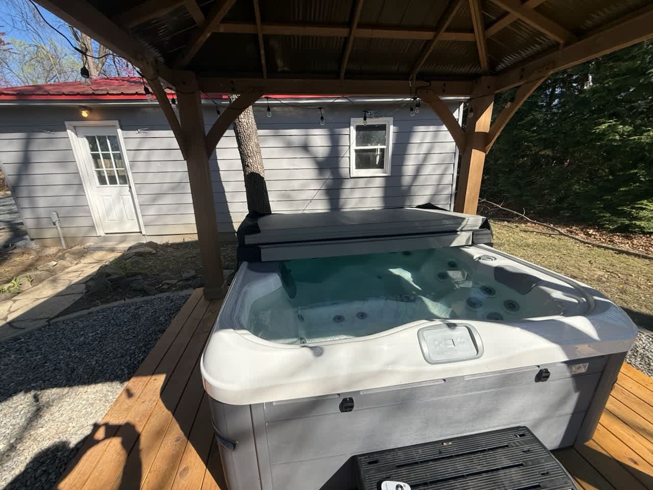 Private river access invites kayaking, tubing or simply sitting by the water’s edge. The fire pit with Adirondrock chairs and hot tub offers cozy nights under the stars, and the full‑length enclosed porch is perfect for morning coffee or sunset cocktails. Parking for two to three cars and frequent deer sightings add to the rustic charm.