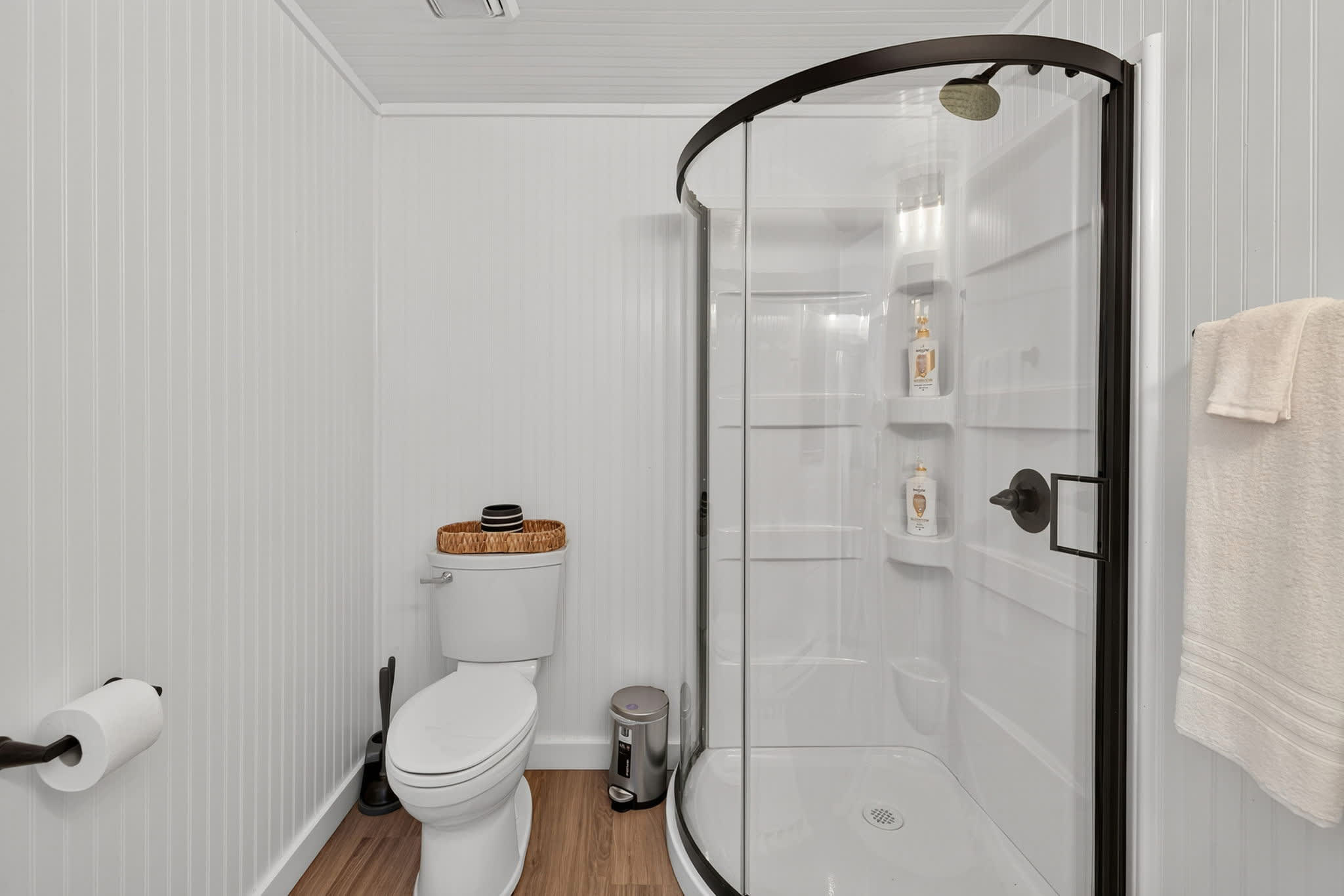 - An indoor full bathroom with a shower
