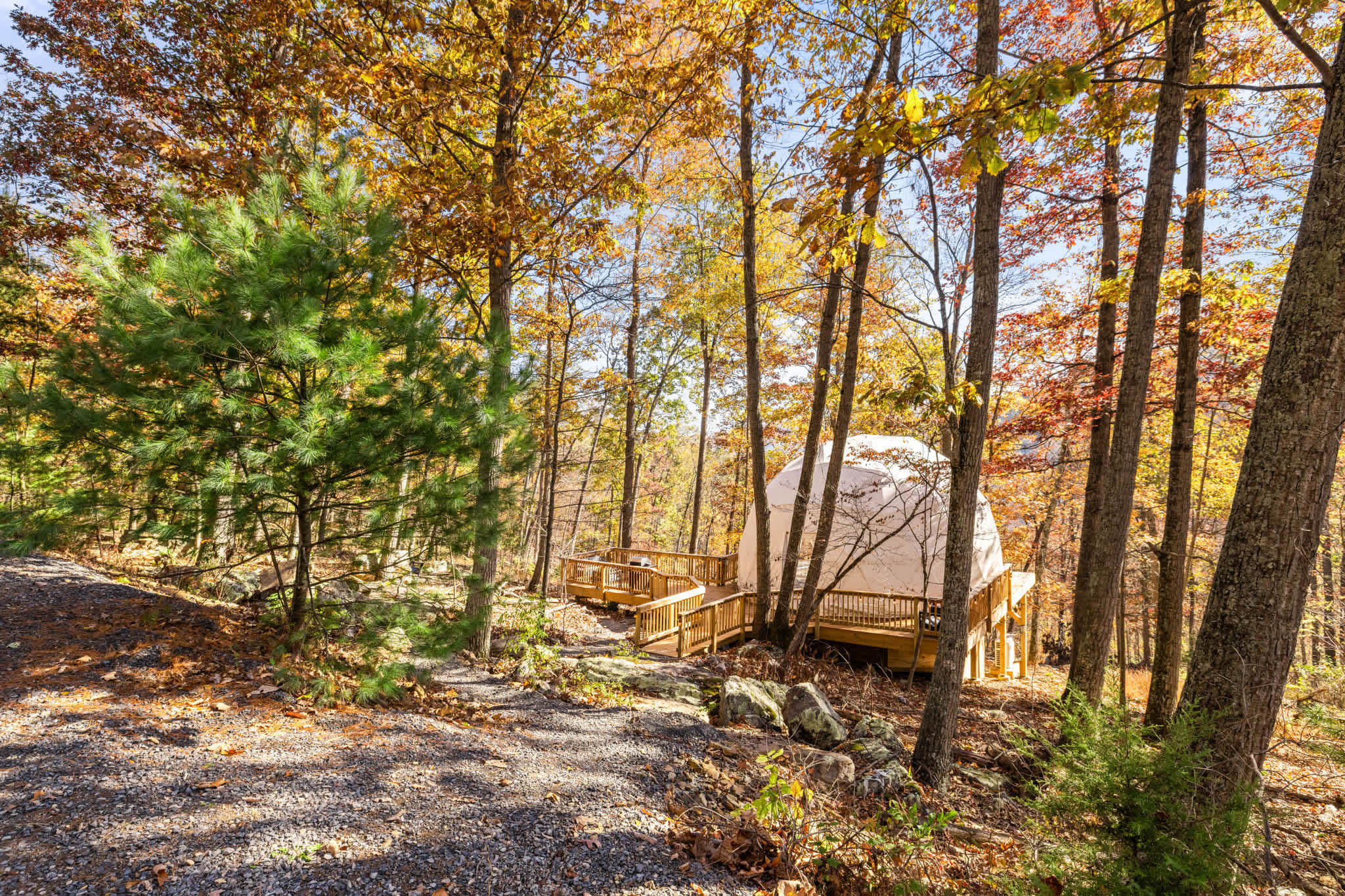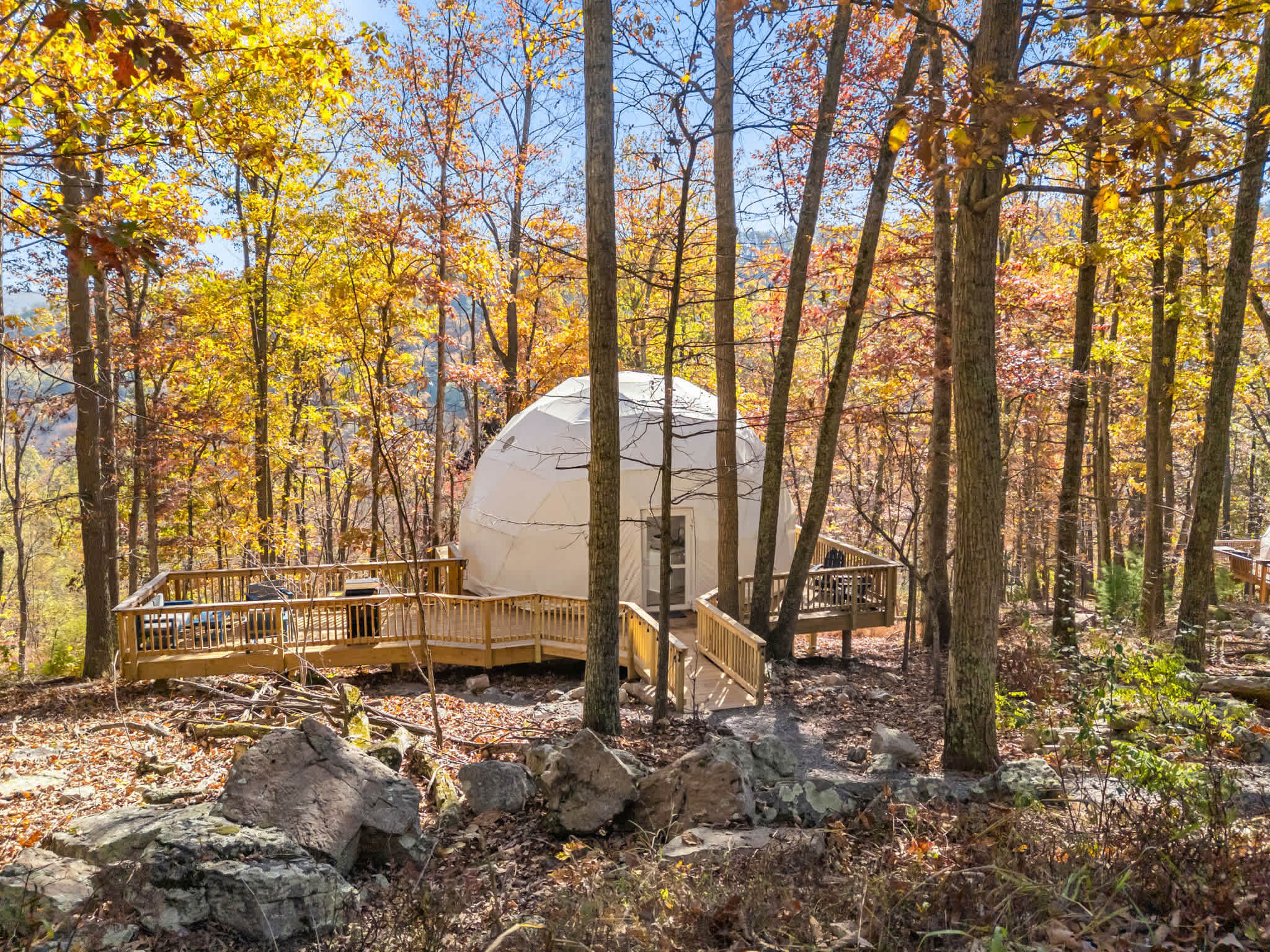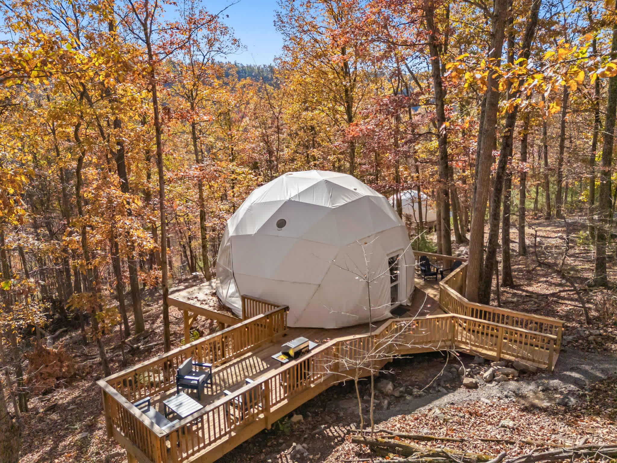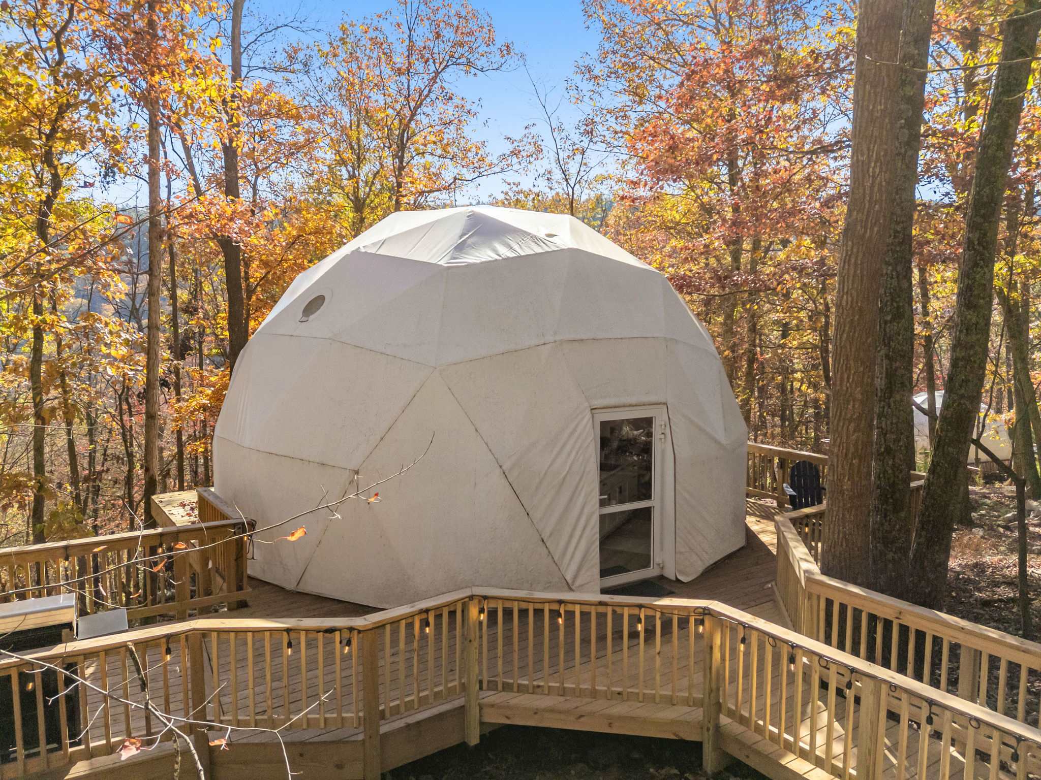 Please note: Orion is part of a large private retreat, with one yurt and another dome nearby. One dome is about 100 feet away, and the yurt is over 400 feet away. While you may see other guests at these properties during your stay, Orion is still quite secluded — with your own private deck and fire pit. BTW, if you’re interested in booking both domes, please let us know!