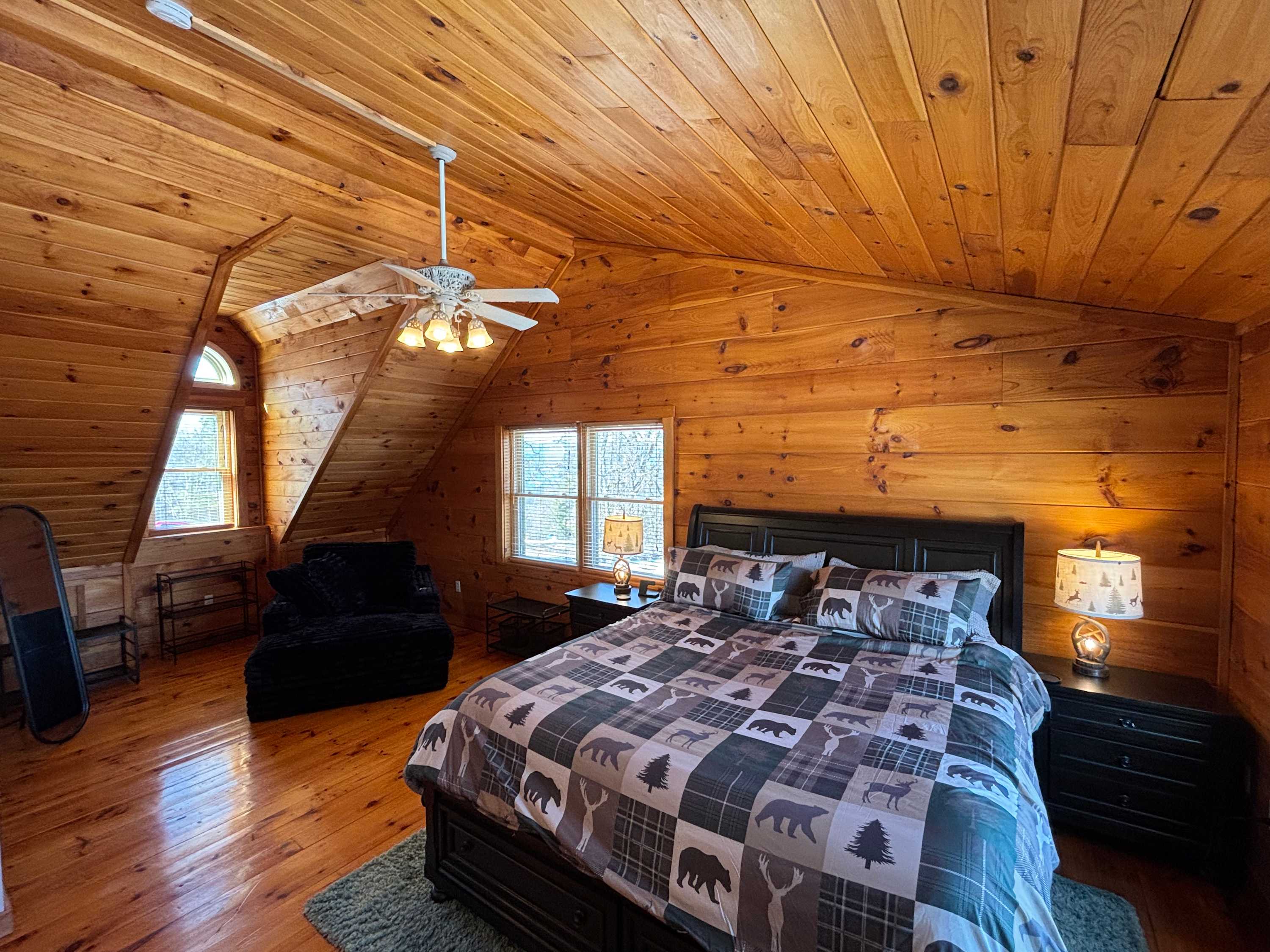 Bedroom 1 – Primary Suite (Upper Level): King bed, ceiling fan, en-suite half bathroom and access to loft space and upper level deck
