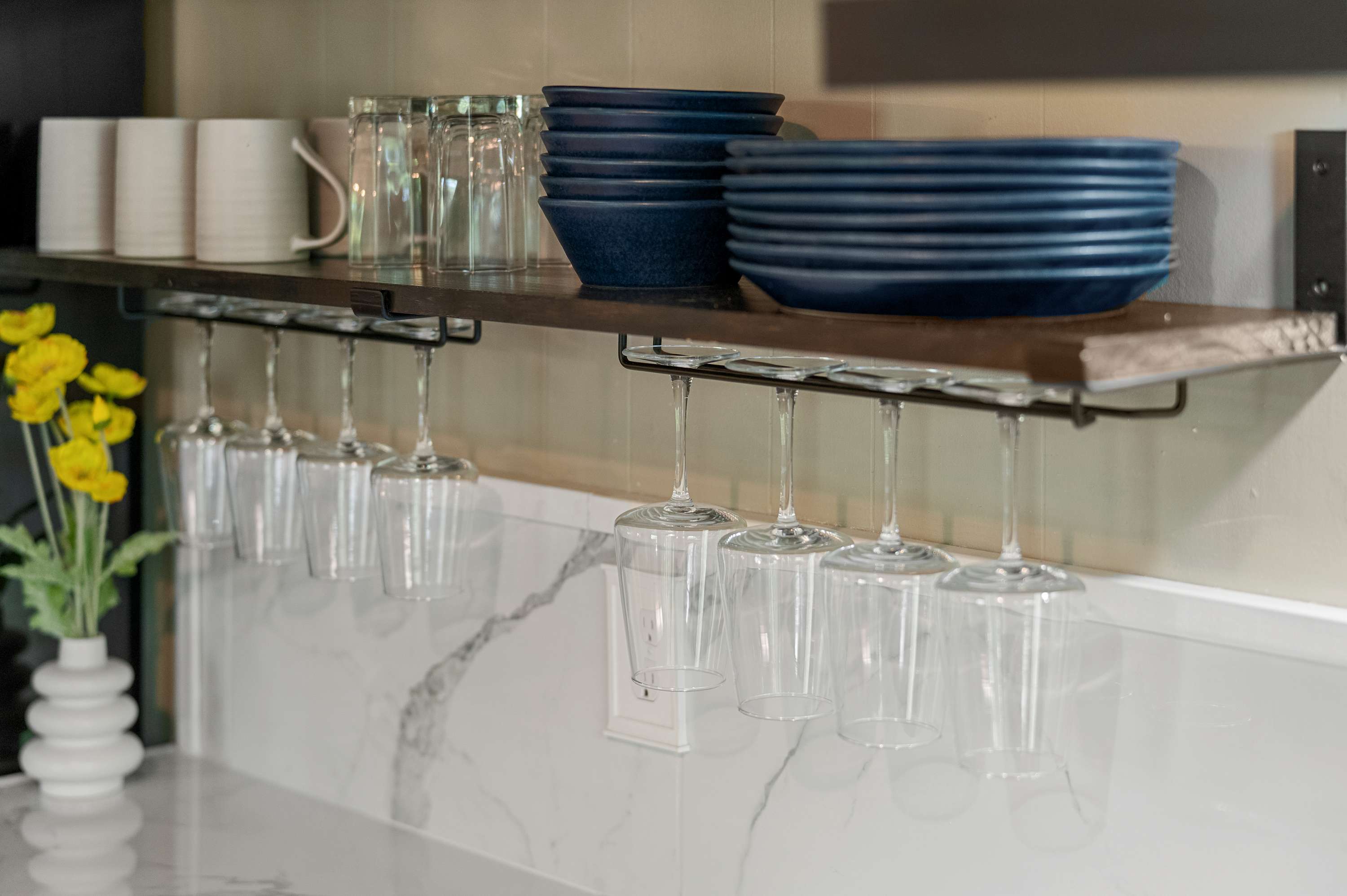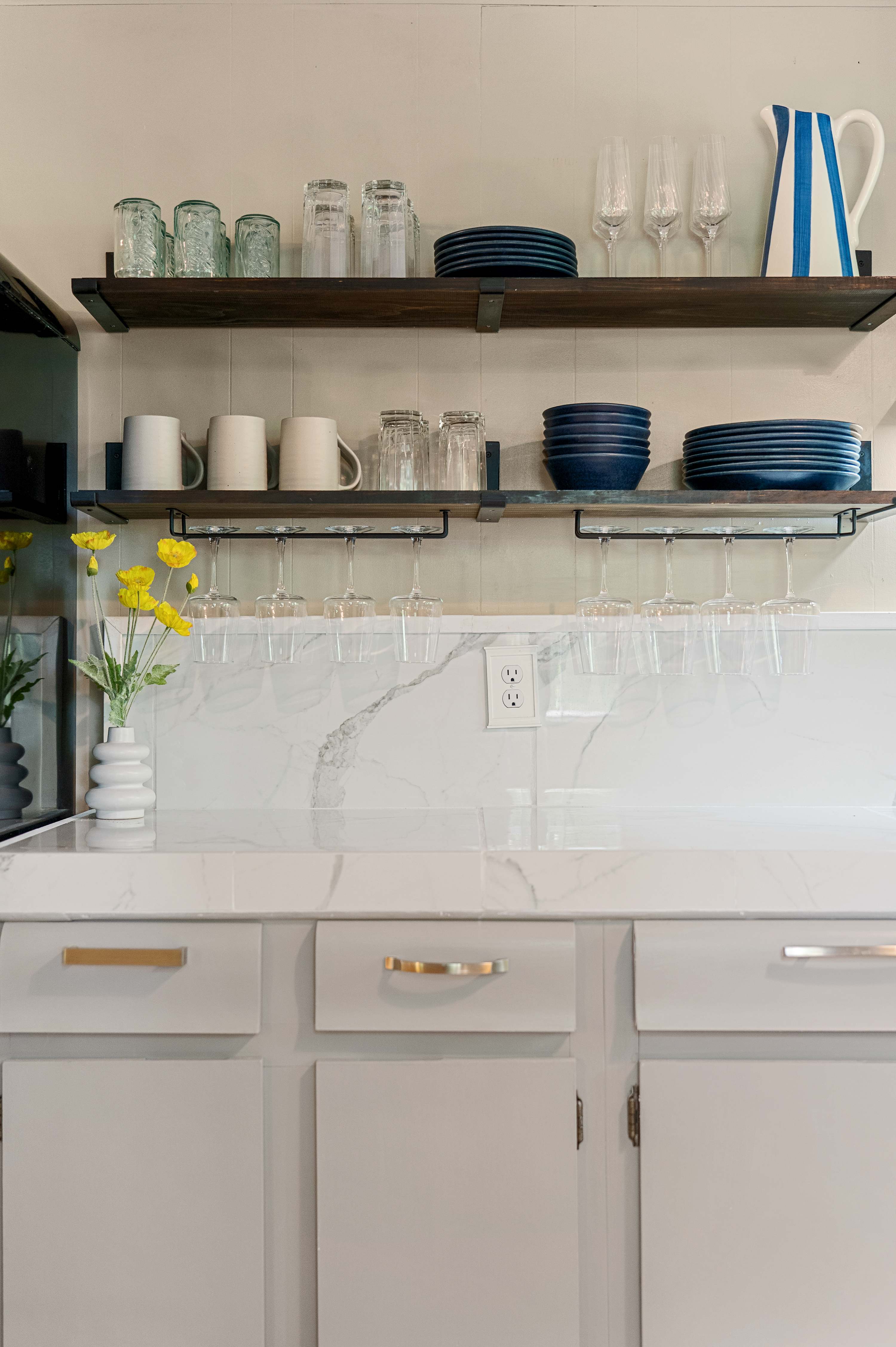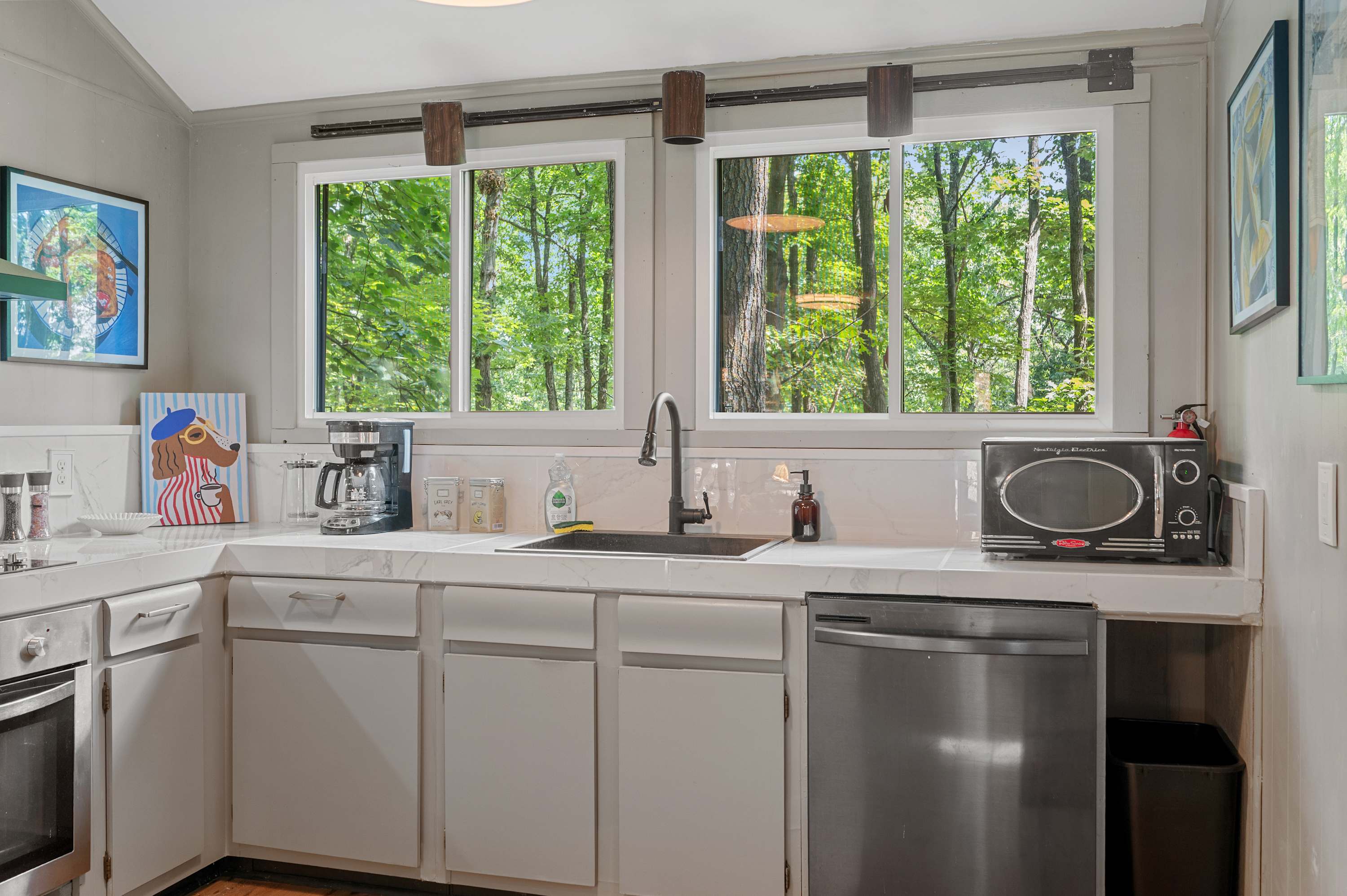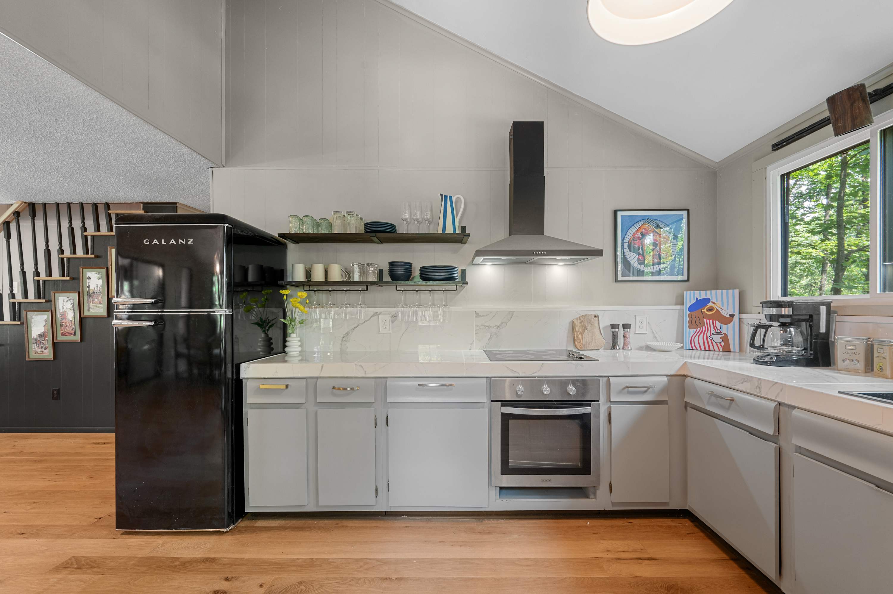 The beautifully updated kitchen blends modern style with functionality, featuring sleek appliances, open shelving, a dishwasher, oven and range, microwave, and coffee maker. A separate dining area surrounded by windows provides a bright and inviting space to enjoy meals together while taking in the views.