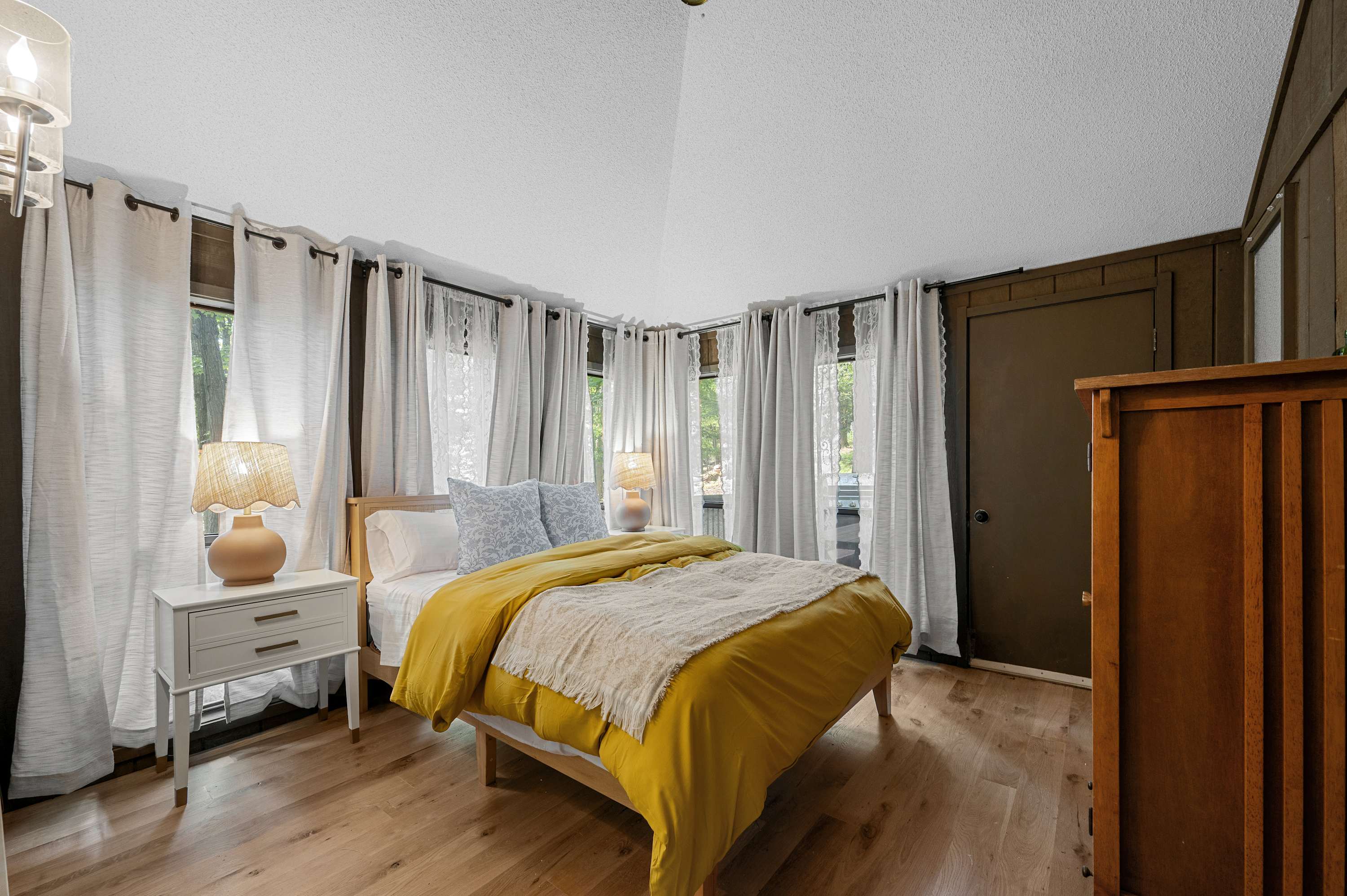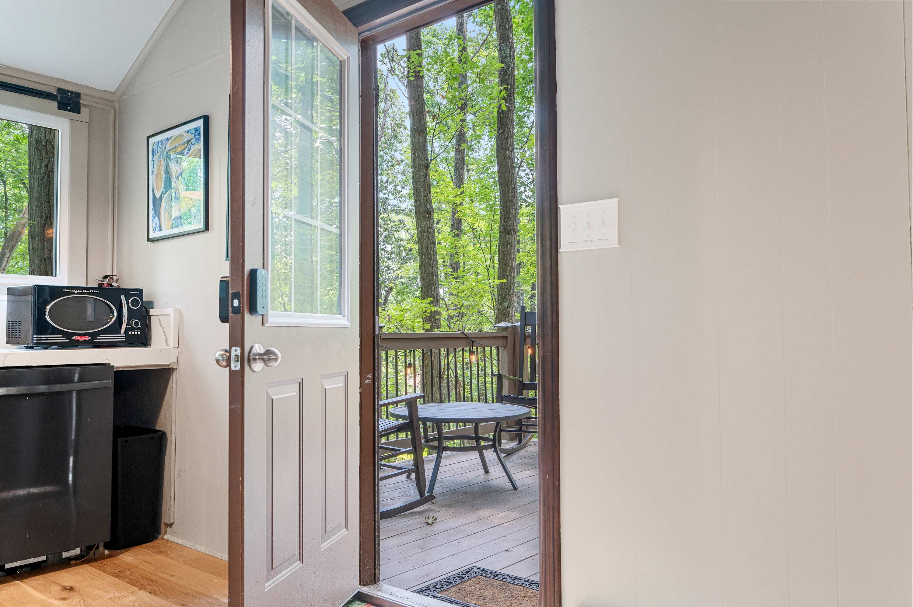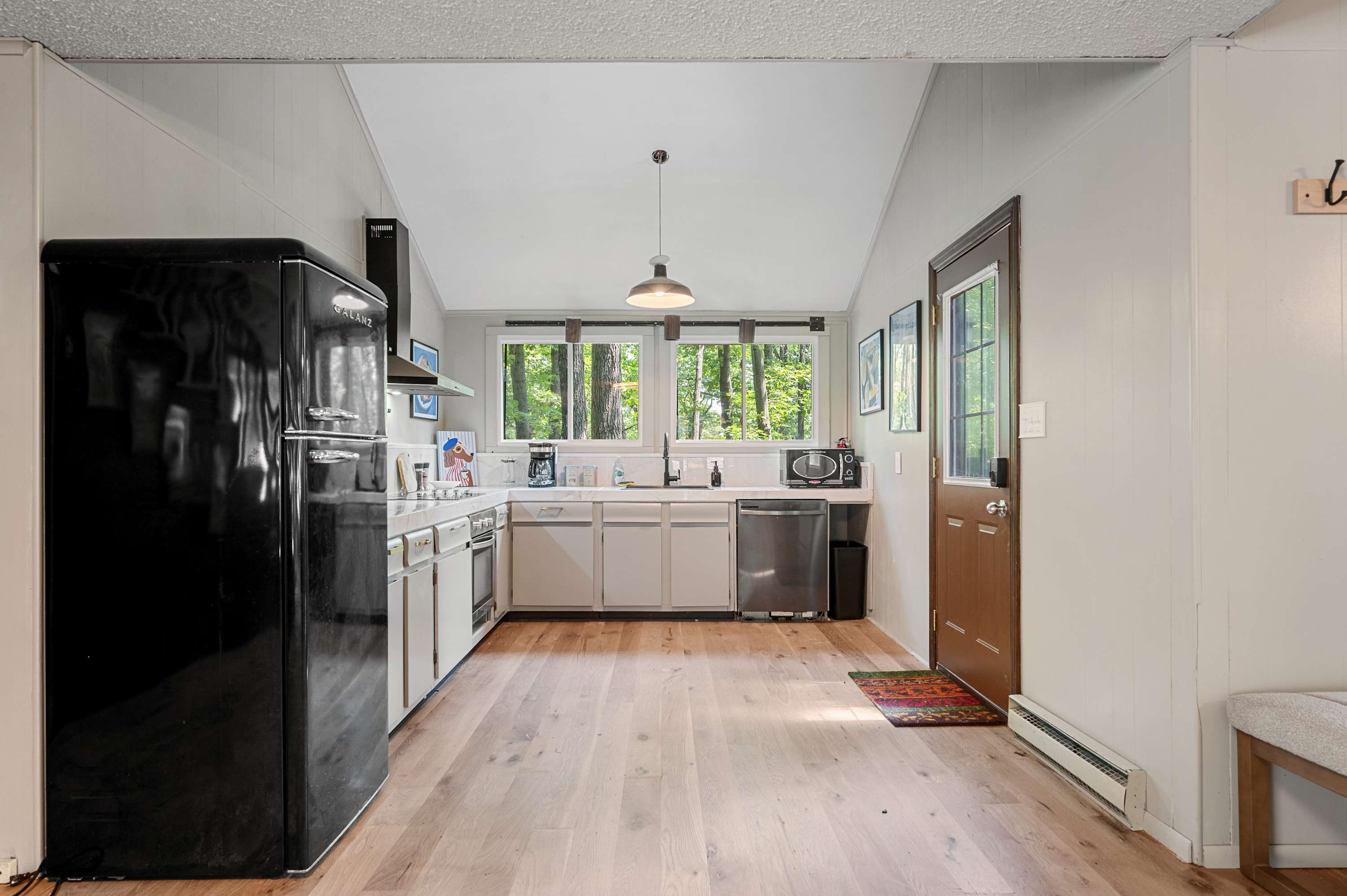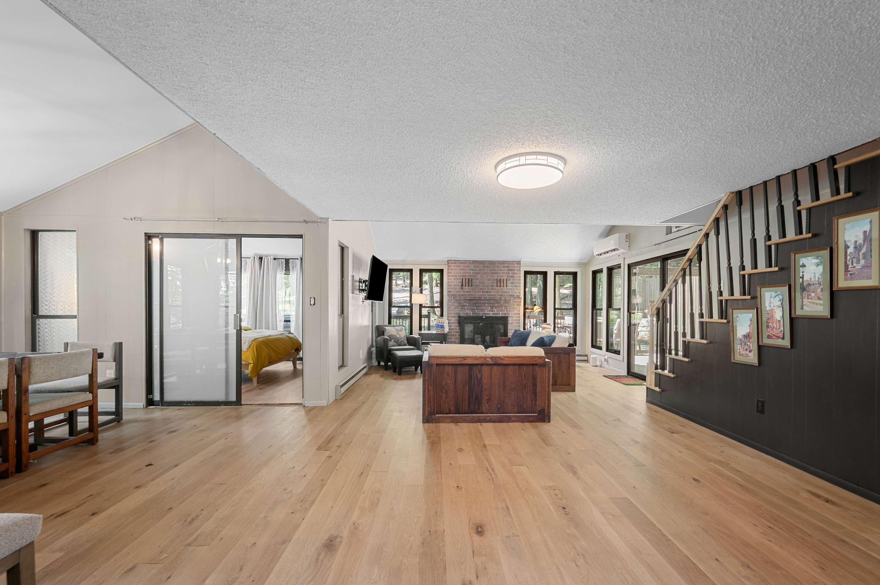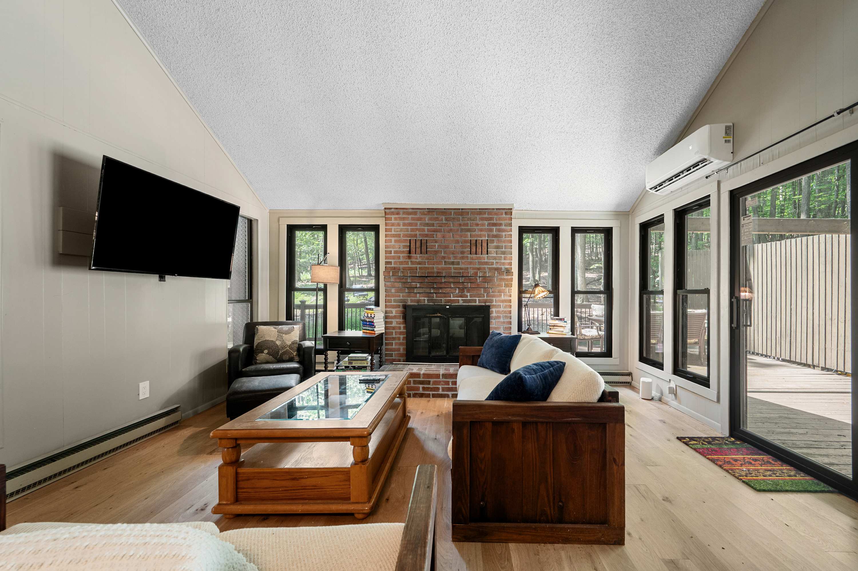 Inside, you’ll find soaring ceilings and large windows that flood the space with natural light. The open-concept living room offers plenty of comfortable seating, a smart TV for streaming, and a decorative fireplace that adds warmth and charm. A minisplit system ensures the perfect temperature year-round, so you can always settle in with ease.