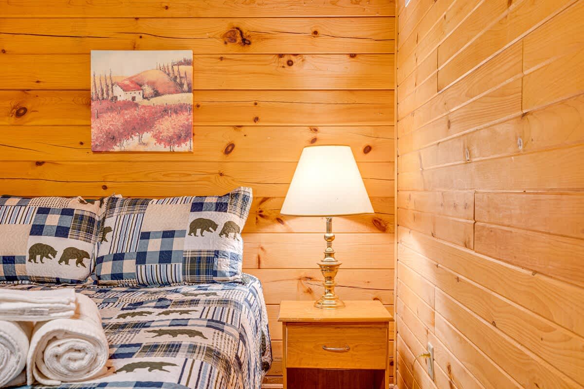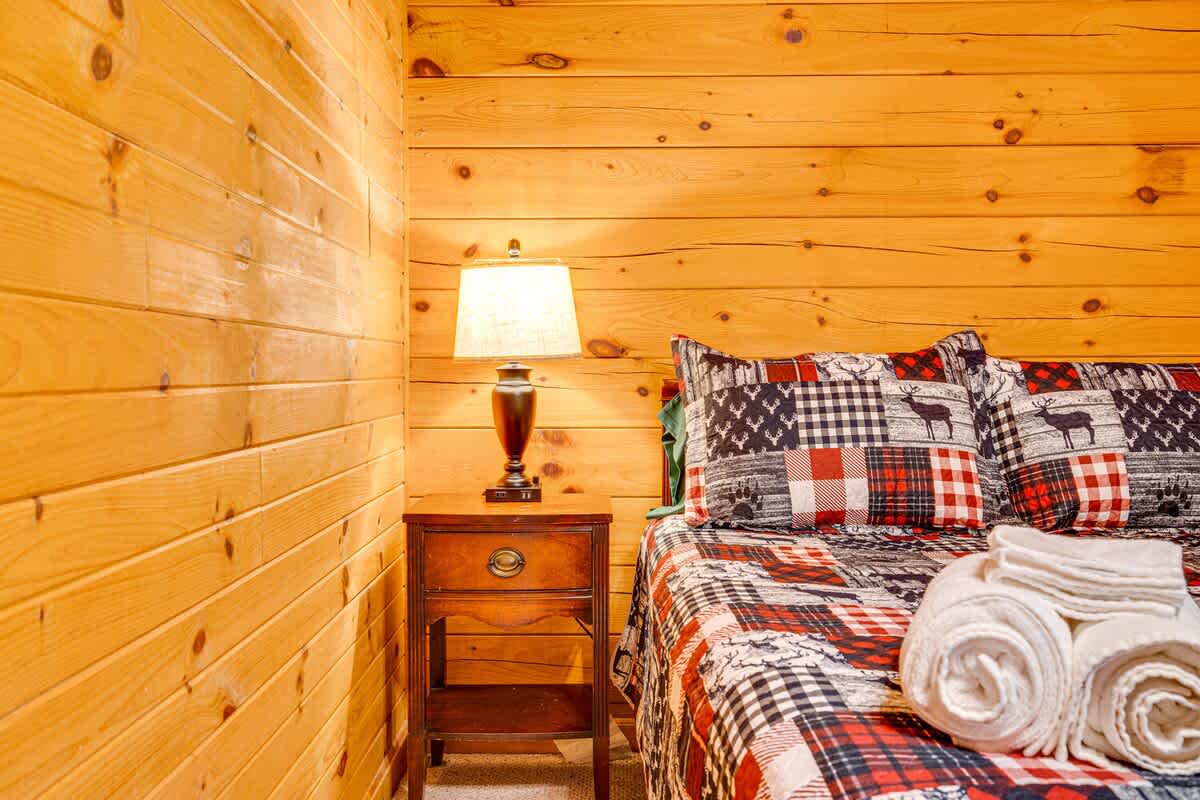 This cabin comfortably sleeps 10 guests across four cozy sleeping areas: