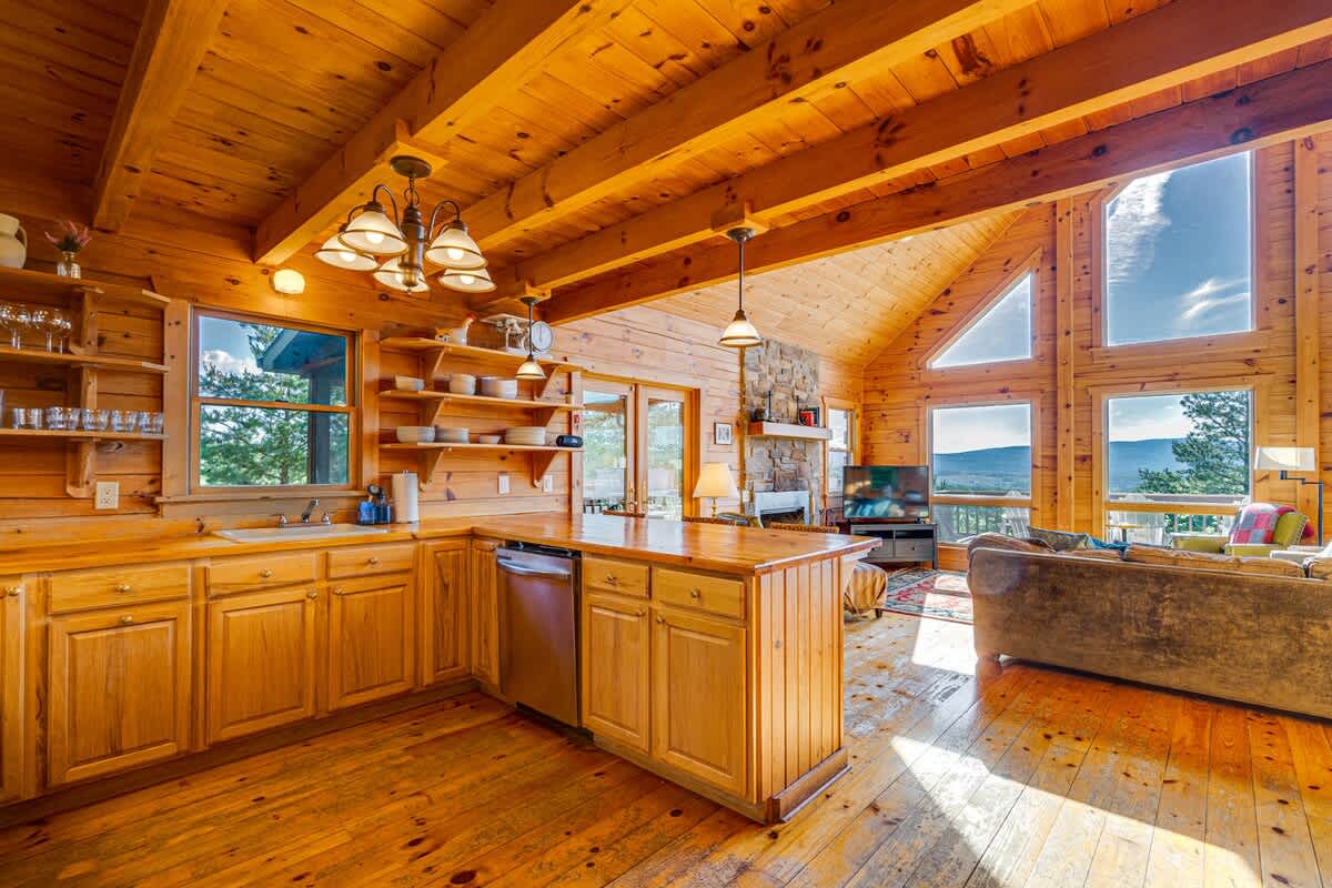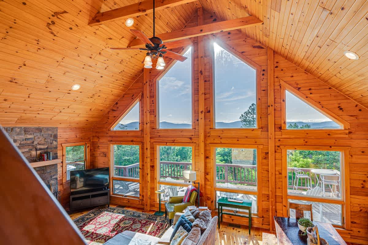 Tucked deep into the Appalachian wilderness, this spacious cabin blends rustic charm with modern comfort. Floor-to-ceiling windows frame panoramic mountain views, soaring ceilings add warmth and drama, and every room is designed for comfort and connection.