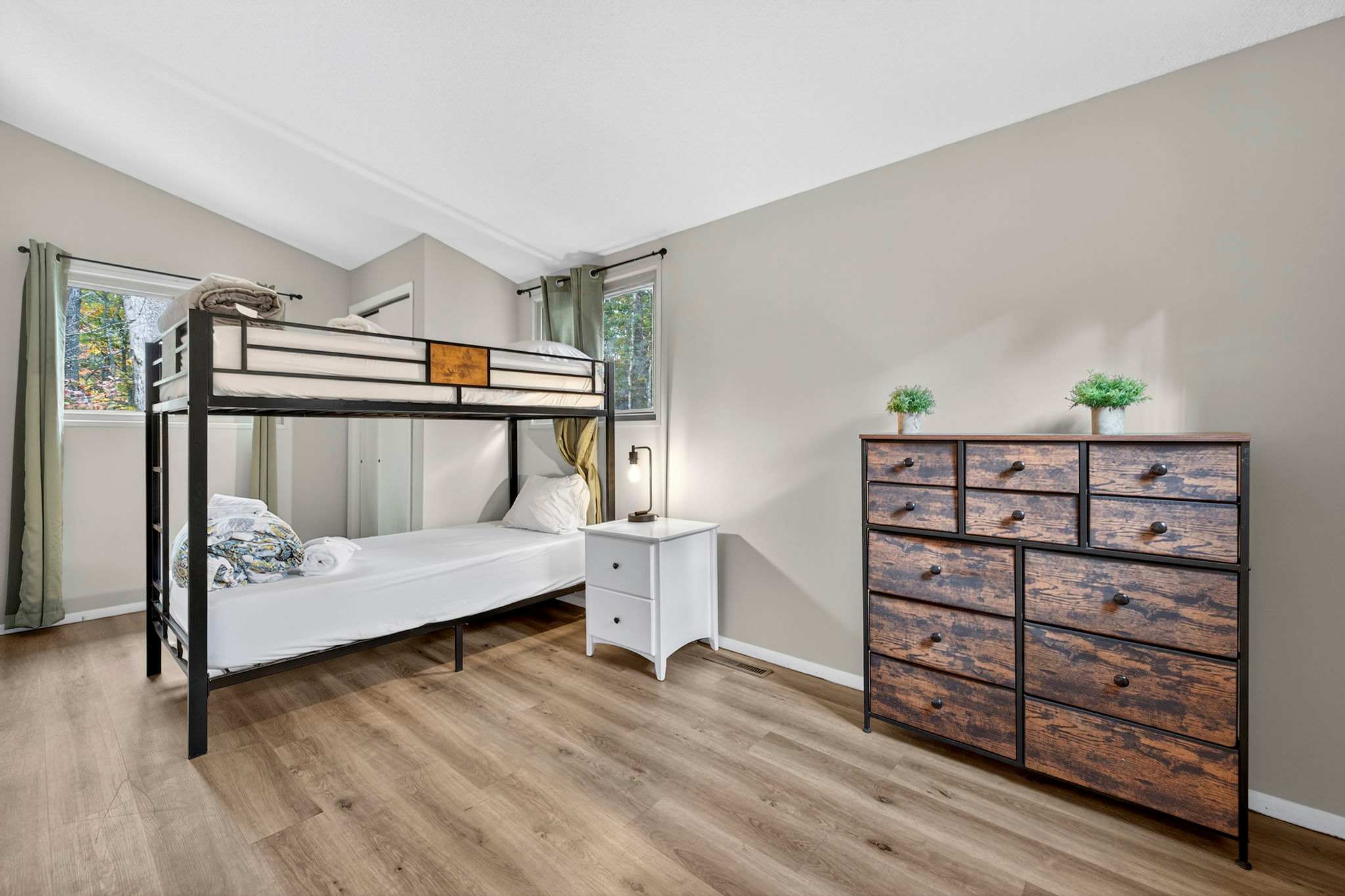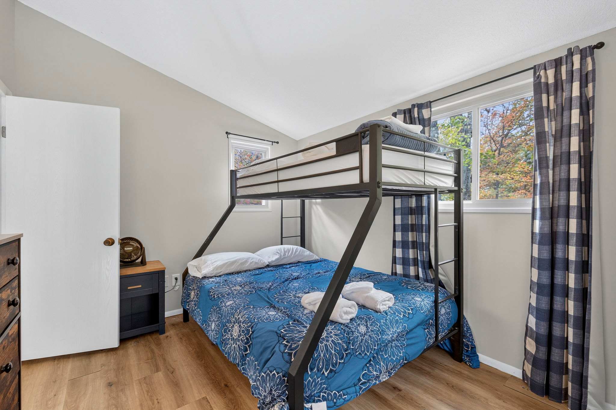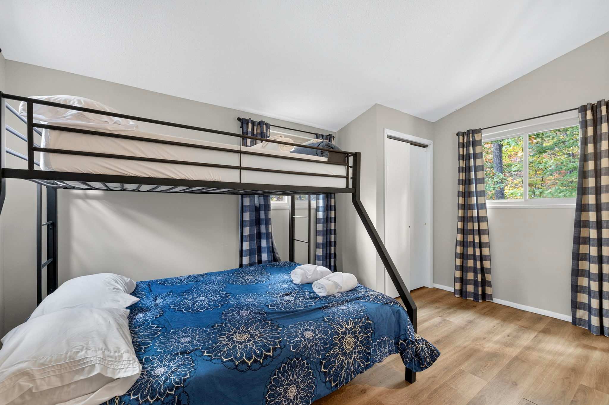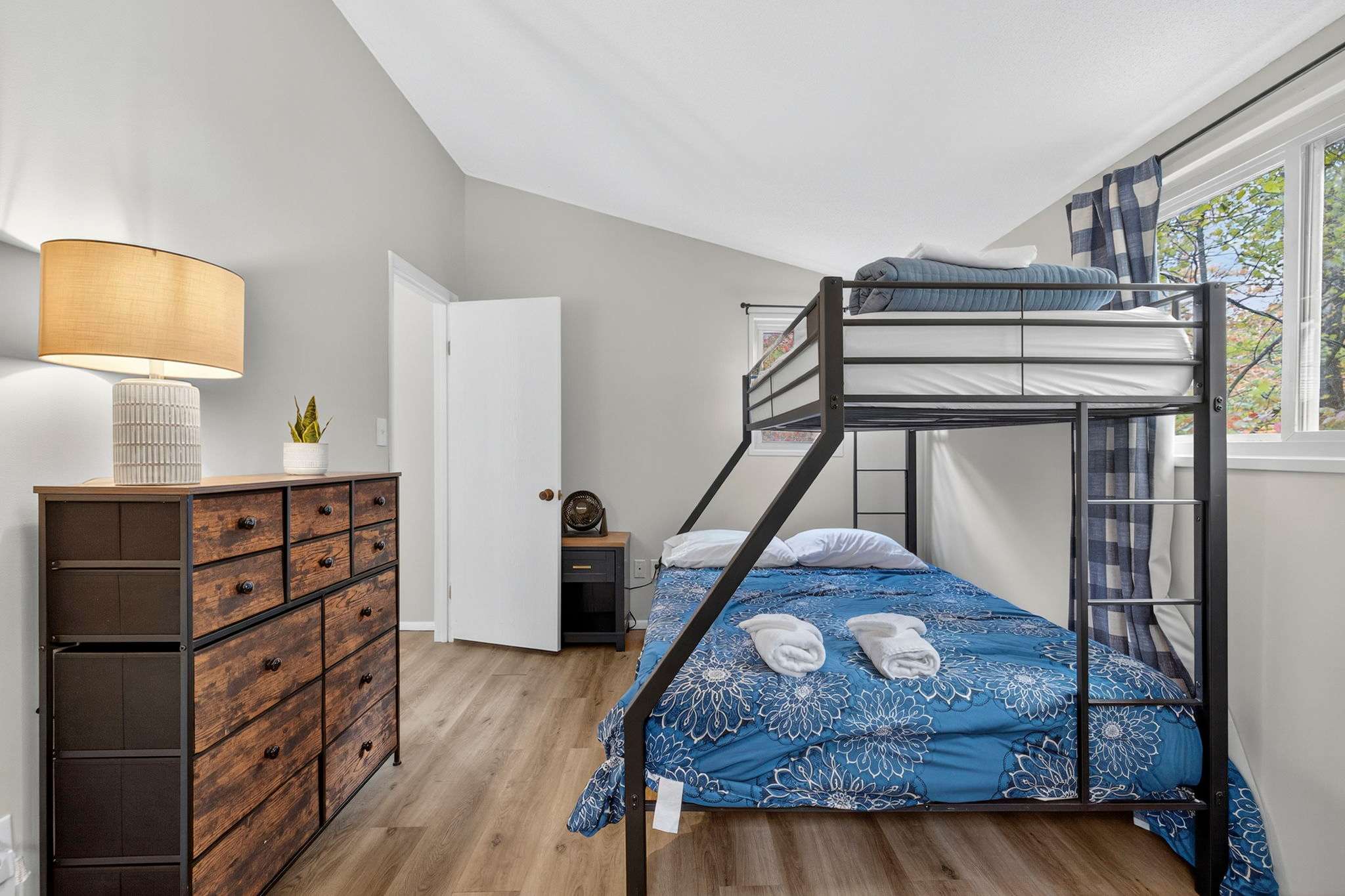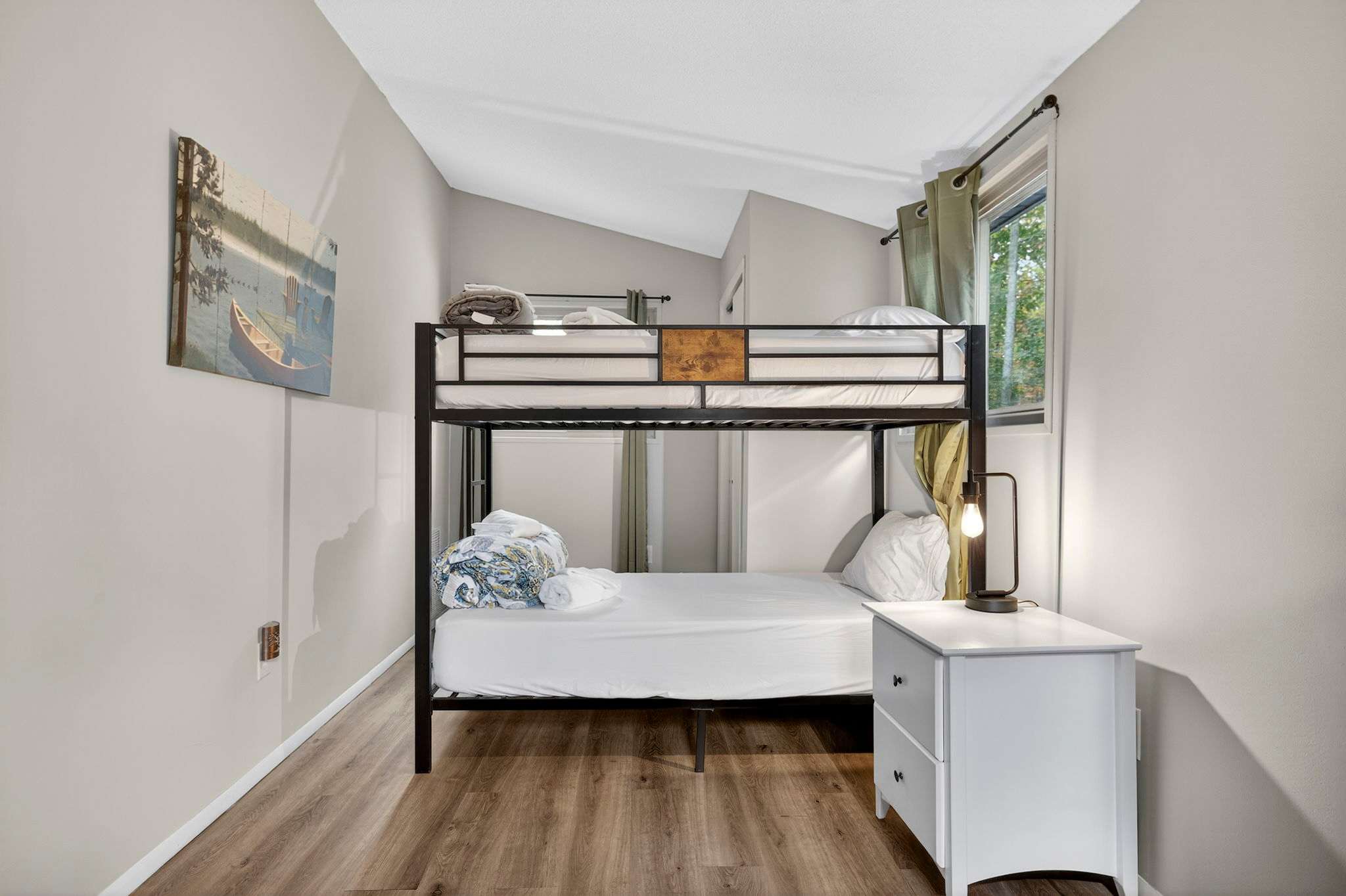 - 4 bedrooms, 2 with a queen bed in each, 1 with a queen/twin bunk bed (sleeps 3!), and 1 with a set of regular bunks