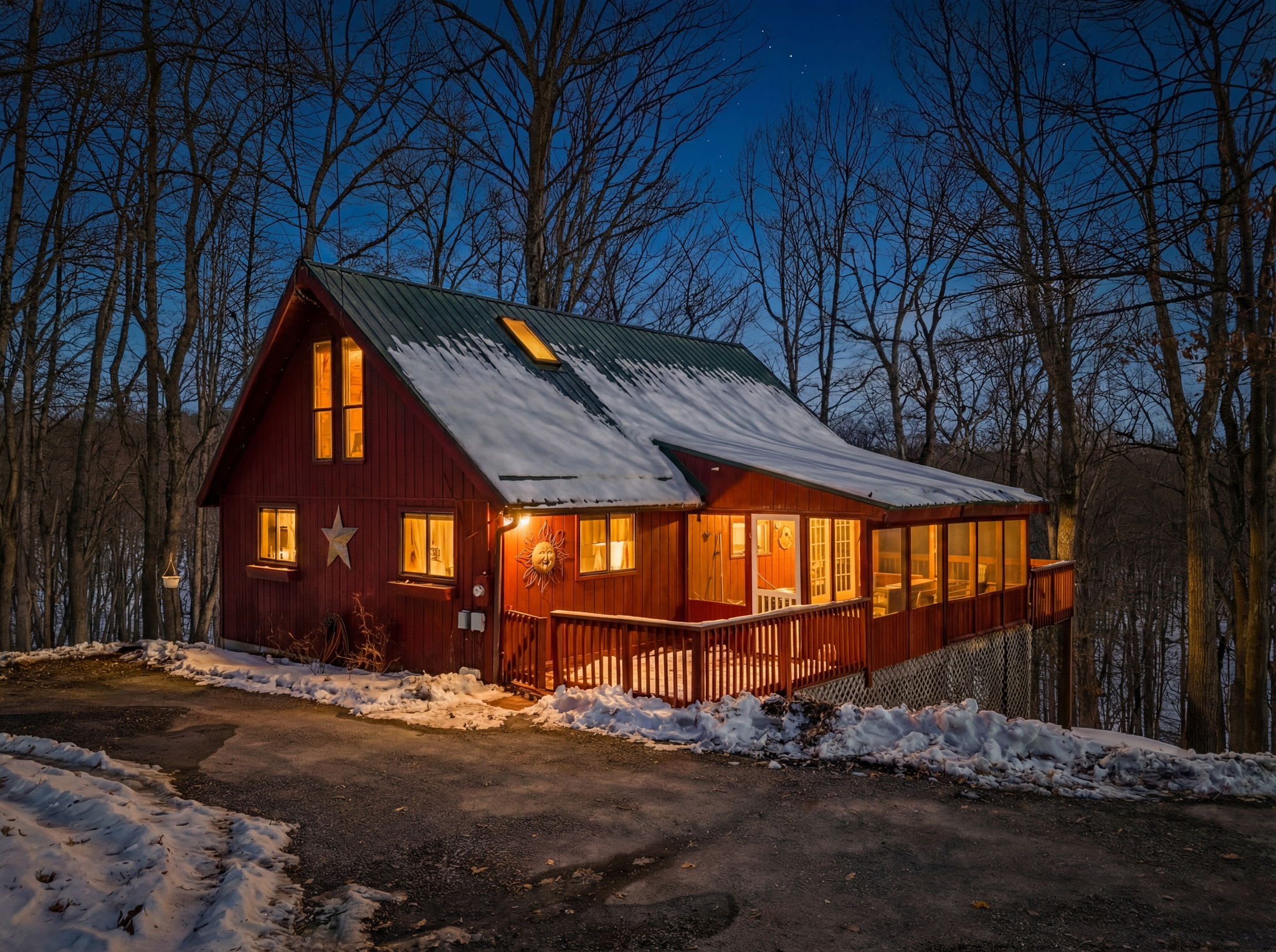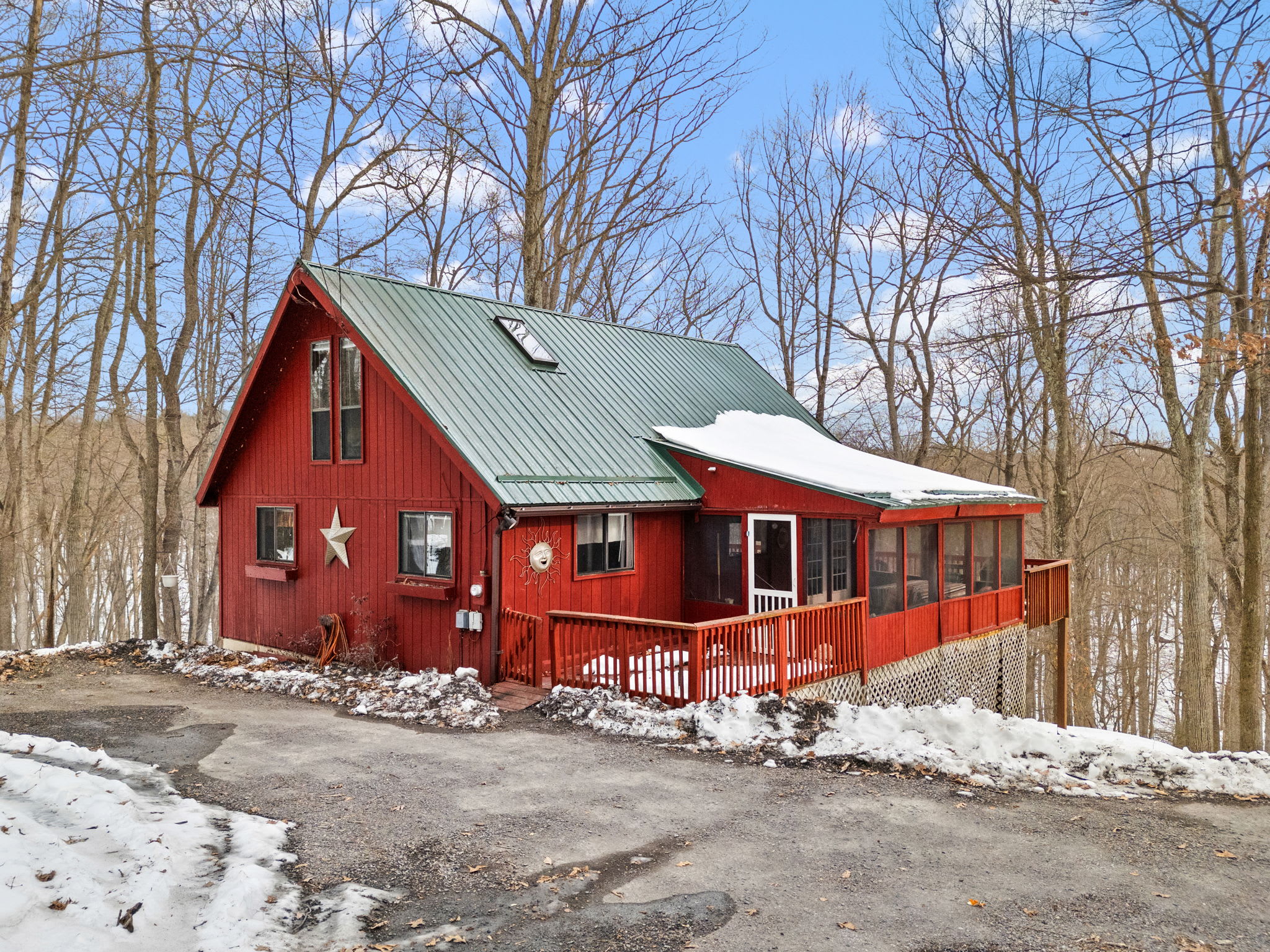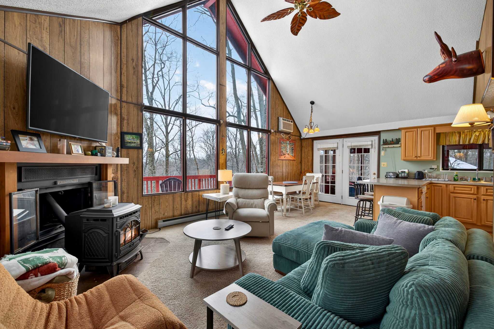 This thoughtfully designed cabin features an open main level filled with natural light from soaring windows that bring the outdoors in. Cozy up by the pellet stove, gather in the finished lower-level hangout space, or relax on one of the multiple decks and patios—each offering a different vantage point of the surrounding forest.