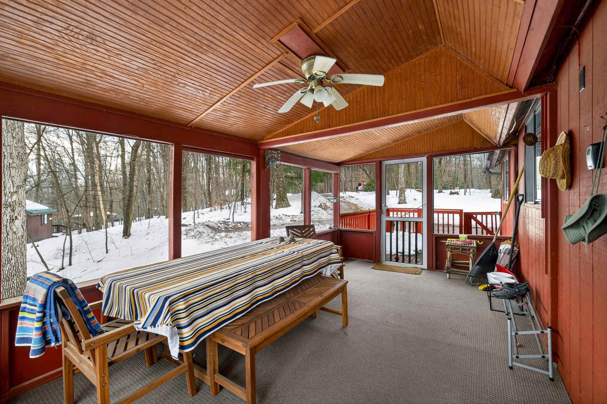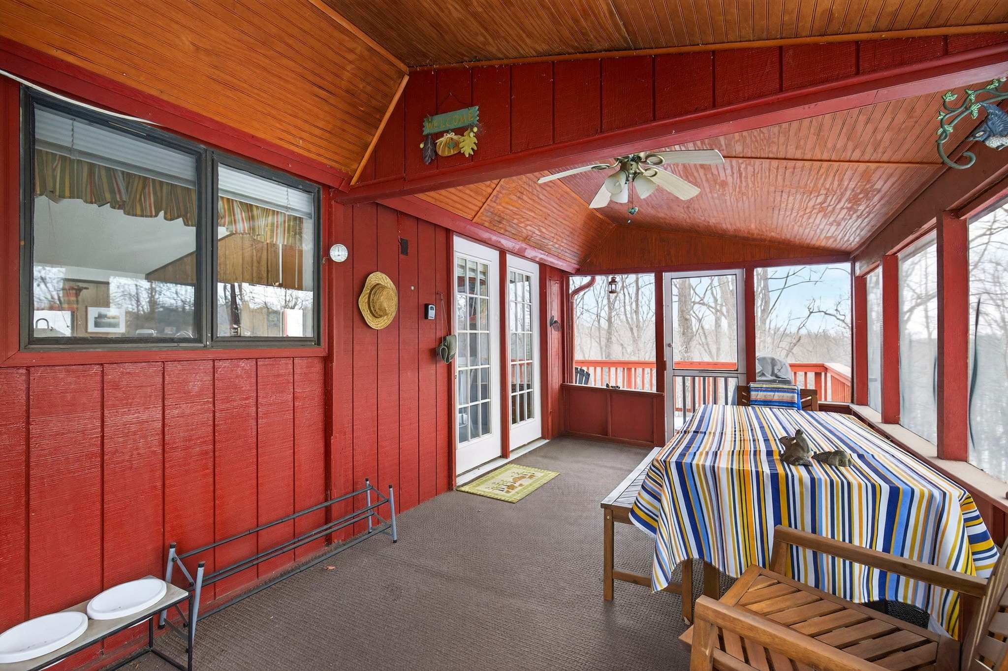 -Covered porch with dining table for meals al fresco