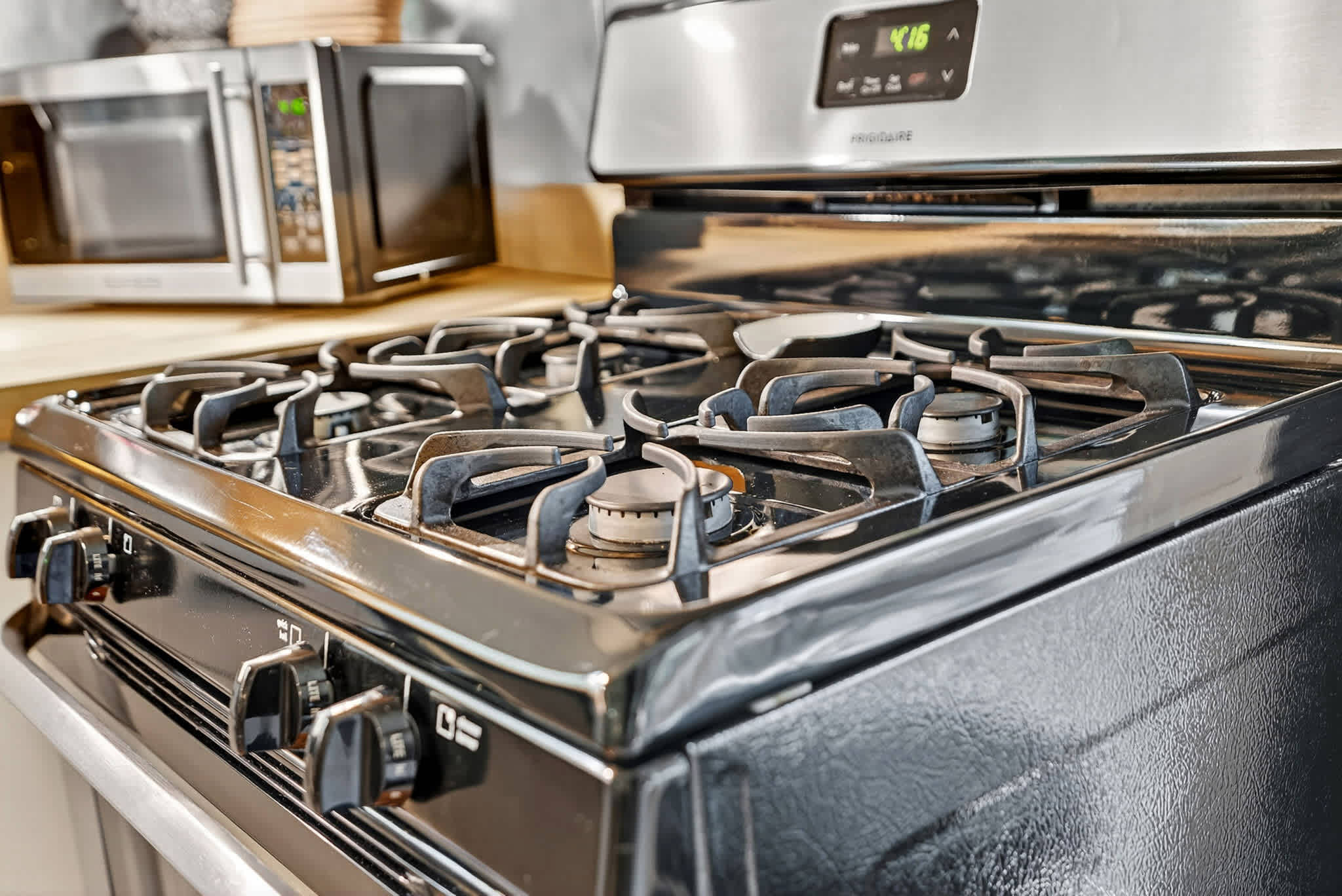 - Fully stocked kitchen with stainless steel appliances, refrigerator, dishwasher, gas oven/range, microwave, coffee maker, and blender