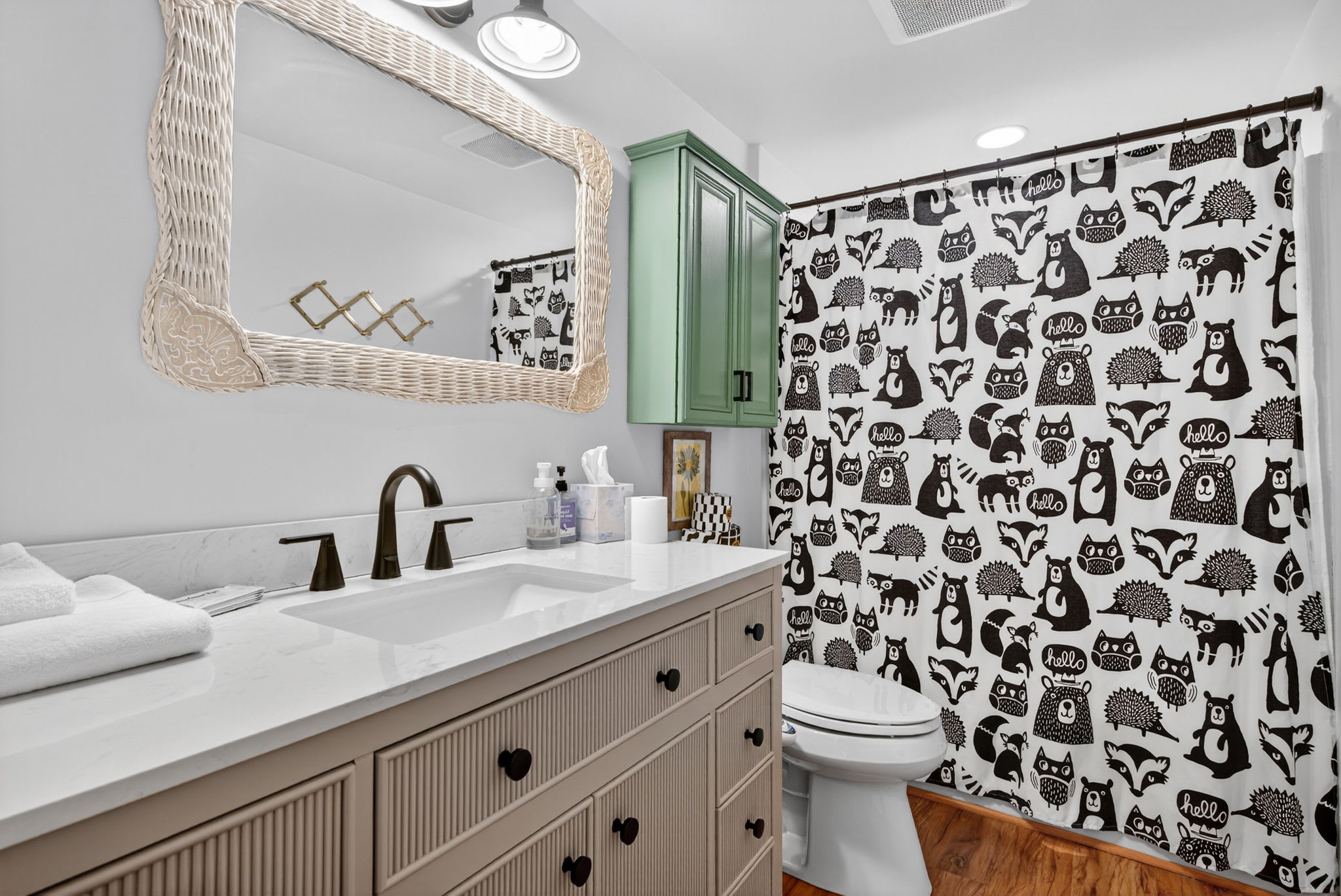- 1 bath on the main level (shower tub combo) w/spacious vanity and storage