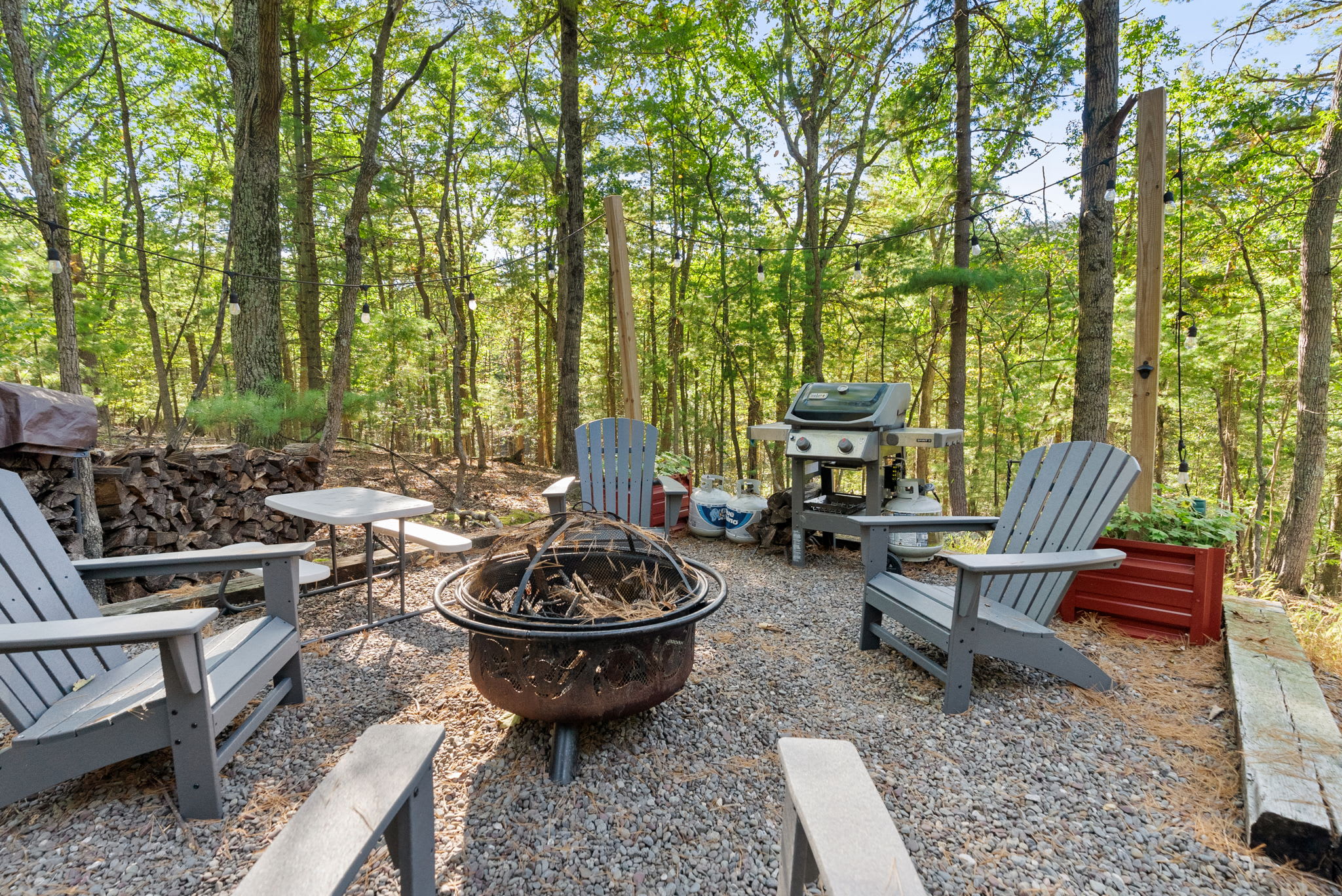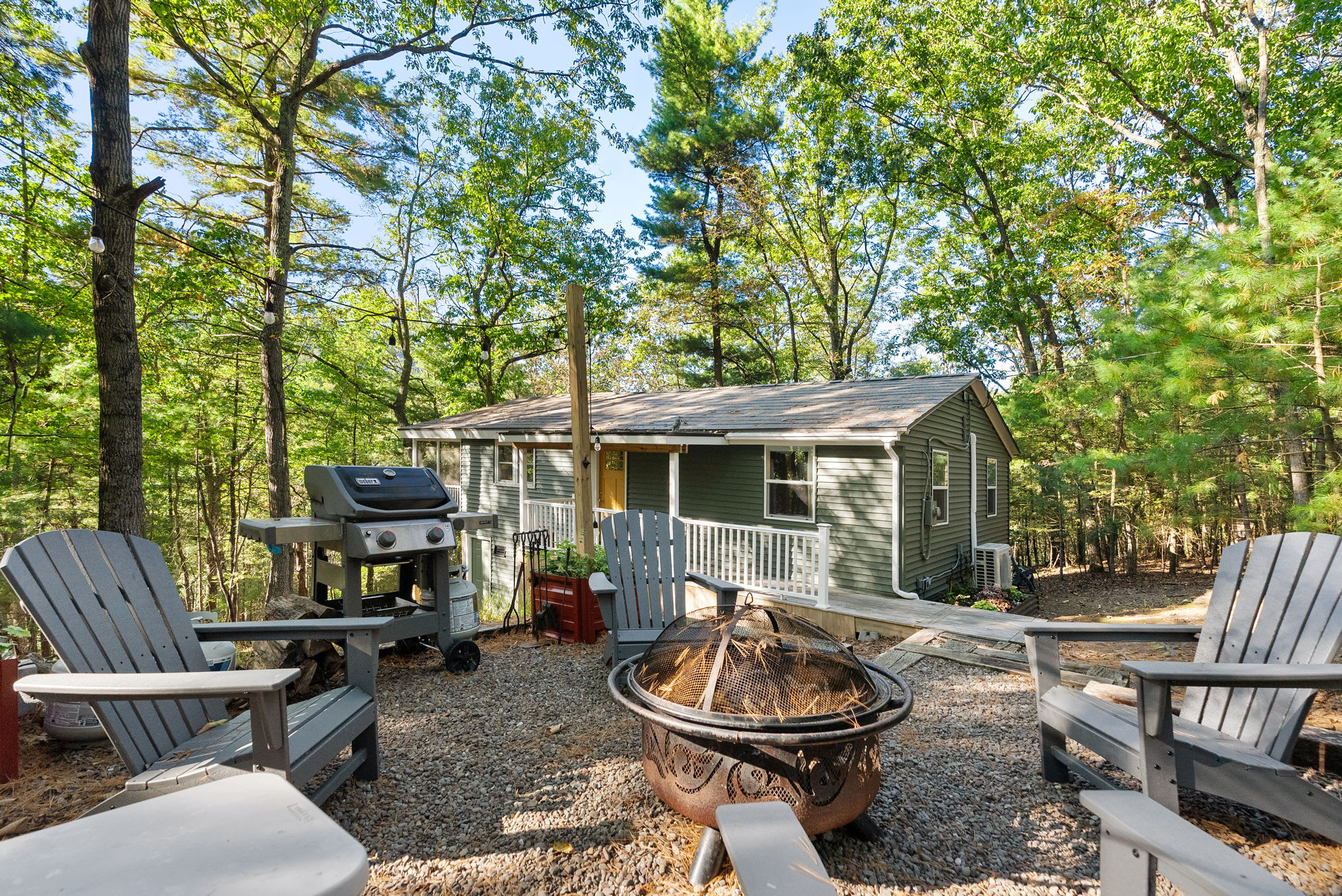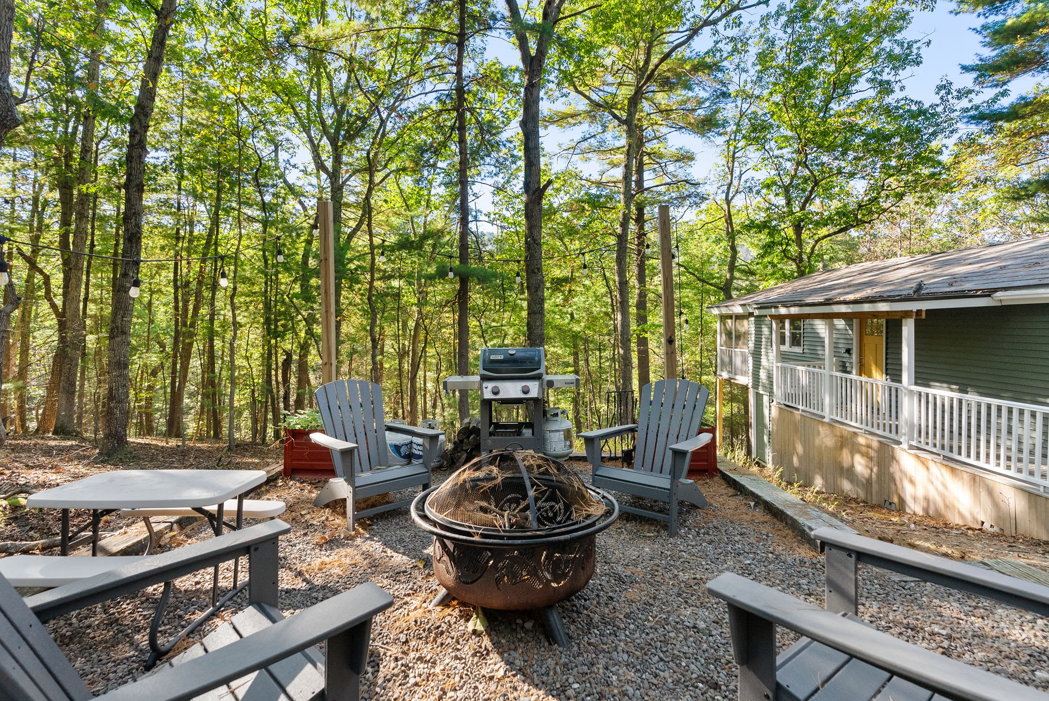 Step out to the screened-in porch, where comfortable seating invites you to linger over morning coffee, a good book, or a game of cards. Outside, you’ll find a propane grill, a fire pit surrounded by seating, and string lights that make the evenings feel magical.