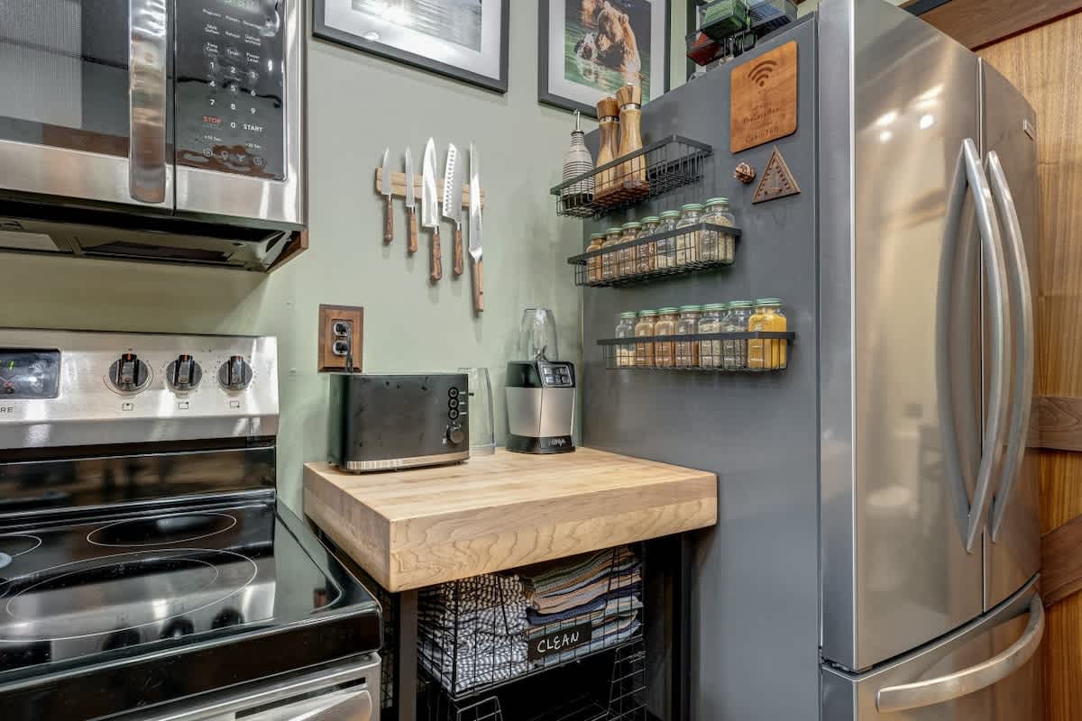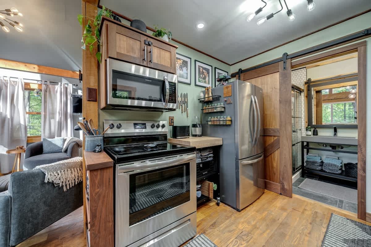 -Fully-equipped kitchen with stove/oven, microwave, and refrigerator