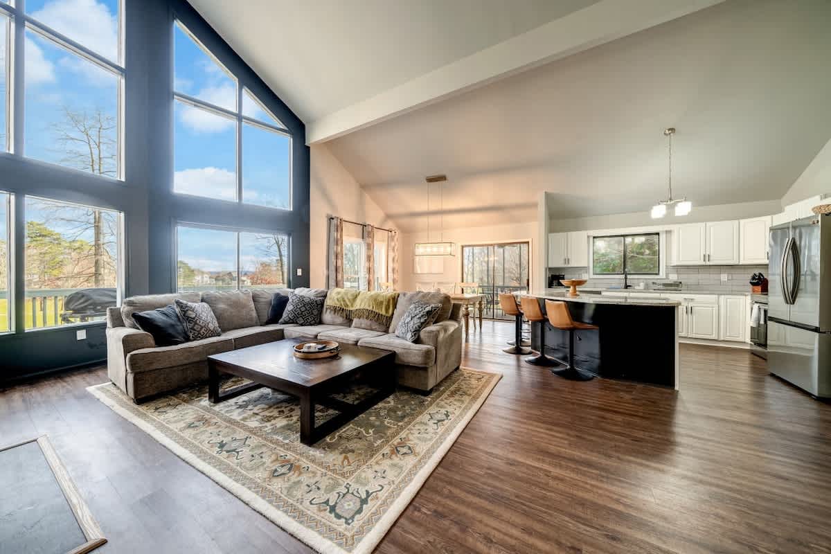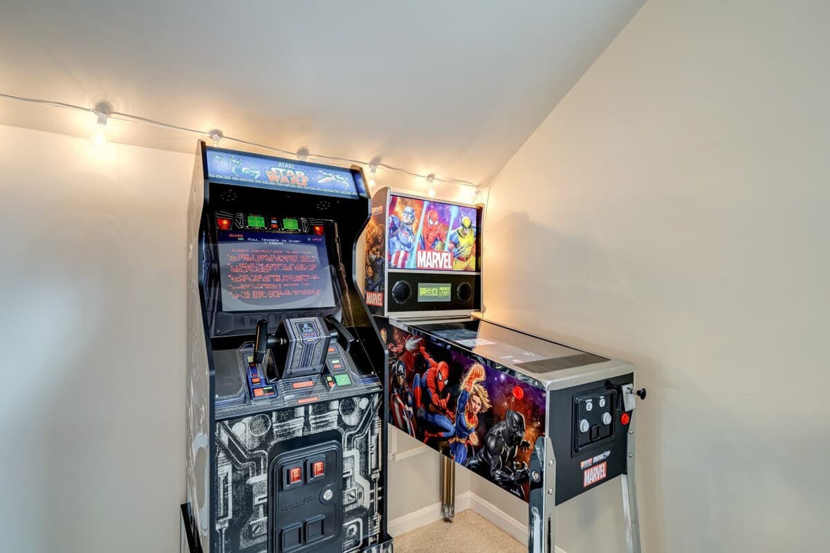 The kitchen is well equipped and provides the perfect space for entertaining. The living room has ample seating and a huge coffee table, perfect for puzzles. Upstairs in the loft you will find a game room with an air hockey table that can double as a ping pong table and three arcade machines; Golden Tee, Star Wars, and Marvel Pin Ball. There is a 40" TV mounted over the air hockey table so everyone can keep up with the most current scores. There are also outdoor games like croquet, lawn bowling and large jenga.