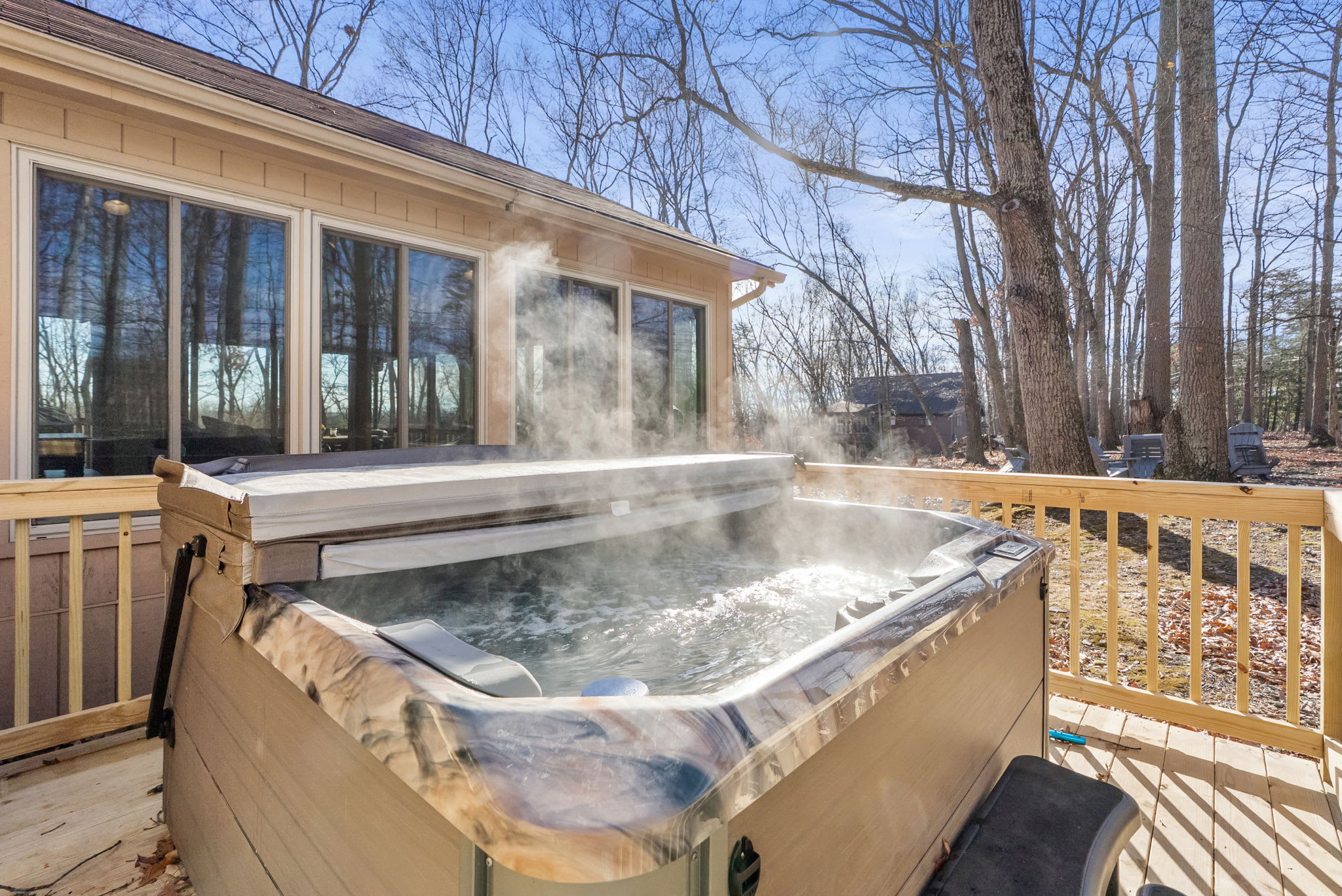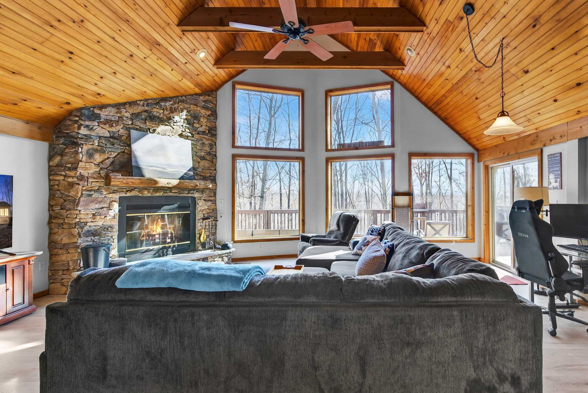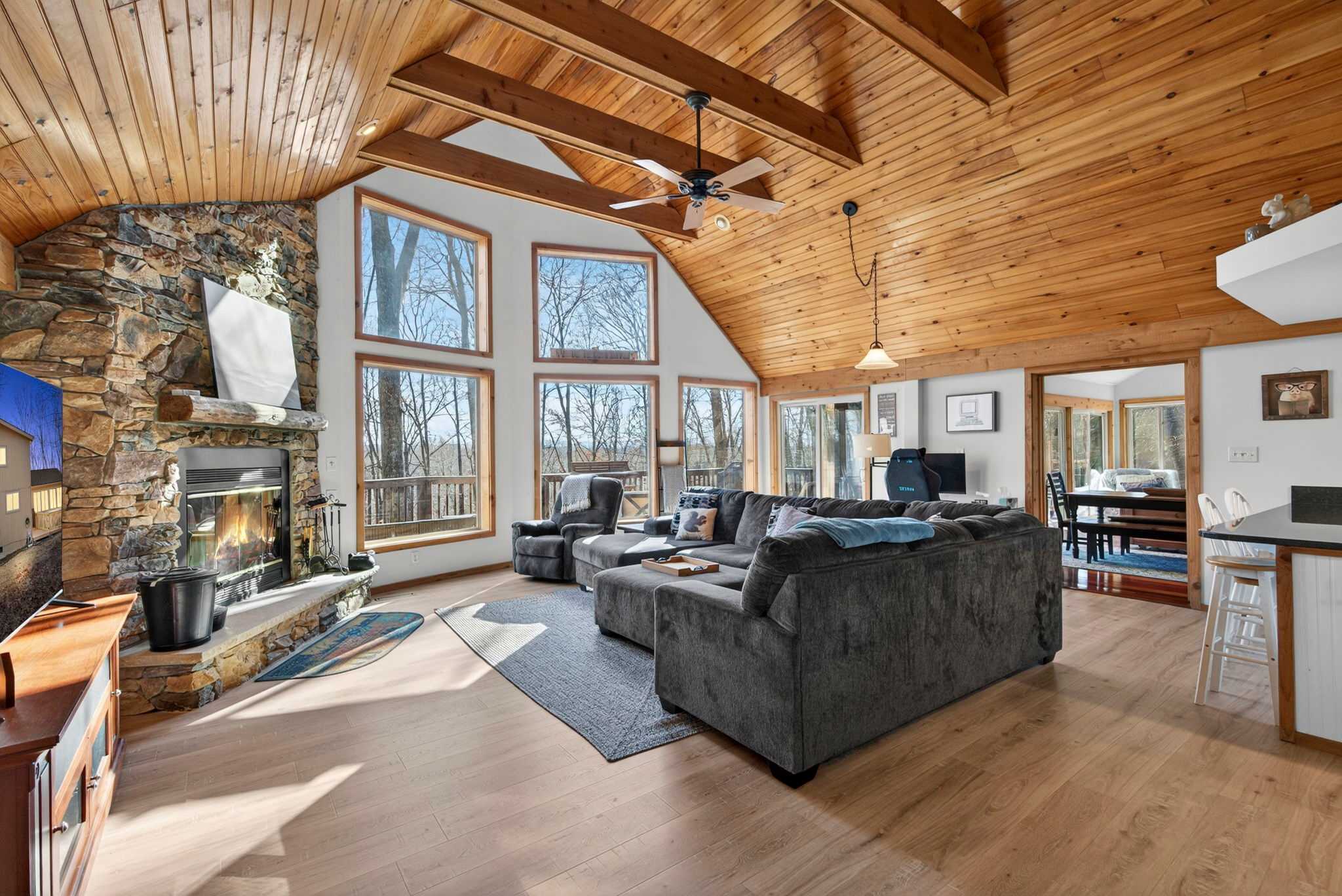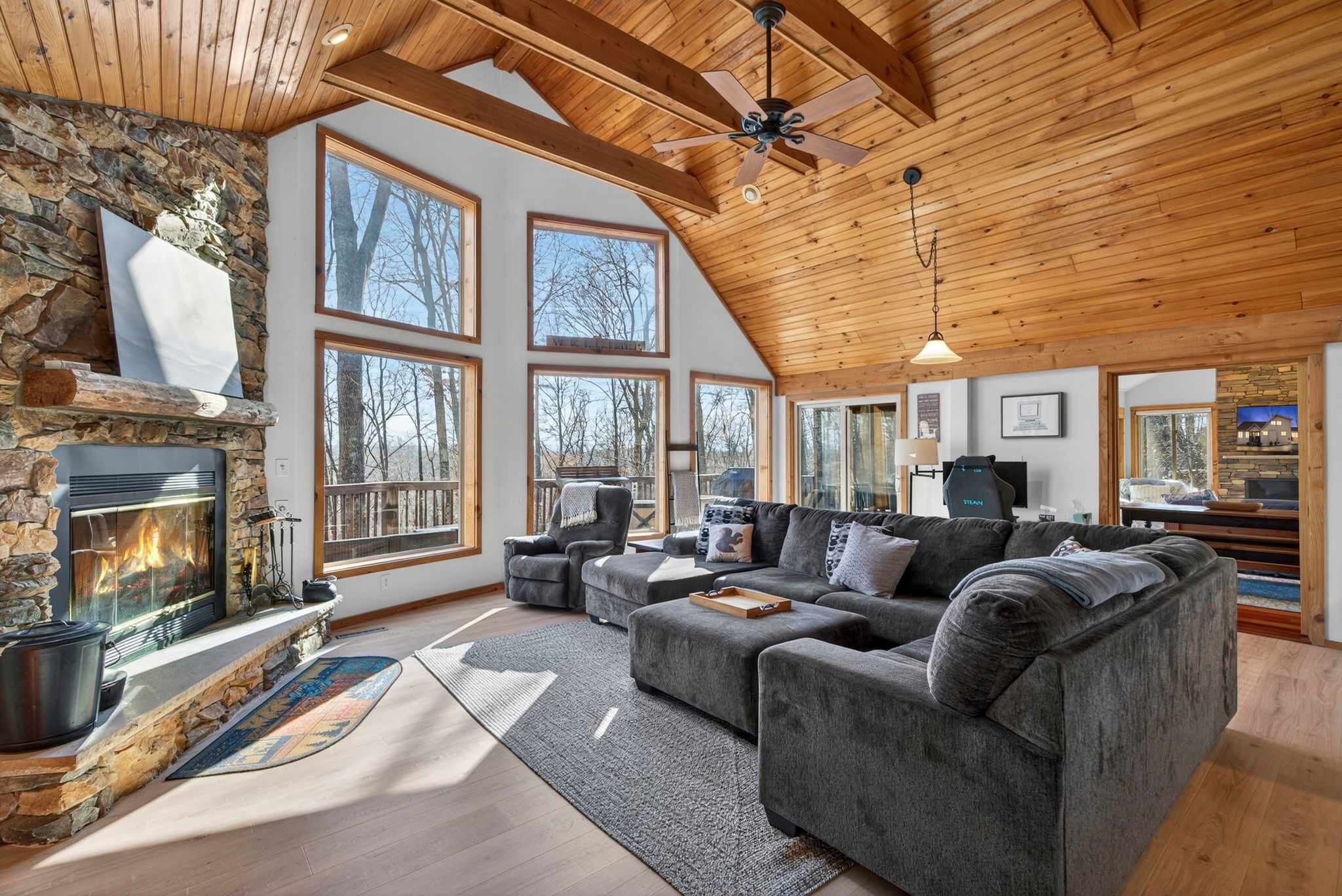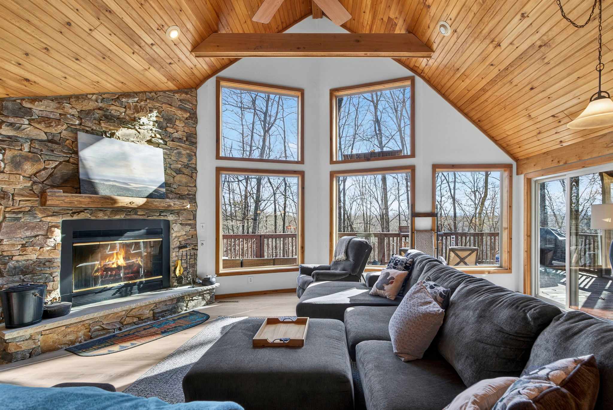 This beautiful home features an open concept living room, fully equipped kitchen and hot tub, for year 'round use. The sunroom is a stunning space surrounded by windows and has access to a screened in porch, perfect for outdoor dining or taking in the views. The large deck is furnished with a gas grill, fire pit and seating to spare - including a built in bar. Guests also have access to The Woods Resort!!