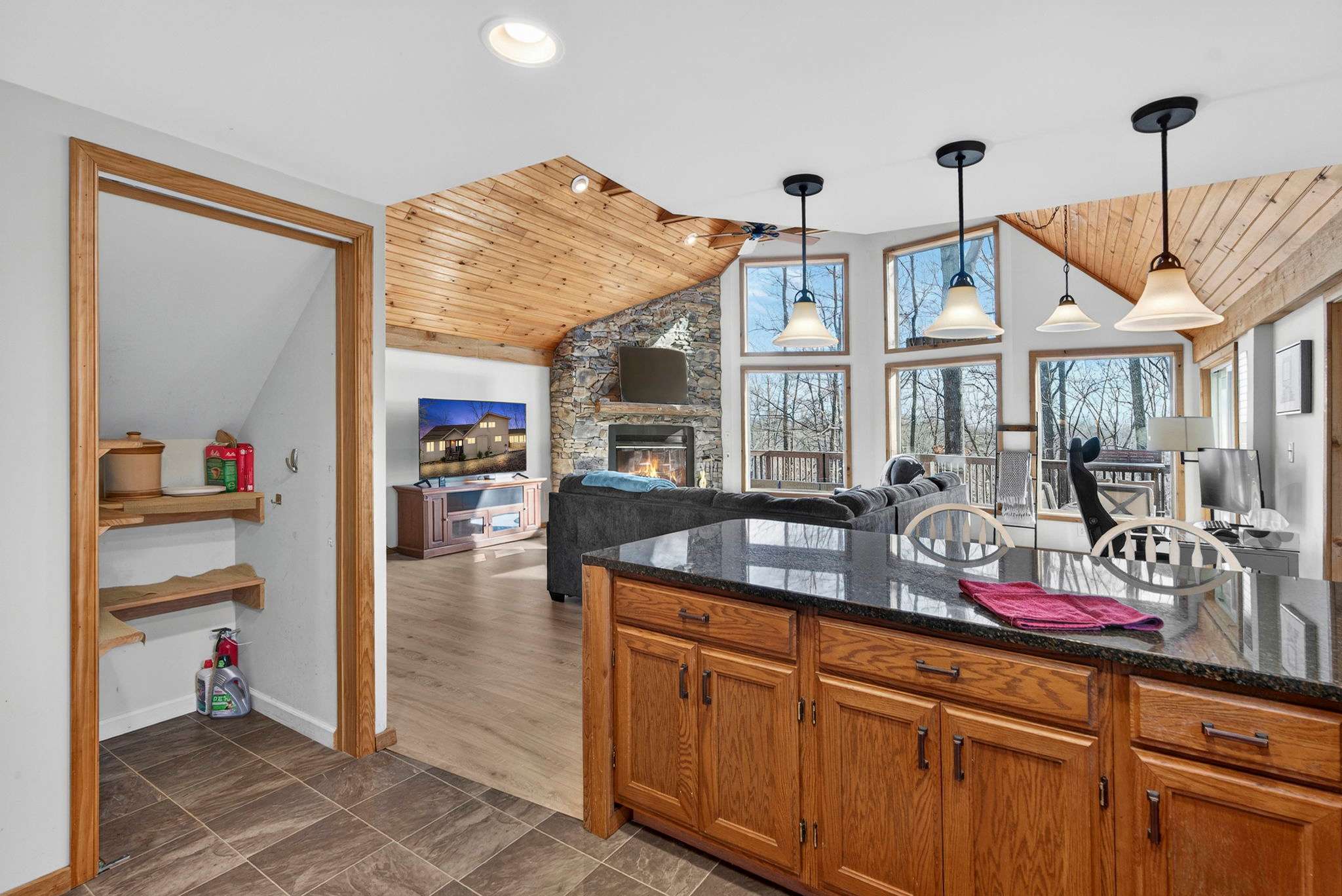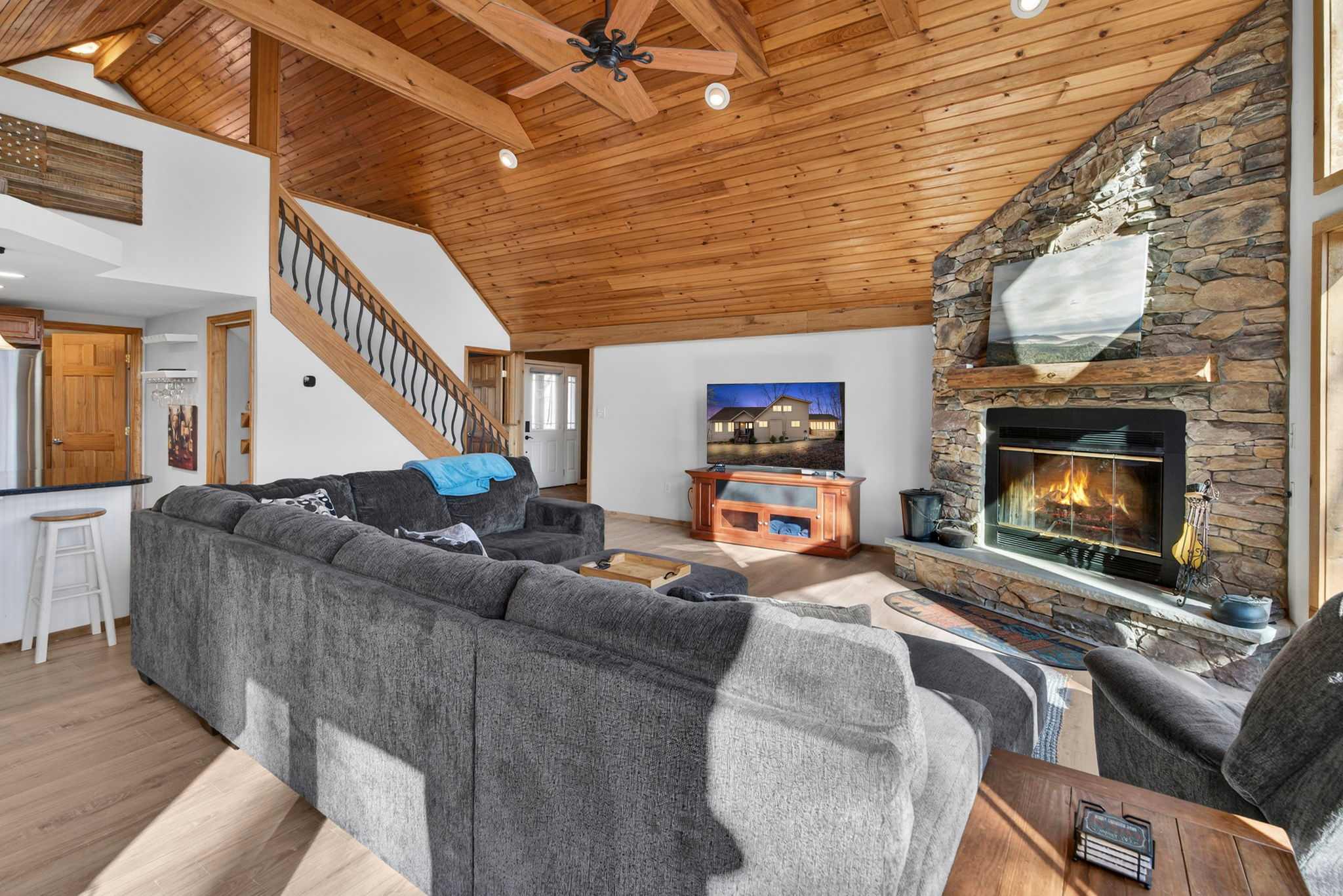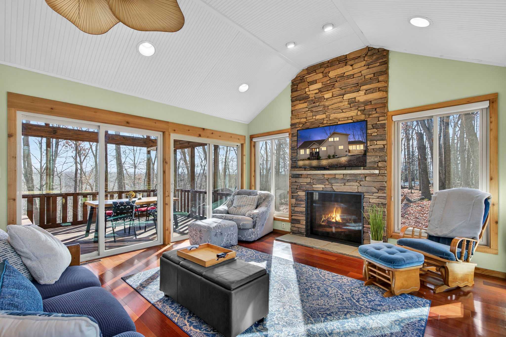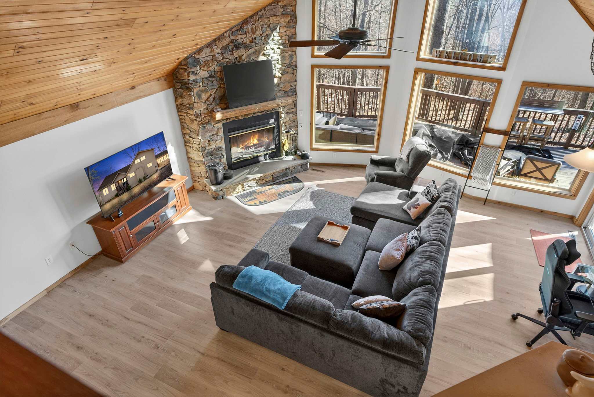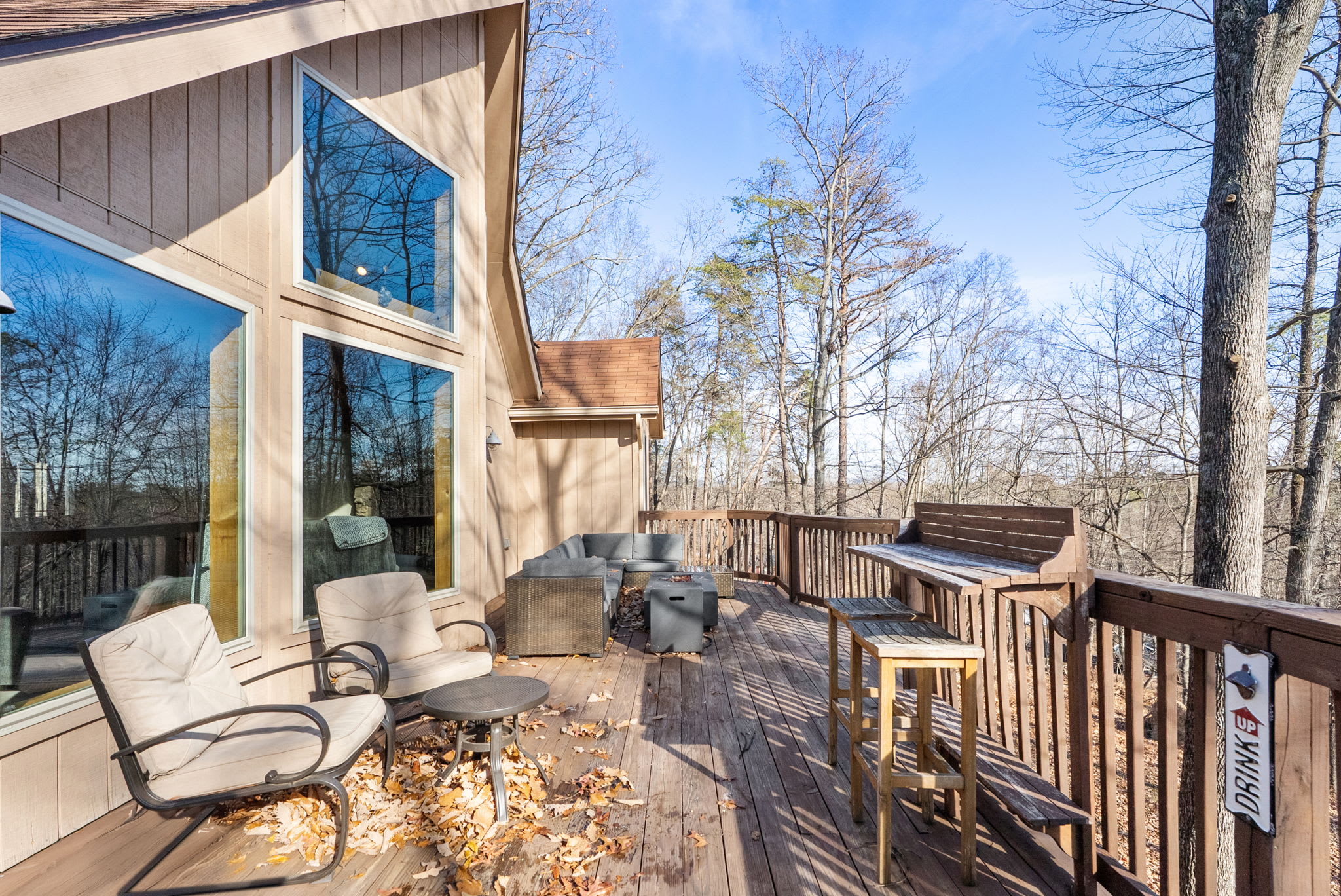 This beautiful home features an open concept living room, fully equipped kitchen and hot tub, for year 'round use. The sunroom is a stunning space surrounded by windows and has access to a screened in porch, perfect for outdoor dining or taking in the views. The large deck is furnished with a gas grill, fire pit and seating to spare - including a built in bar. Guests also have access to The Woods Resort!!