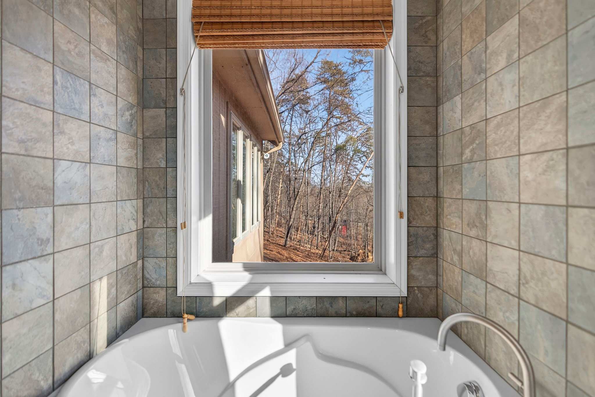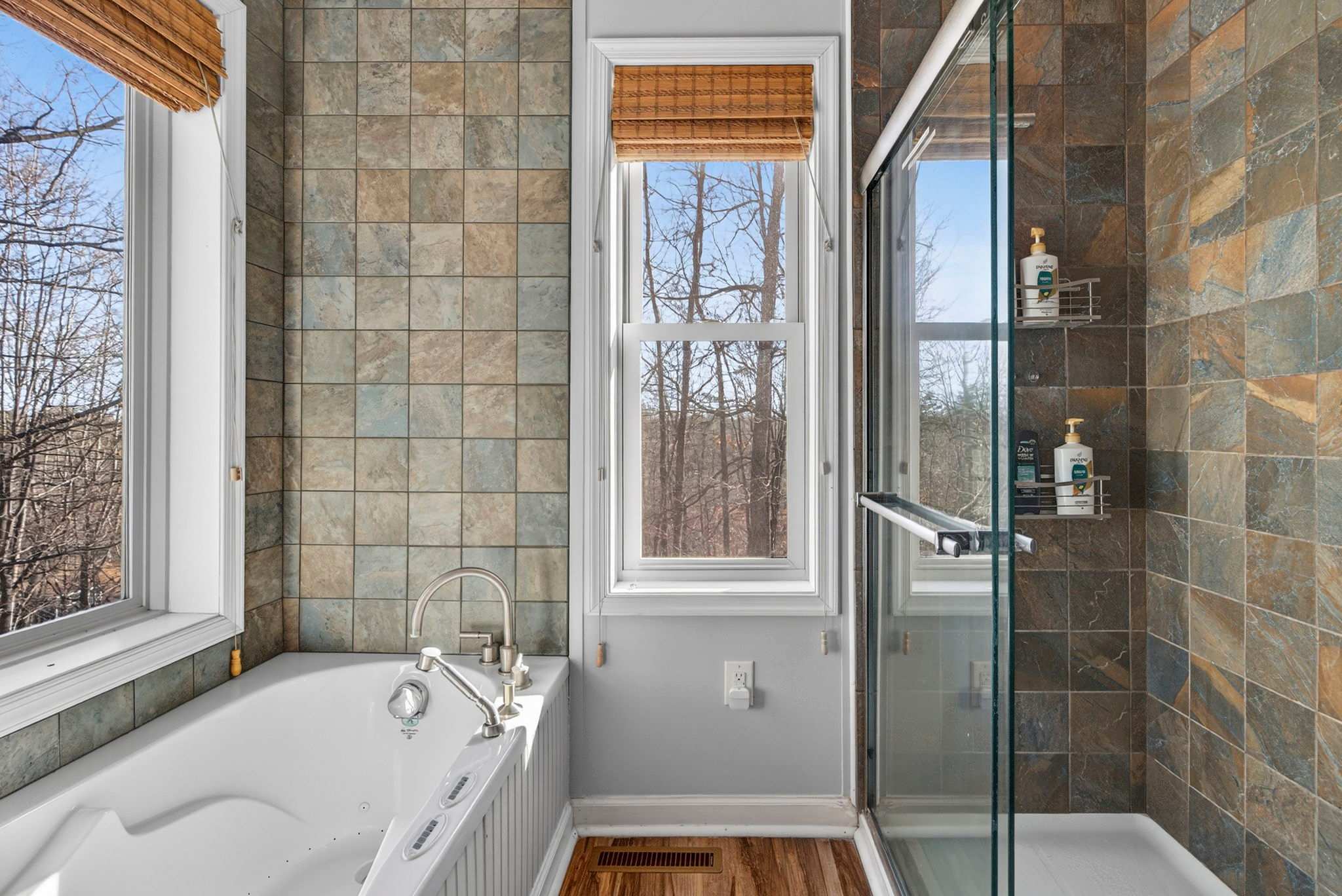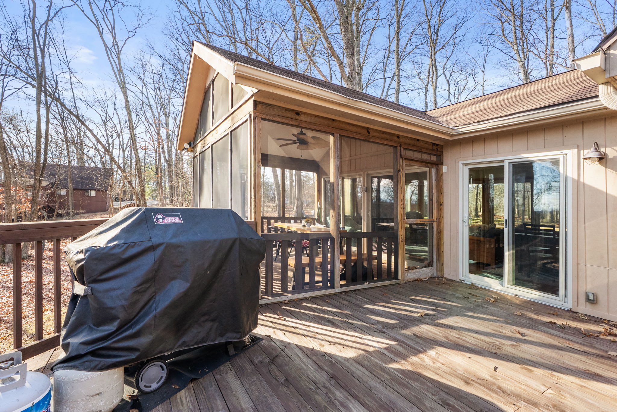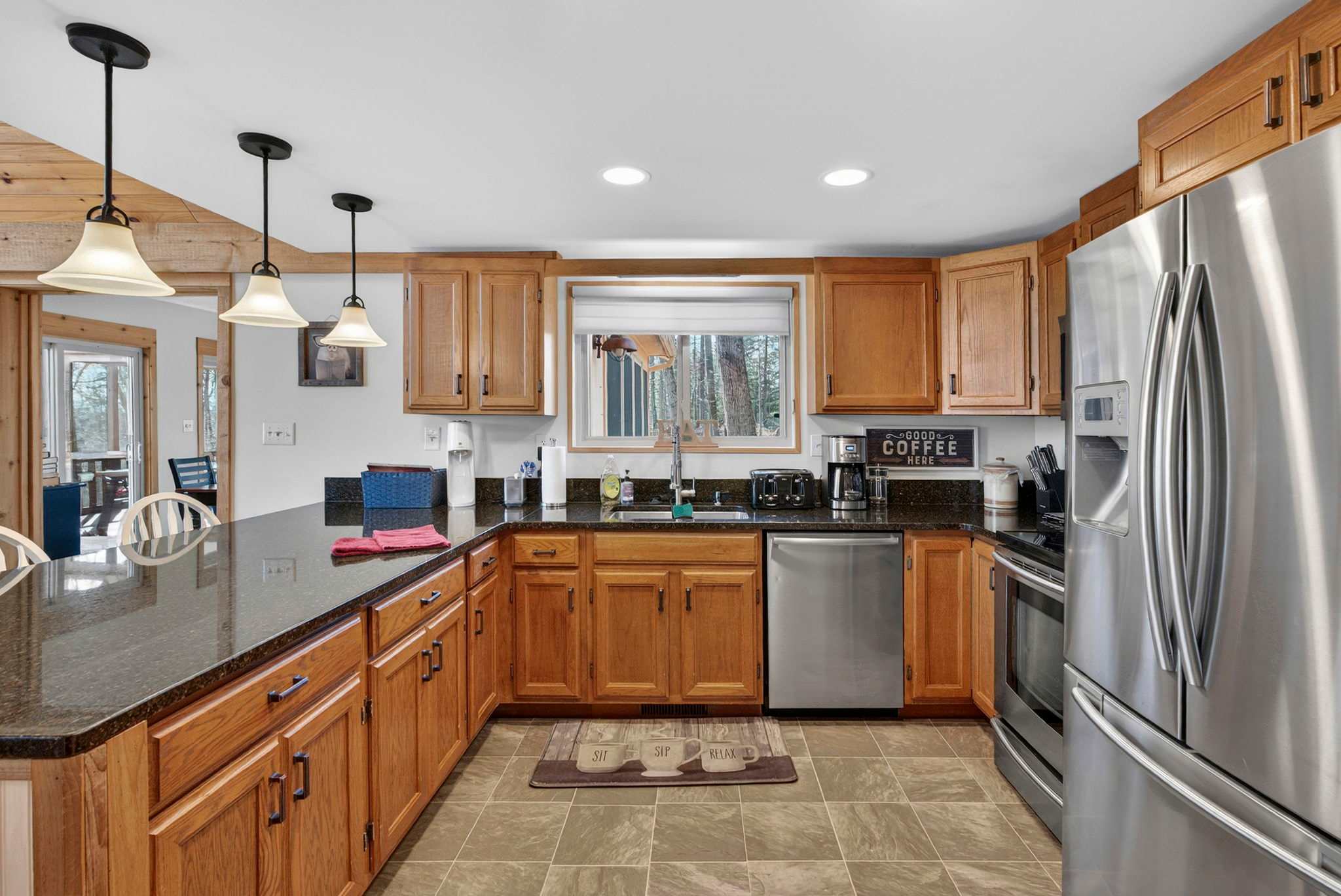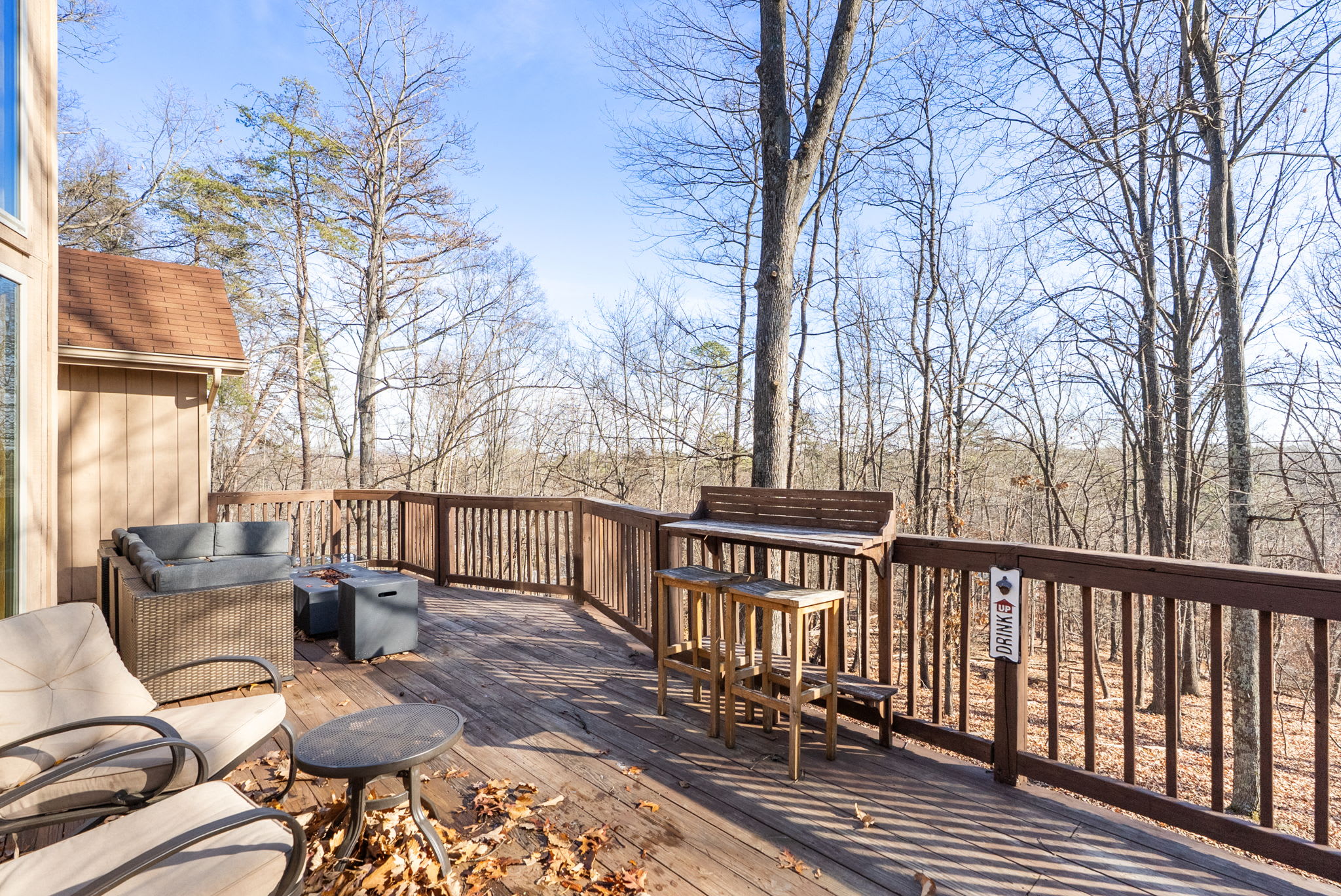 This beautiful home features an open concept living room, fully equipped kitchen and hot tub, for year 'round use. The sunroom is a stunning space surrounded by windows and has access to a screened in porch, perfect for outdoor dining or taking in the views. The large deck is furnished with a gas grill, fire pit and seating to spare - including a built in bar. Guests also have access to The Woods Resort!!
