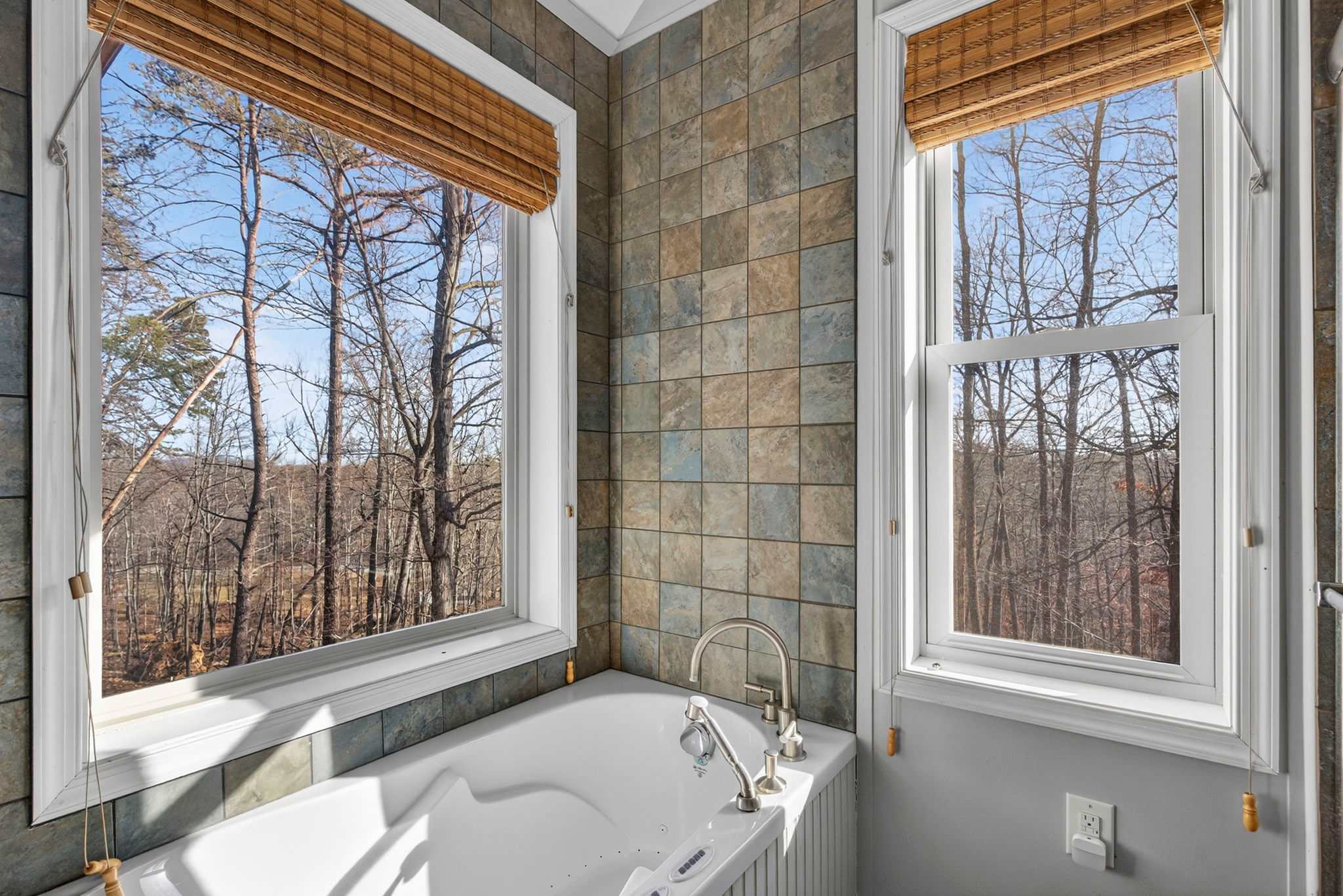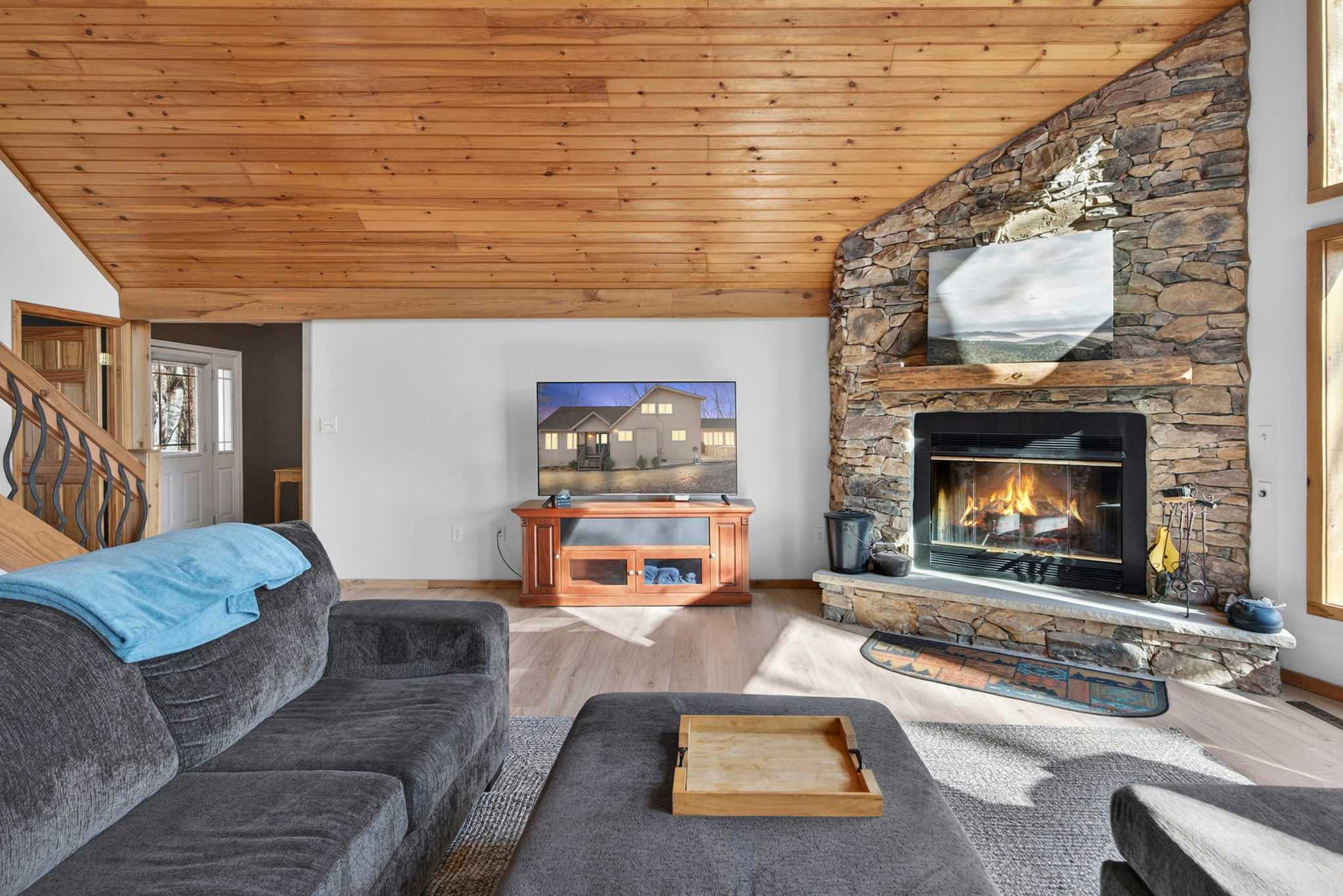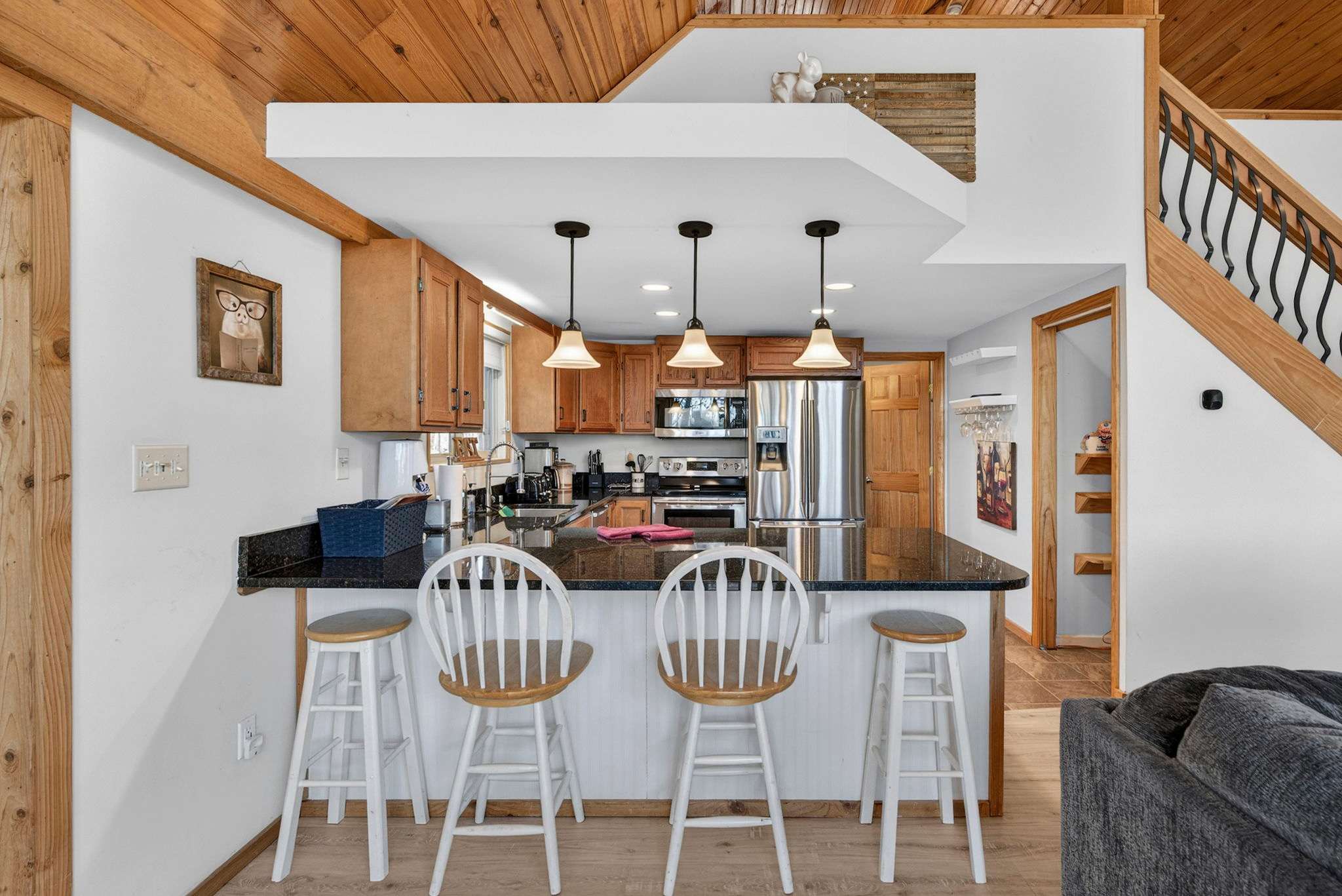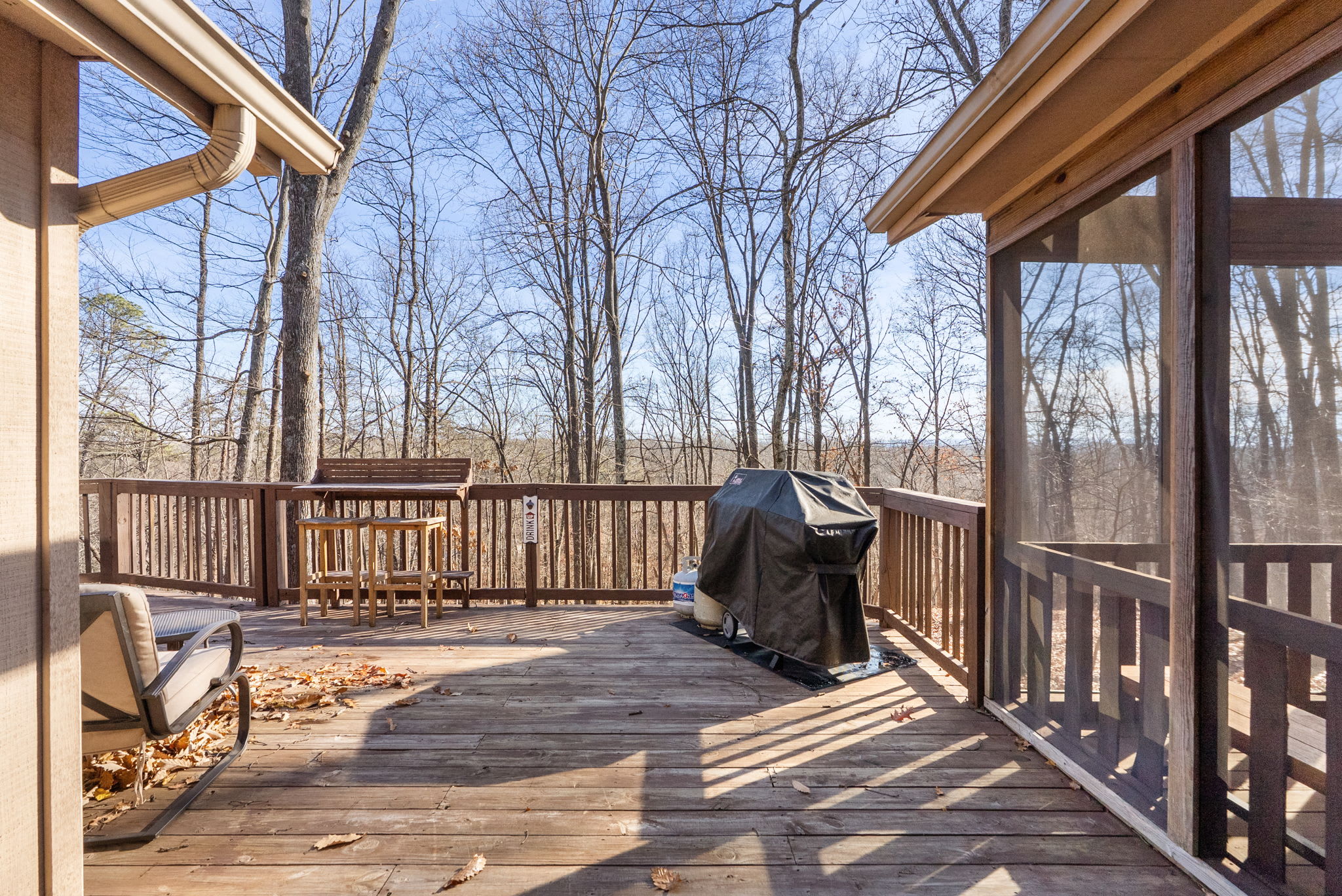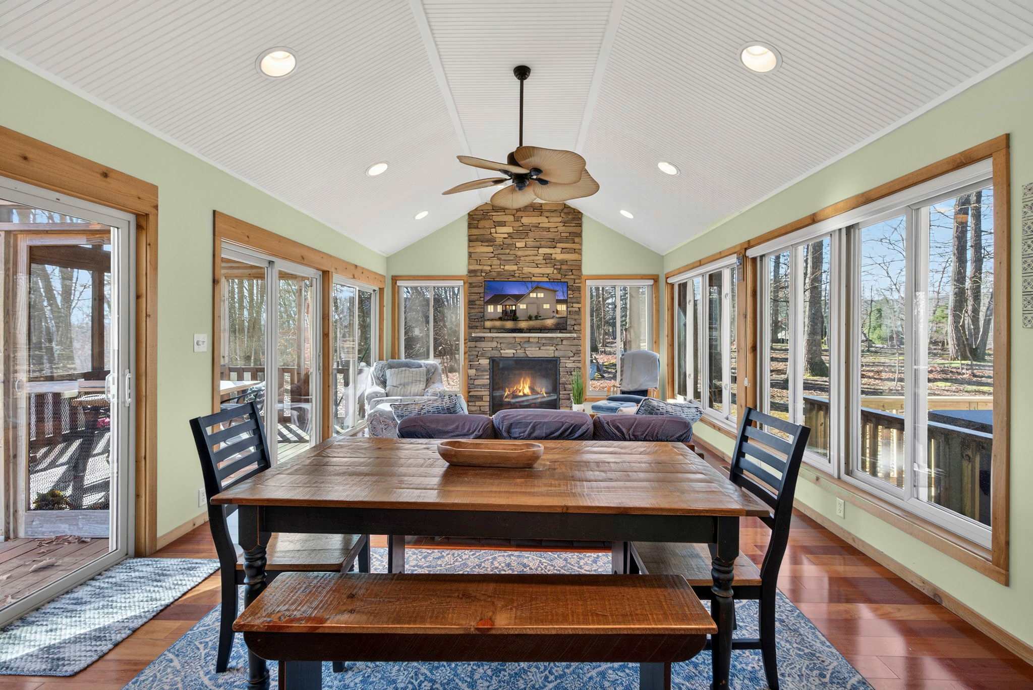 This beautiful home features an open concept living room, fully equipped kitchen and hot tub, for year 'round use. The sunroom is a stunning space surrounded by windows and has access to a screened in porch, perfect for outdoor dining or taking in the views. The large deck is furnished with a gas grill, fire pit and seating to spare - including a built in bar. Guests also have access to The Woods Resort!!