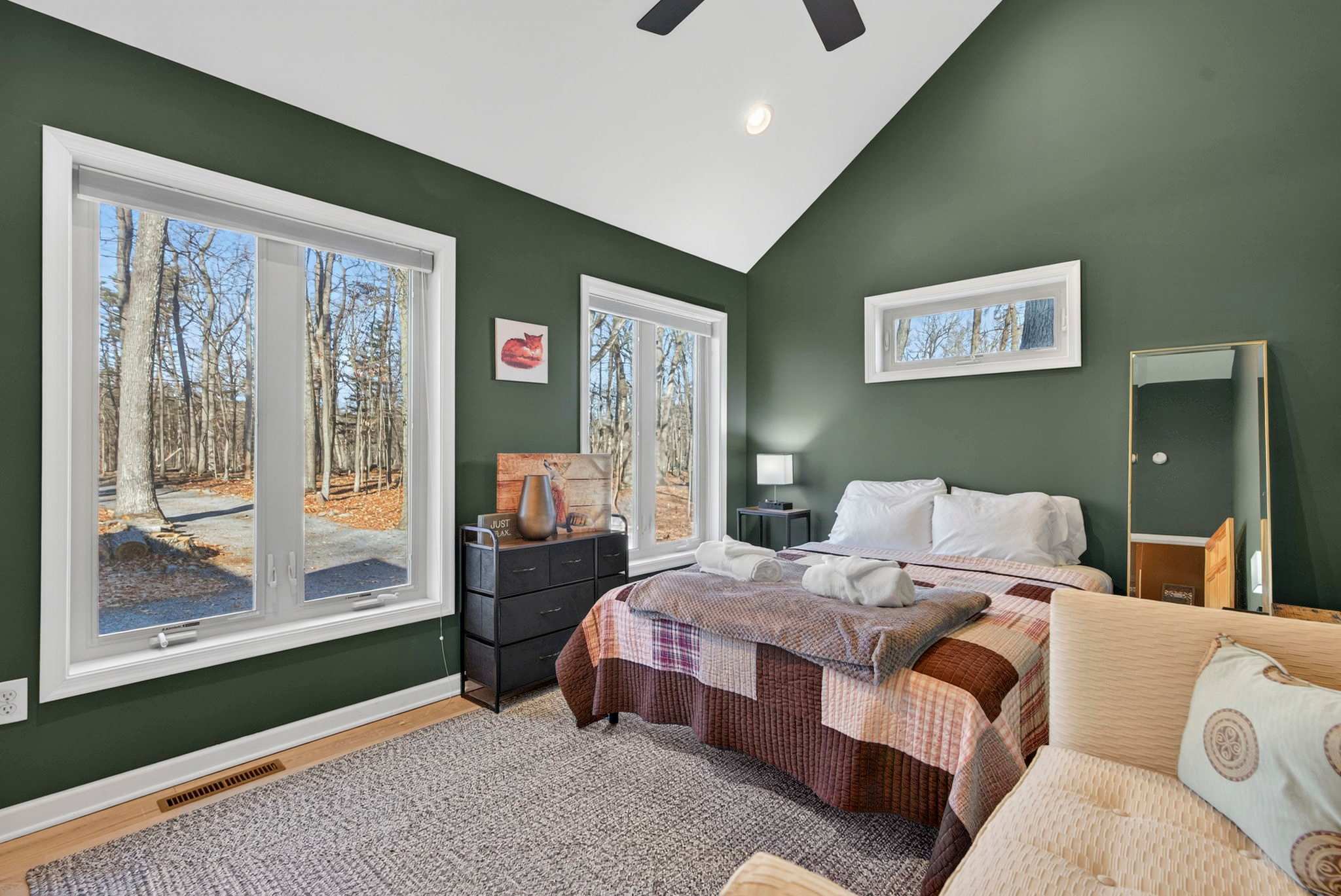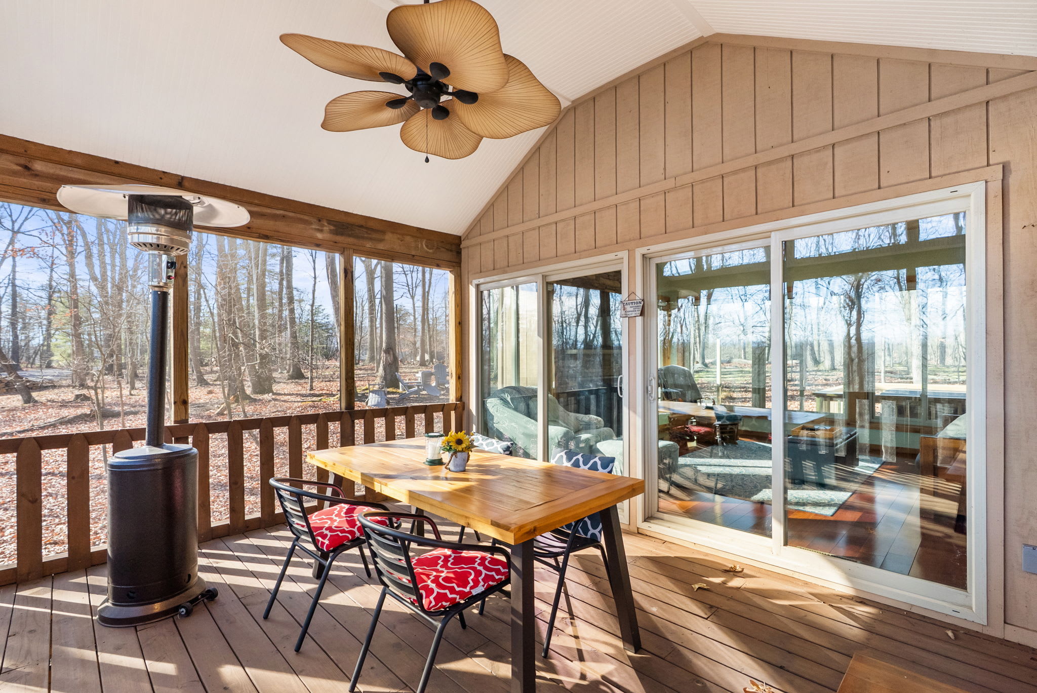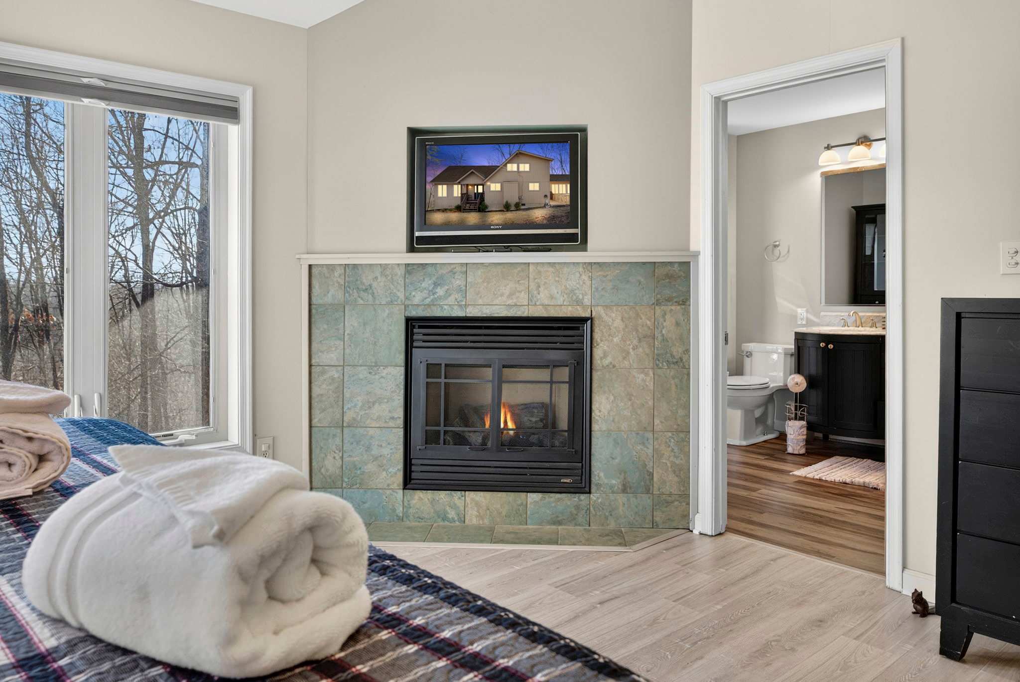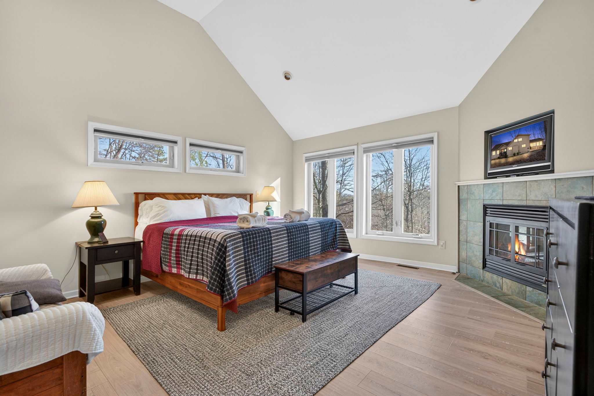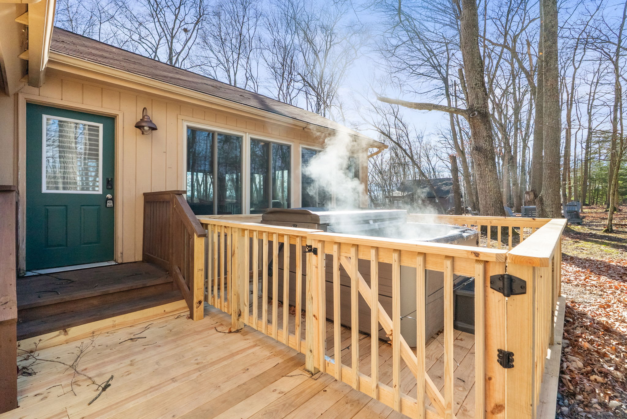This beautiful home features an open concept living room, fully equipped kitchen and hot tub, for year ’round use. The sunroom is a stunning space surrounded by windows and has access to a screened in porch, perfect for outdoor dining or taking in the views. The large deck is furnished with a gas grill, fire pit and seating to spare – including a built in bar. Guests also have access to The Woods Resort!!