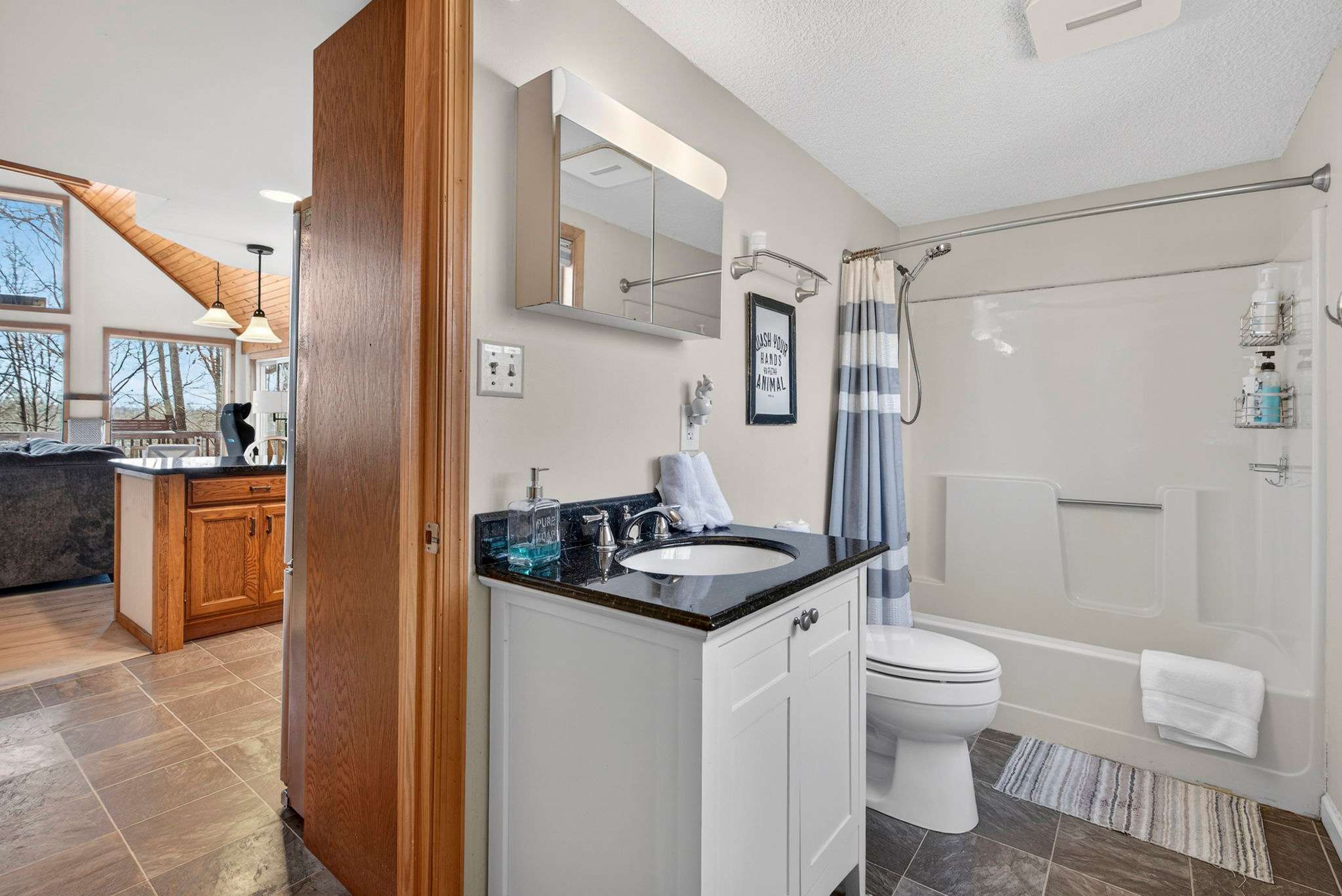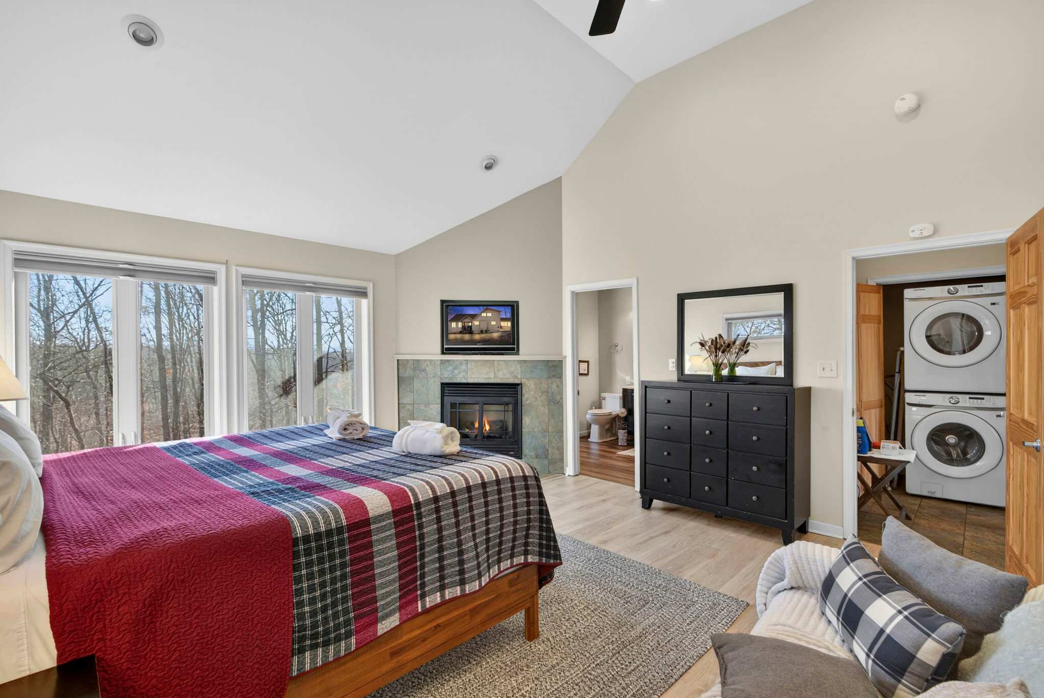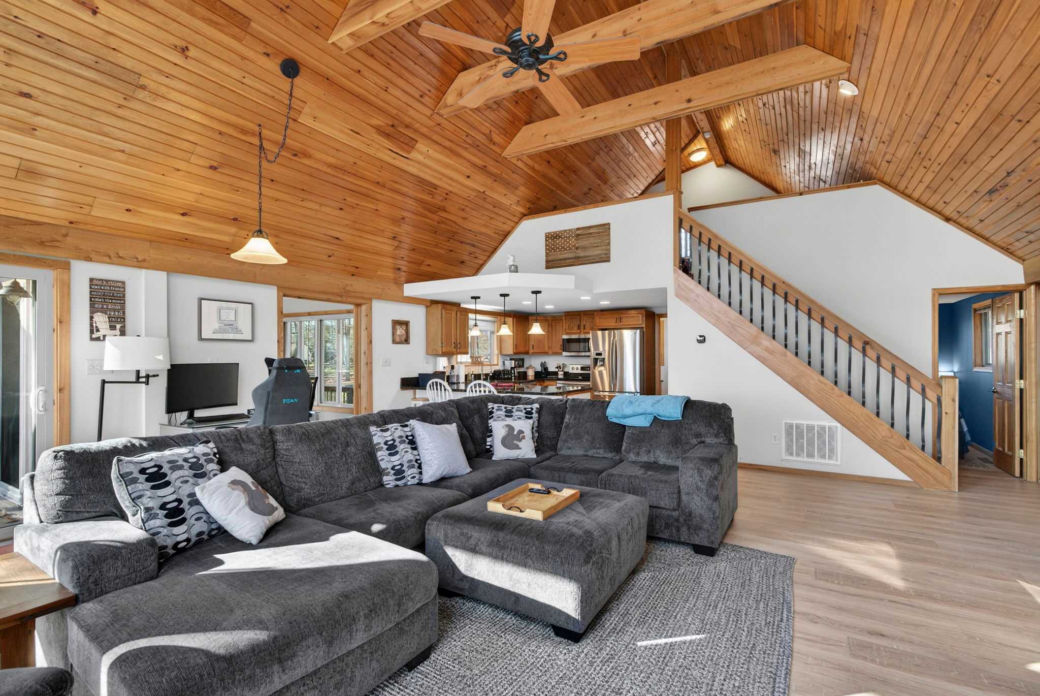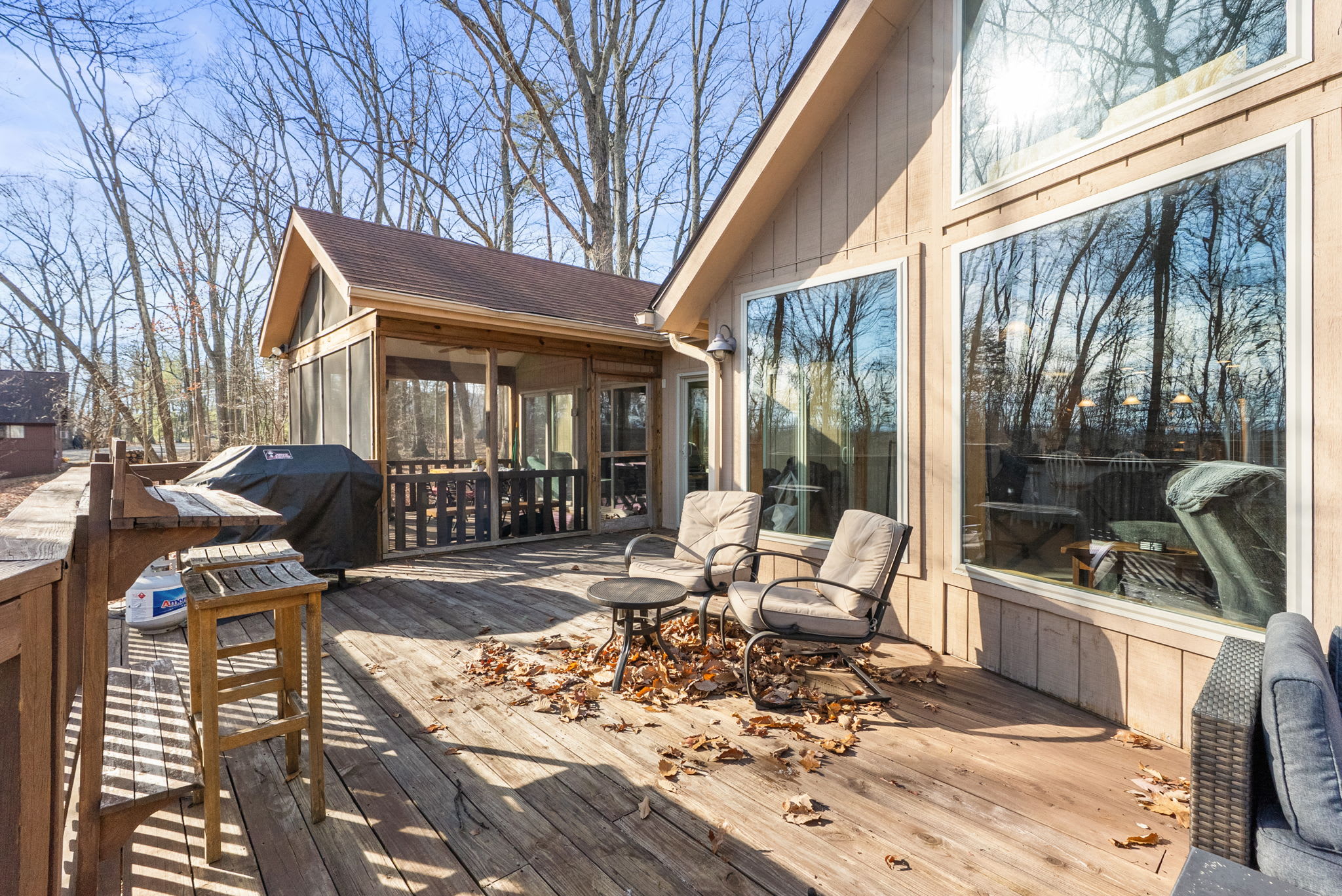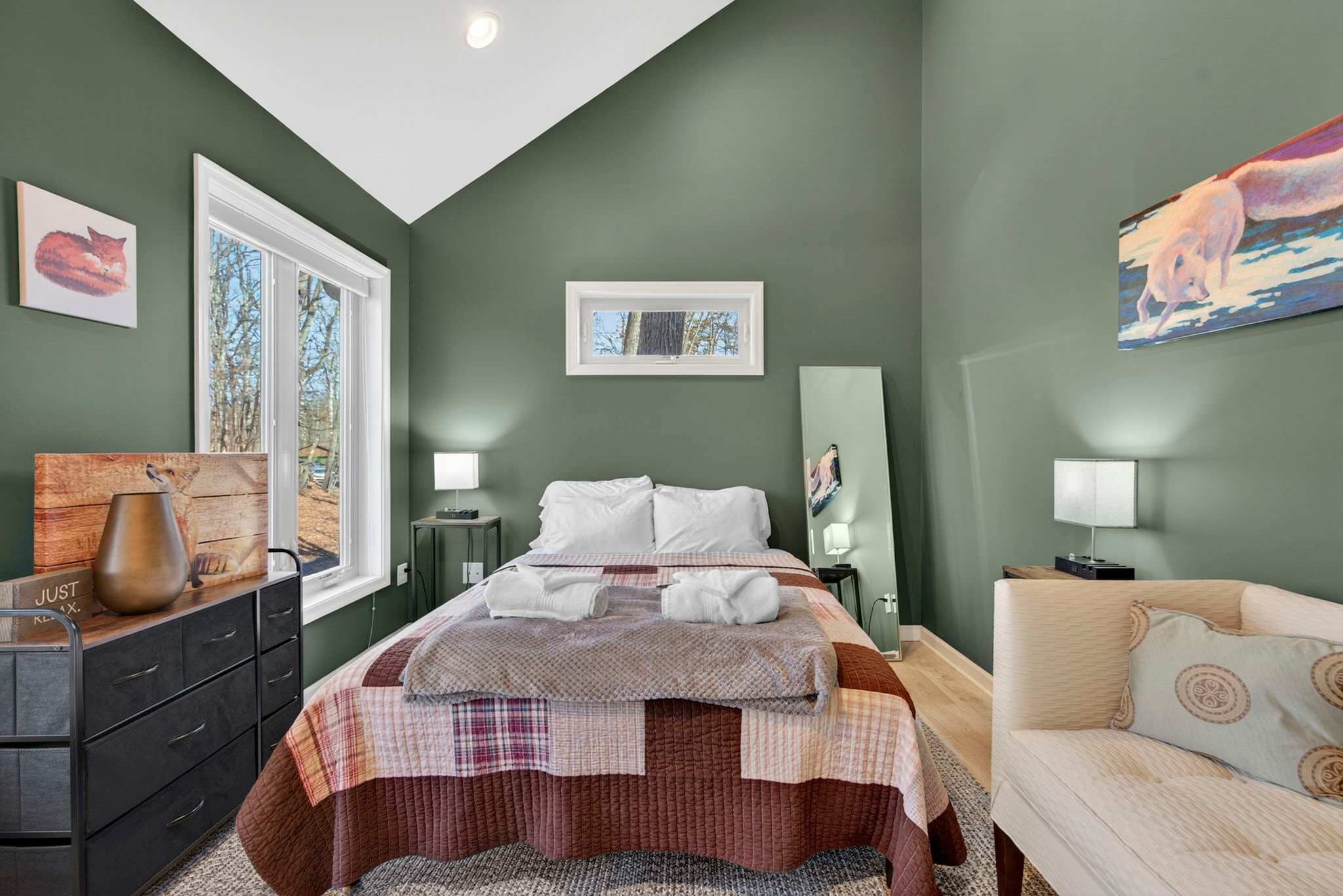 This beautiful home features an open concept living room, fully equipped kitchen and hot tub, for year ’round use. The sunroom is a stunning space surrounded by windows and has access to a screened in porch, perfect for outdoor dining or taking in the views. The large deck is furnished with a gas grill, fire pit and seating to spare – including a built in bar. Guests also have access to The Woods Resort!!