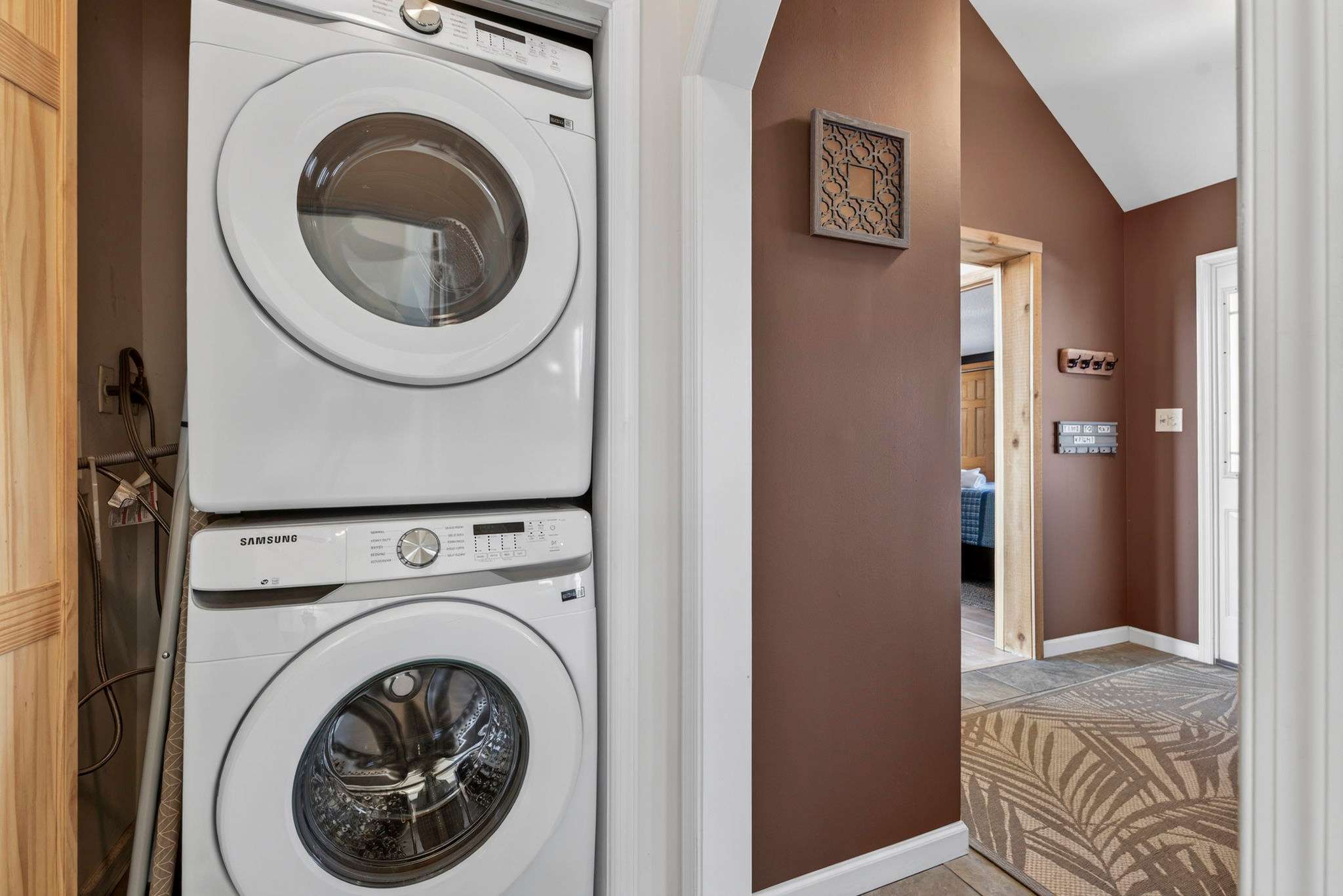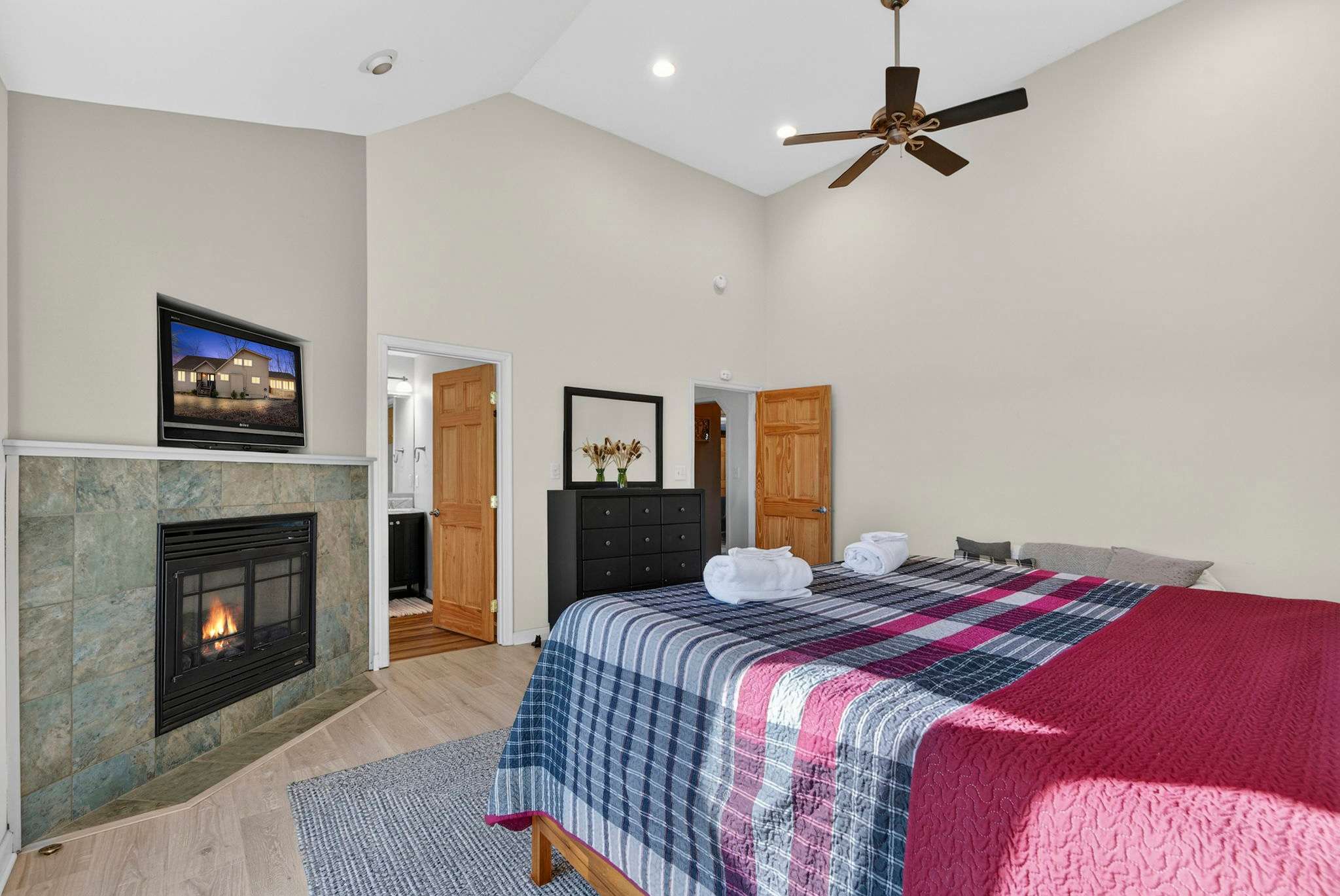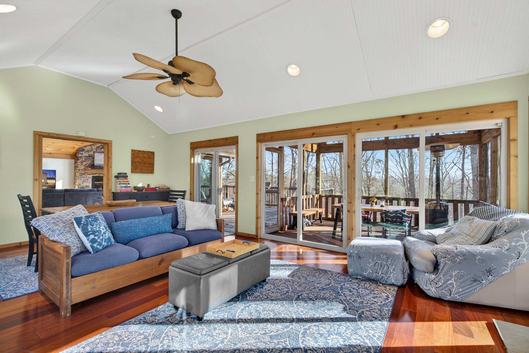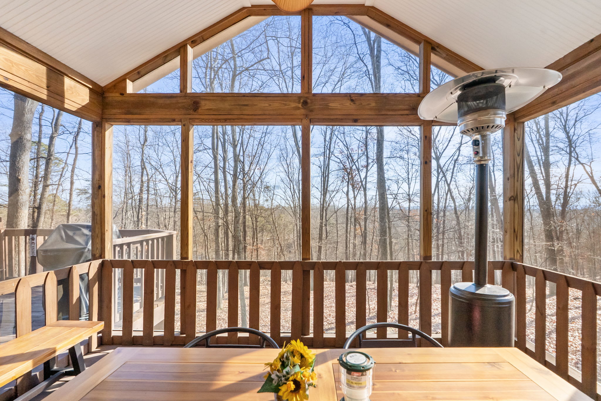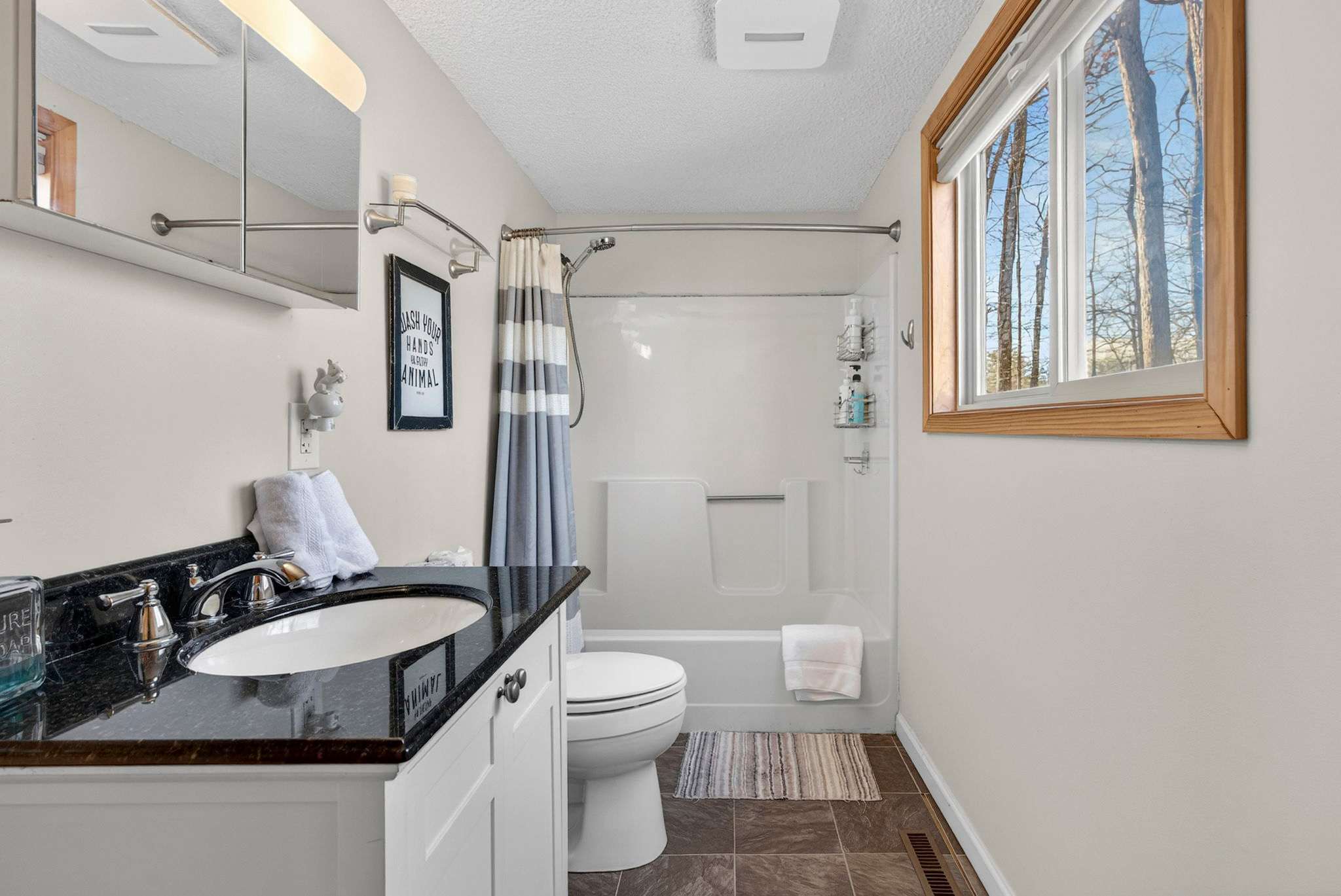 This beautiful home features an open concept living room, fully equipped kitchen and hot tub, for year ’round use. The sunroom is a stunning space surrounded by windows and has access to a screened in porch, perfect for outdoor dining or taking in the views. The large deck is furnished with a gas grill, fire pit and seating to spare – including a built in bar. Guests also have access to The Woods Resort!!