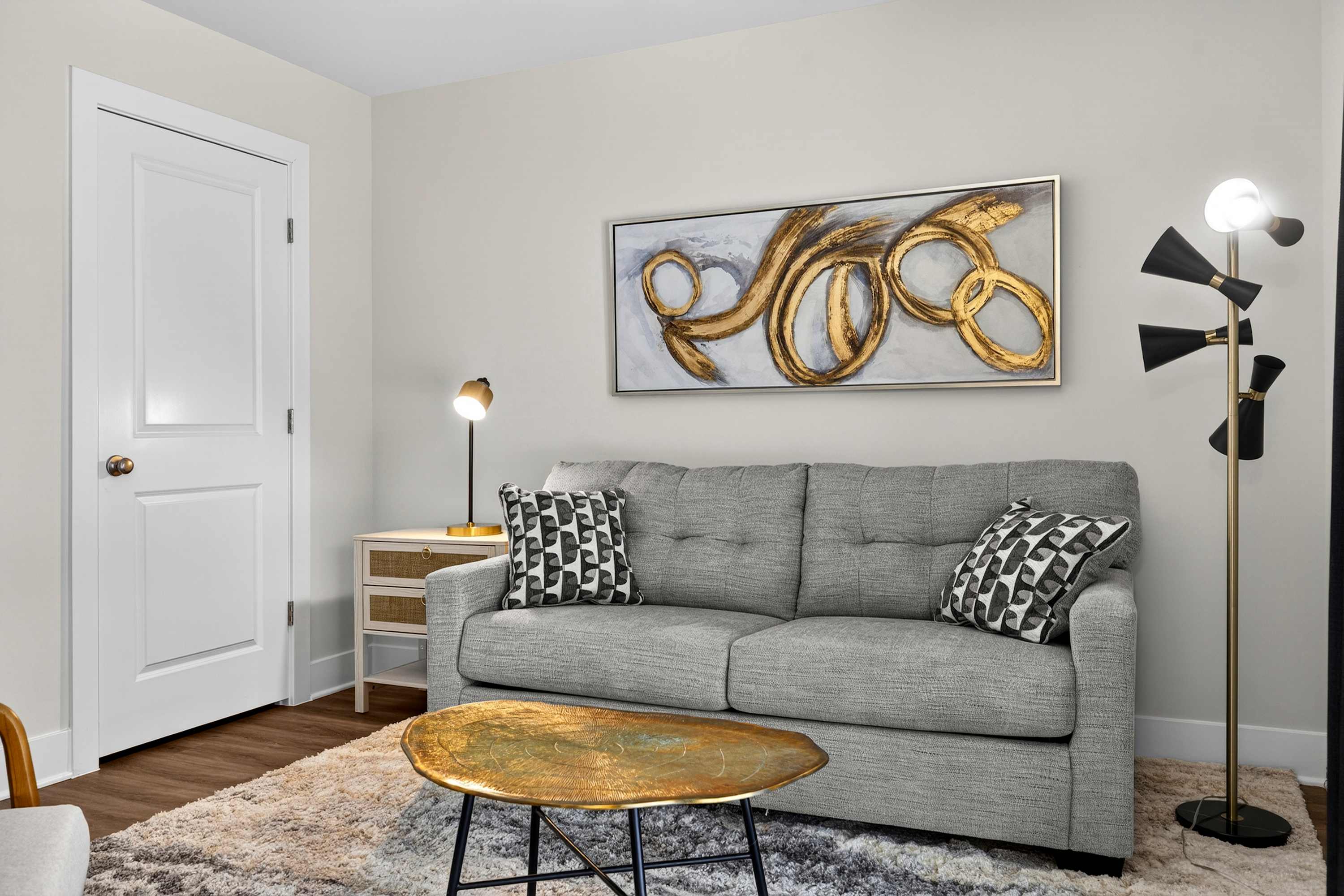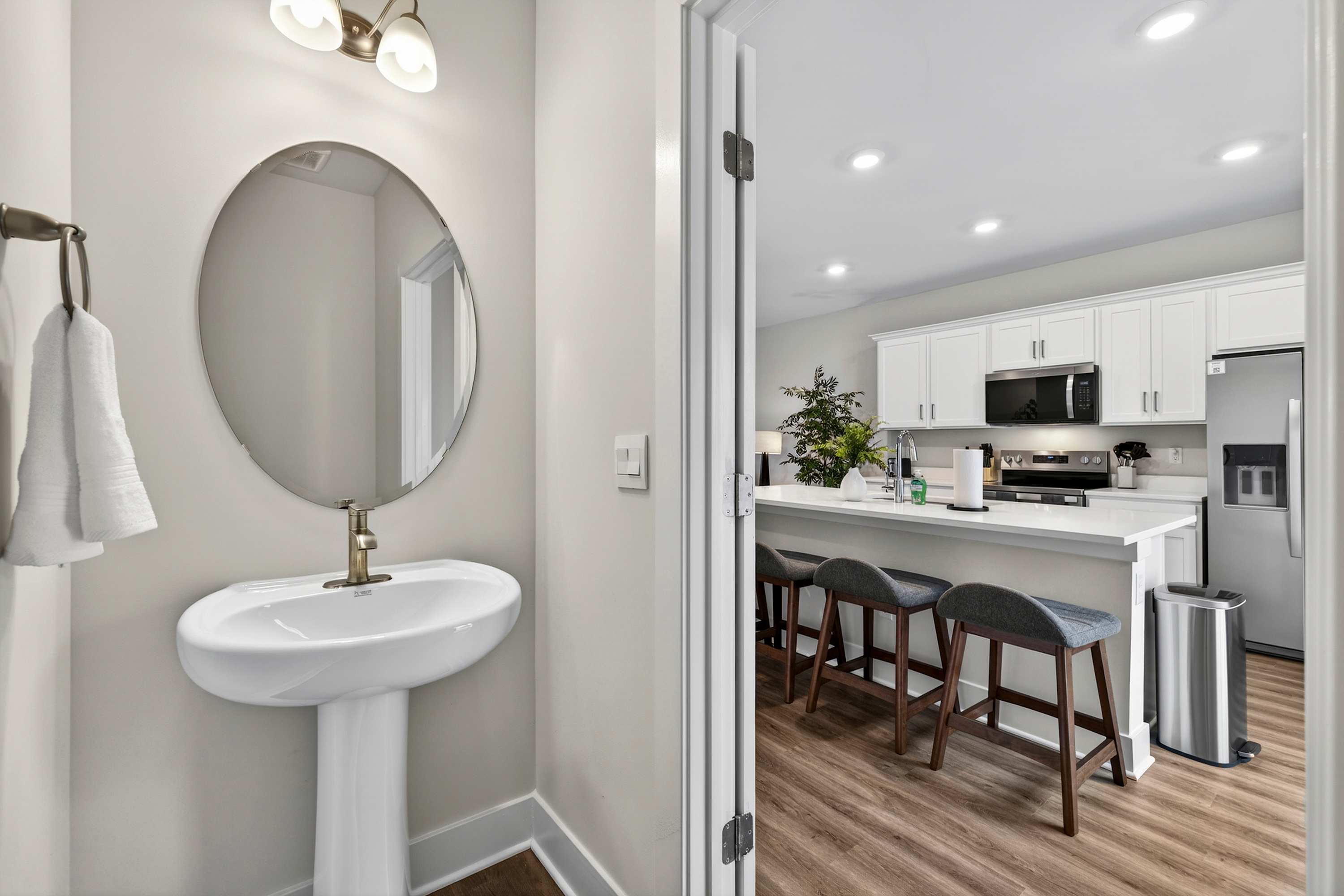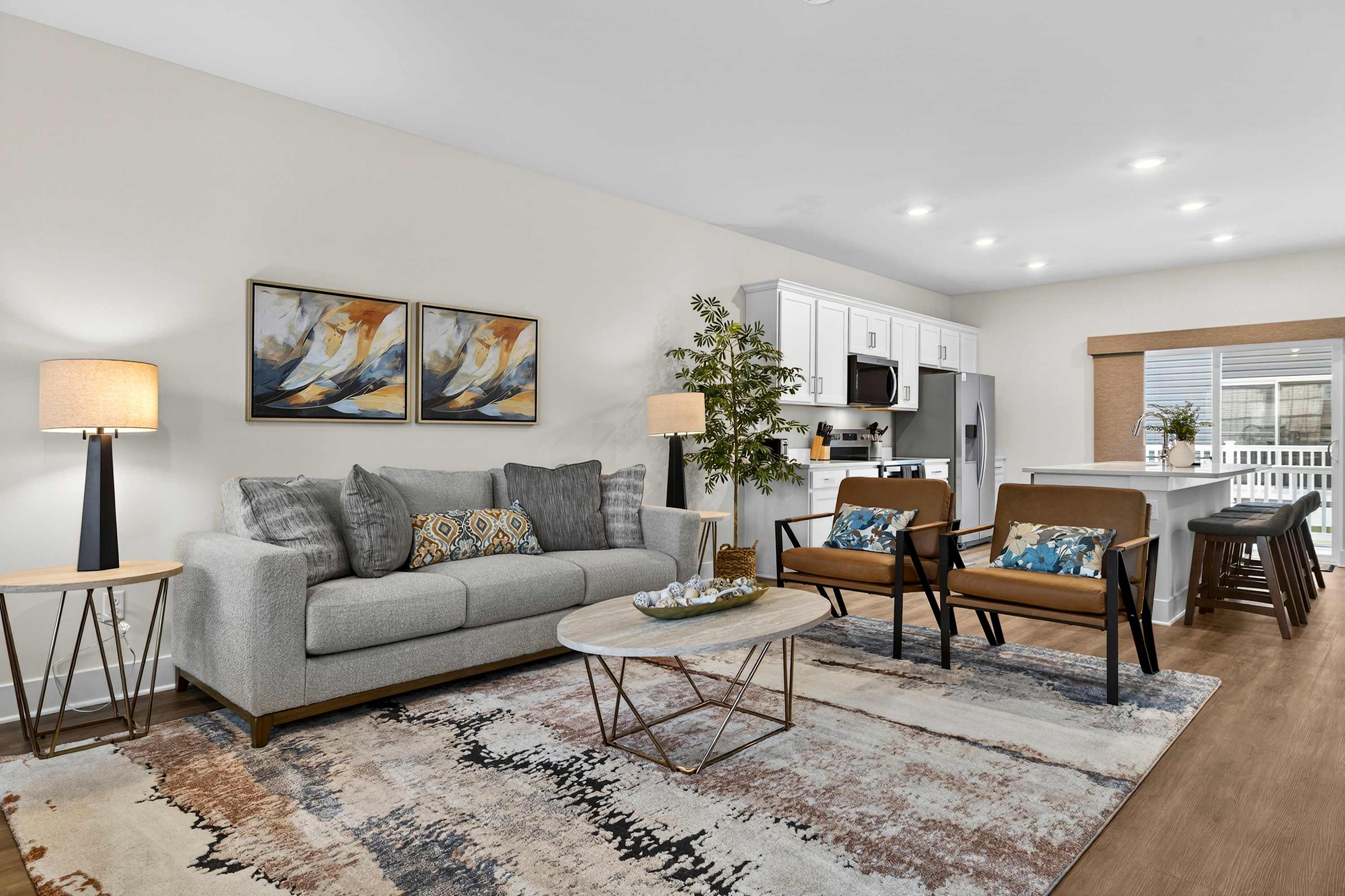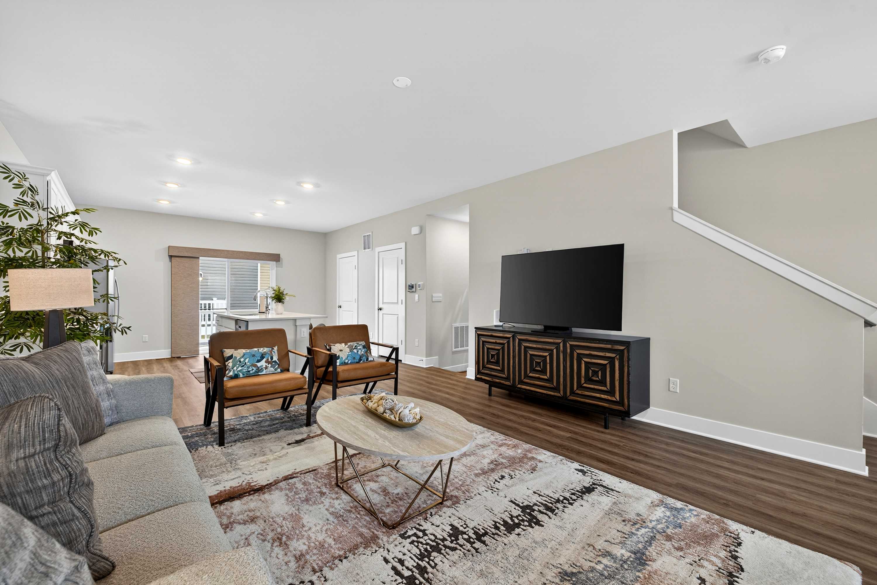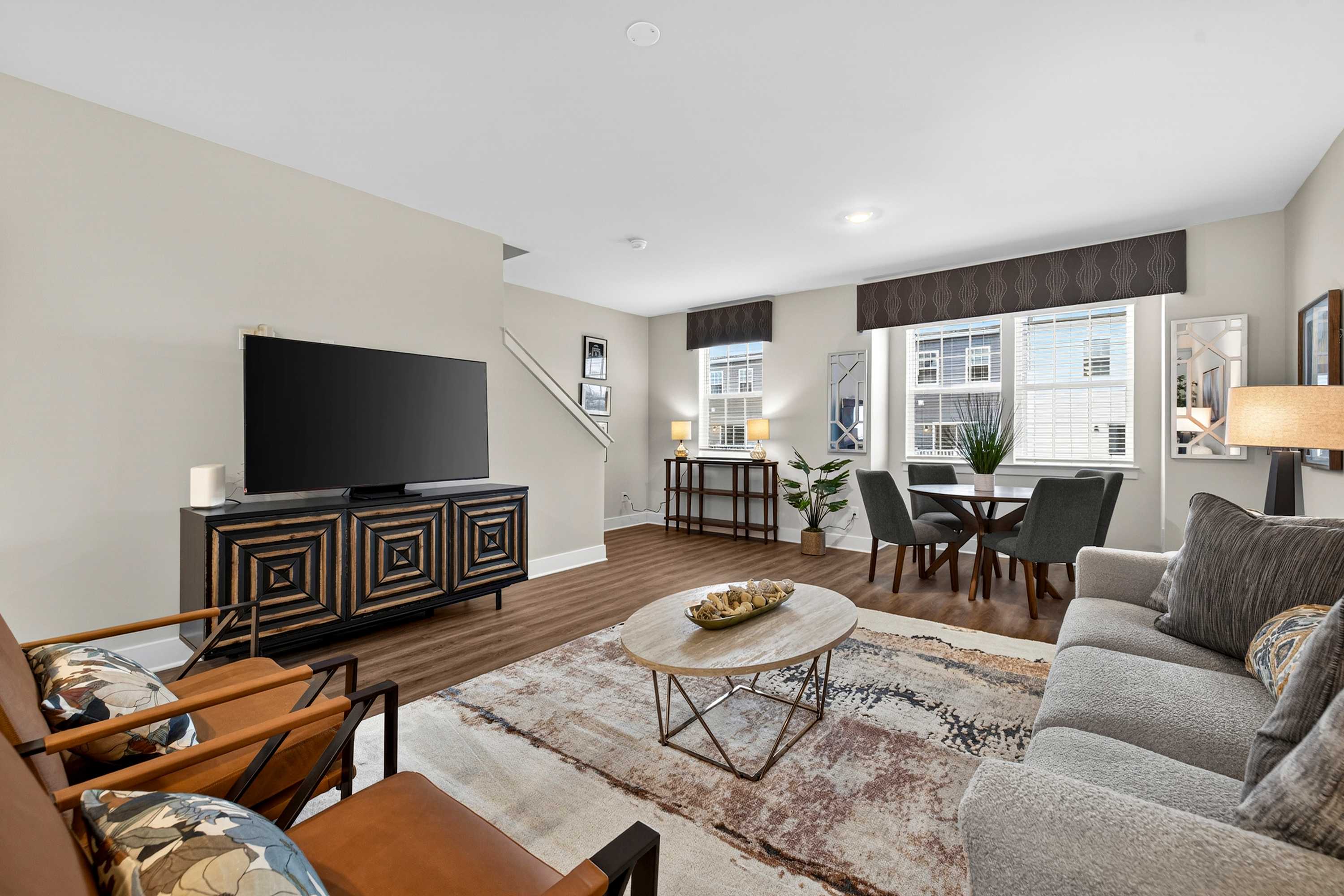 Spread across multiple levels, the townhome offers plenty of room for groups to spread out while still enjoying shared spaces together. Natural light, clean modern lines, and warm furnishings create a welcoming atmosphere throughout.