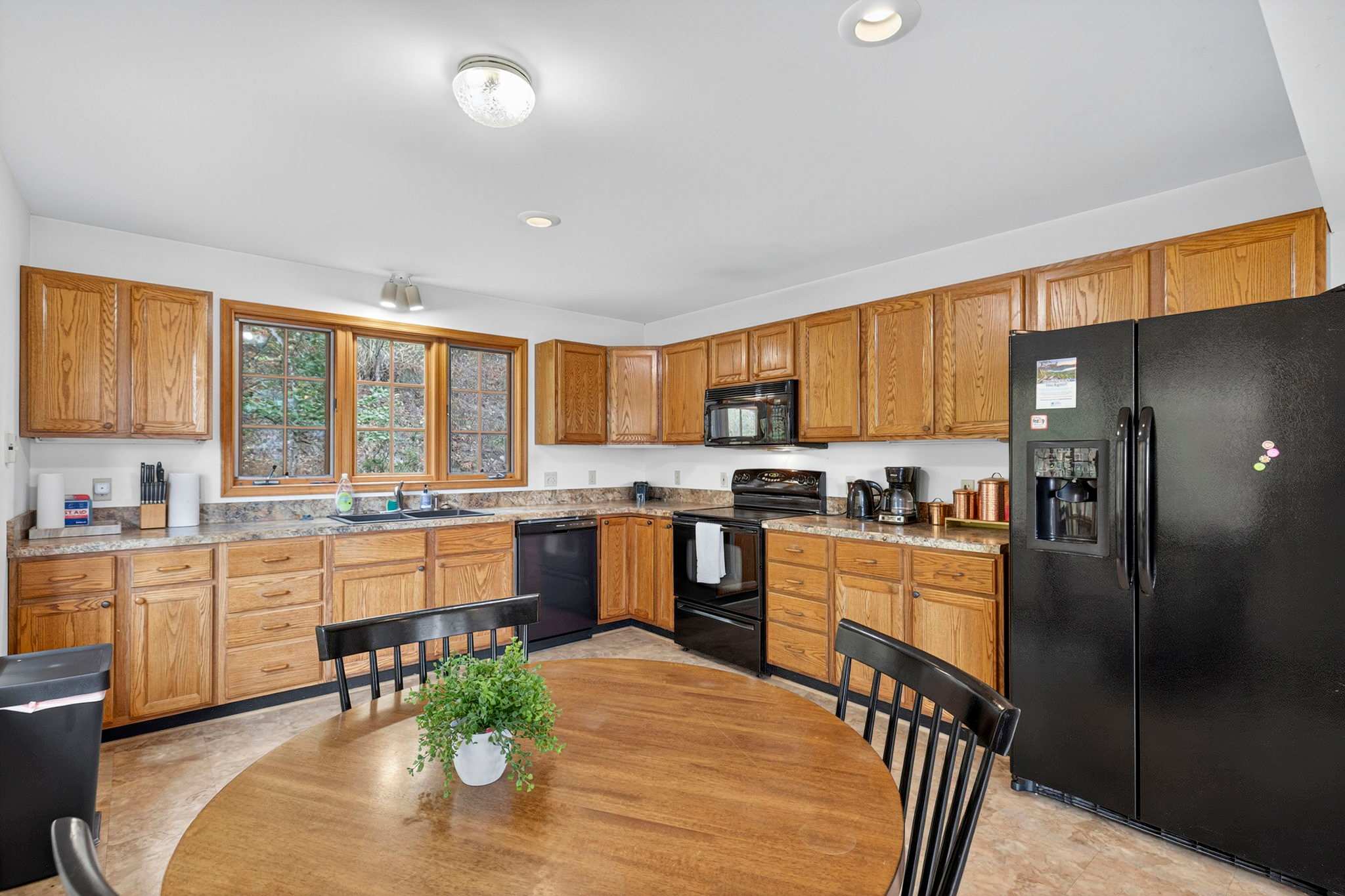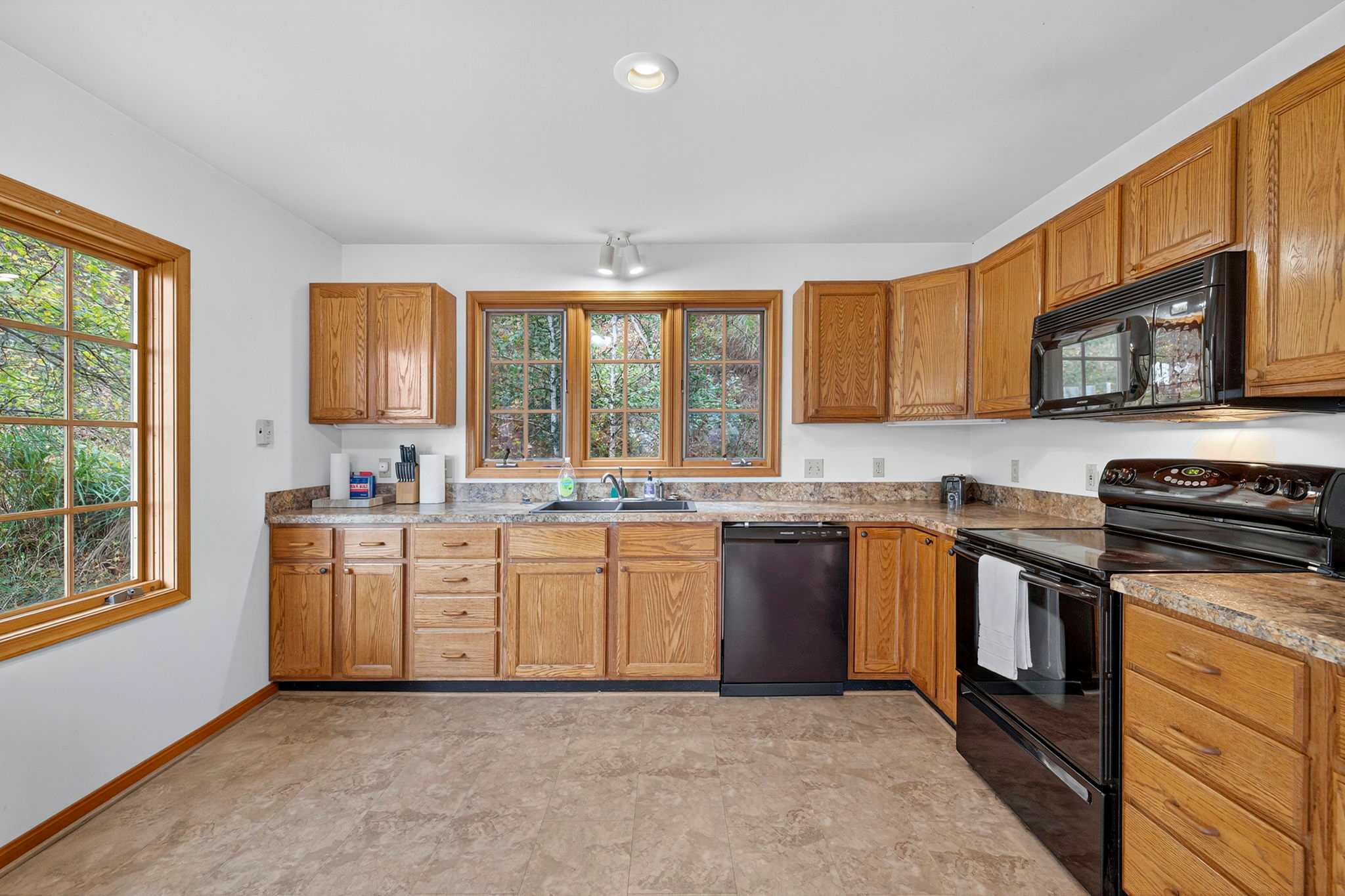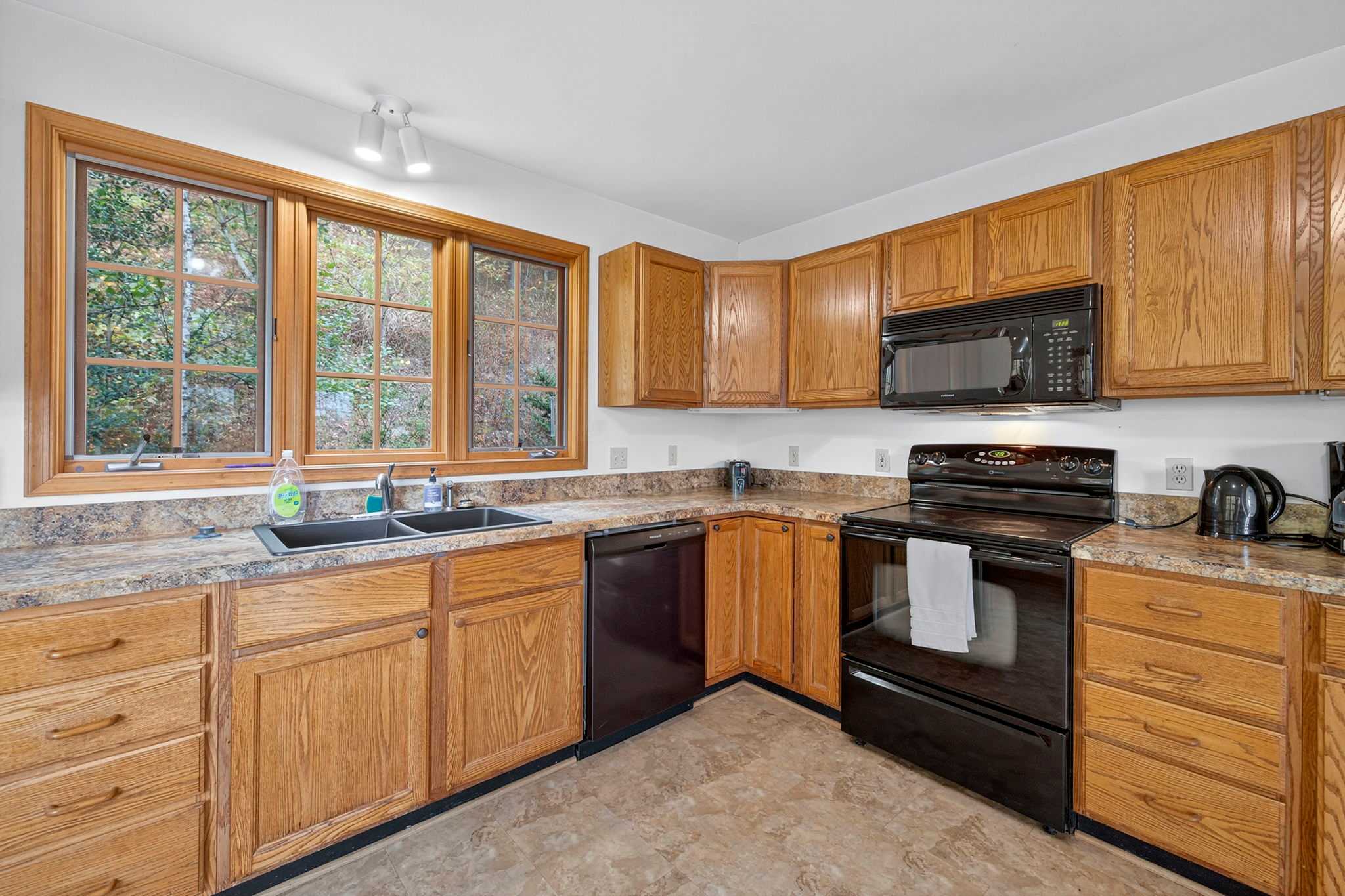 - Large, fully-stocked kitchen with a dishwasher, stove, & microwave