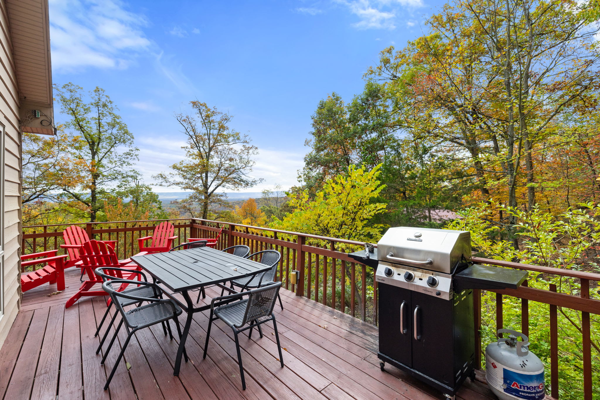 - A huge deck surrounded by trees, with a propane grill